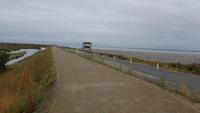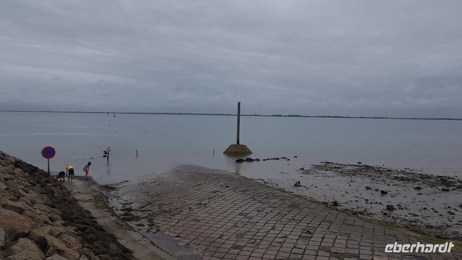 Anschließend ging es zur Passage du Gois. Als wir dort ankamen, war sie schon überflutet, so dass wir nur den Anfang der Passage und die drei Rettungsinseln sehen konnten. Die Passage du Gois ist 4.5 km lang und wird bei Hochwasser vollkommen überflutet. Ihre Fundamente wurden bereits im 18. Jahrhundert gelegt. 1924 wurde die Passage geschottert und mit drei Rettungsinseln ausgestattet und in den 30ger Jahren erhielt sie ihre Plattenbelag. Seit 1987 findet hier jedes Jahr in der zweiten Julihälfte das Wettrennen „Les Foulées du Gois" statt. Sein Höhepunkt ist der 6. und letzte Lauf, der buchstäblich ein „Rennen gegen das Meer" ist.