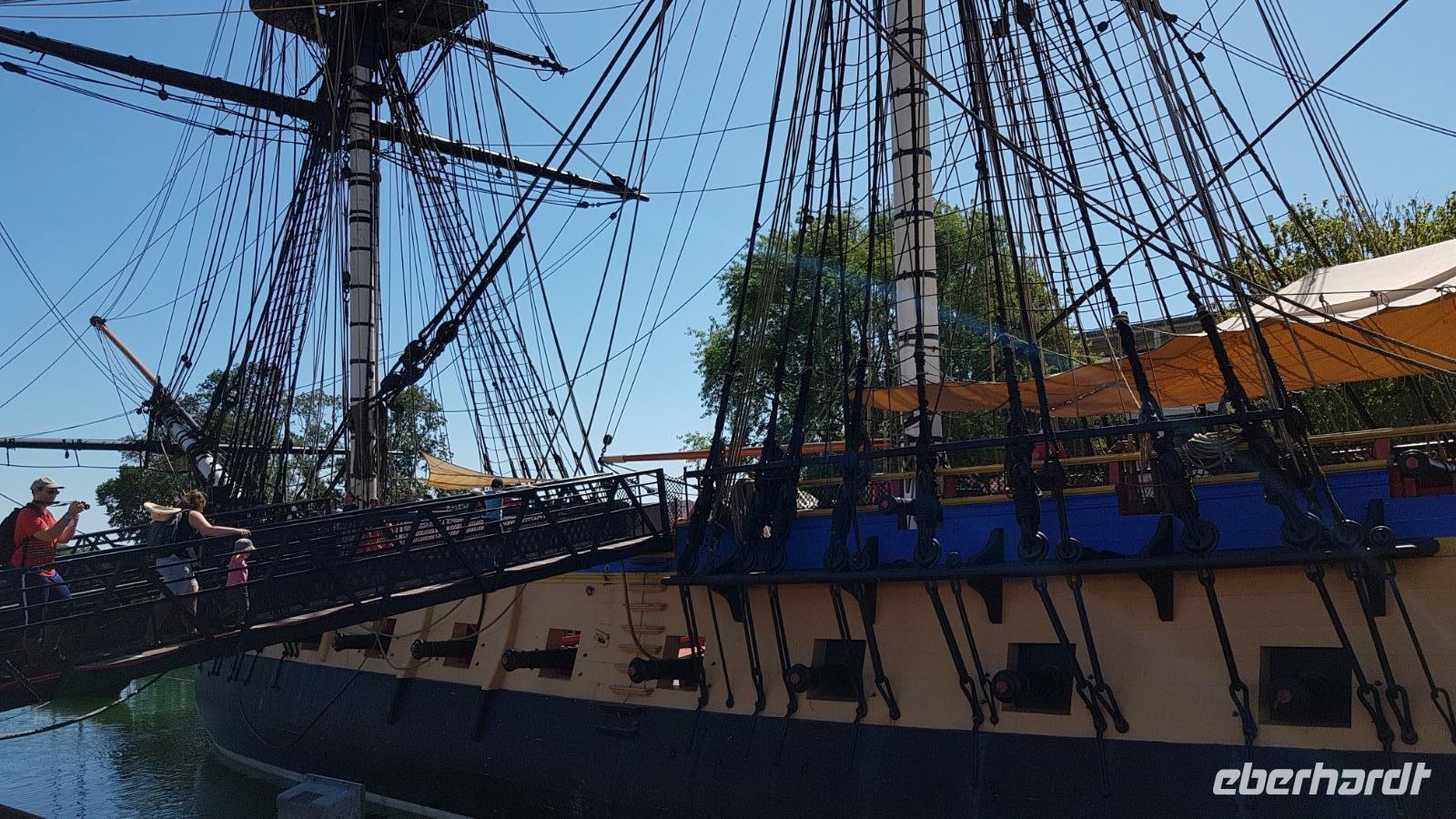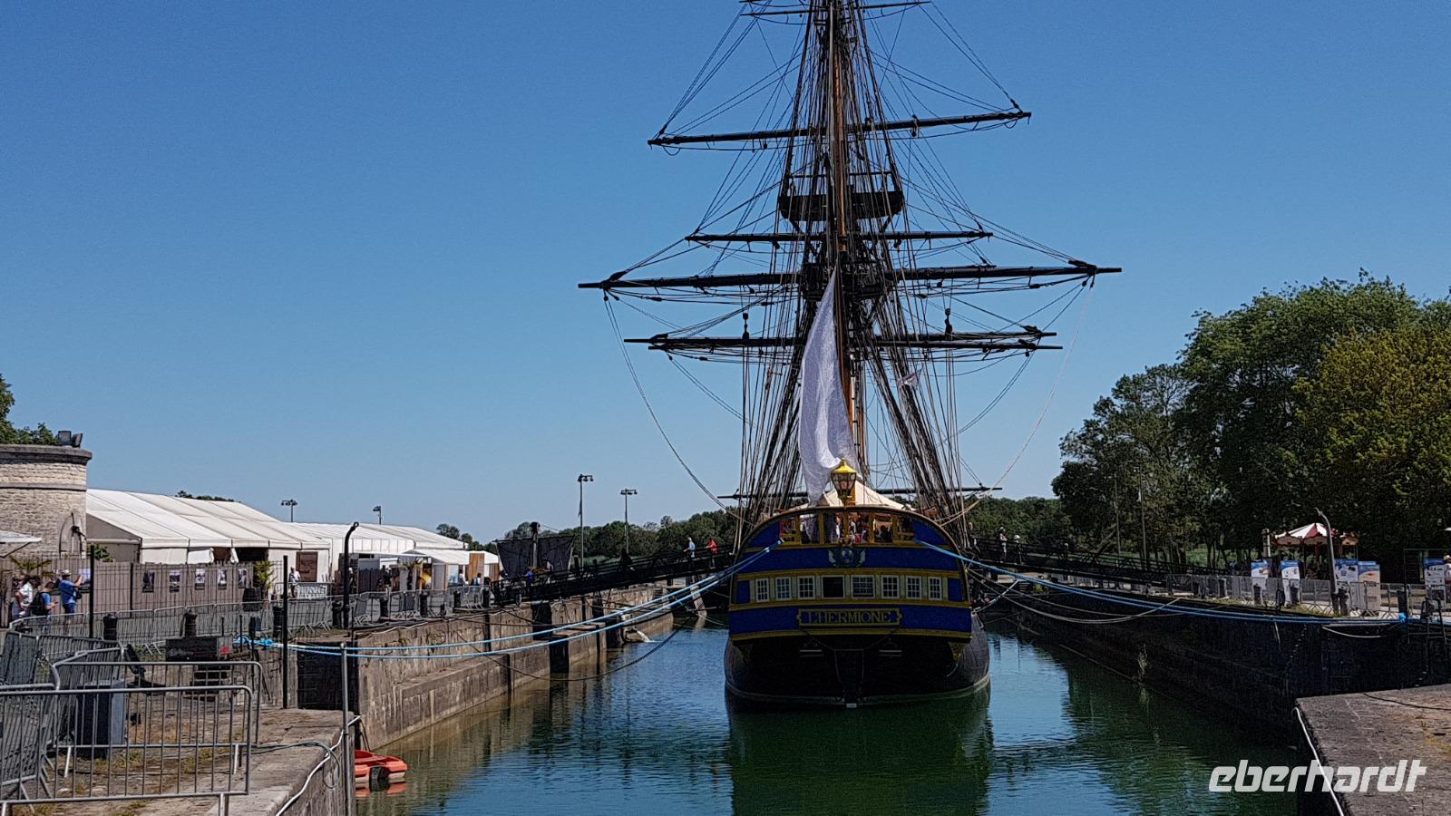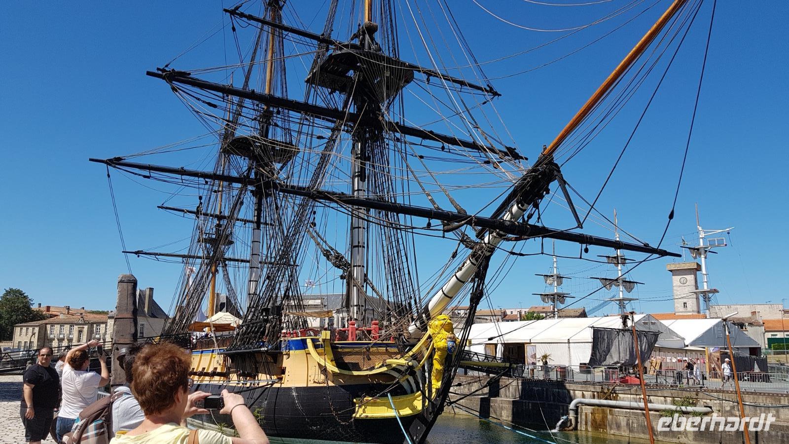 So bestens eingestimmt auf die Seefahrt der Vergangenheit besuchten wir anschließen die Fregatte „Hermione": Sie ist zwar nur ein Nachbau der nicht mehr existierenden legendären Fregatte „Hermione", mit der Marquis de Lafayette von hier nach Nordamerika aufbrach um dort den Amerikanischen Unabhängigkeitskrieg zu unterstützen, aber seetüchtig ist sie ebenfalls. Der junge Mann, der uns auf der Fregatte führt, war selbst bei einer Seereise mit diesem Schiff dabei und konnte uns sehr authentisch vom Leben an Bord eines solchen Schiffes in der Vergangenheit und Heute berichten.