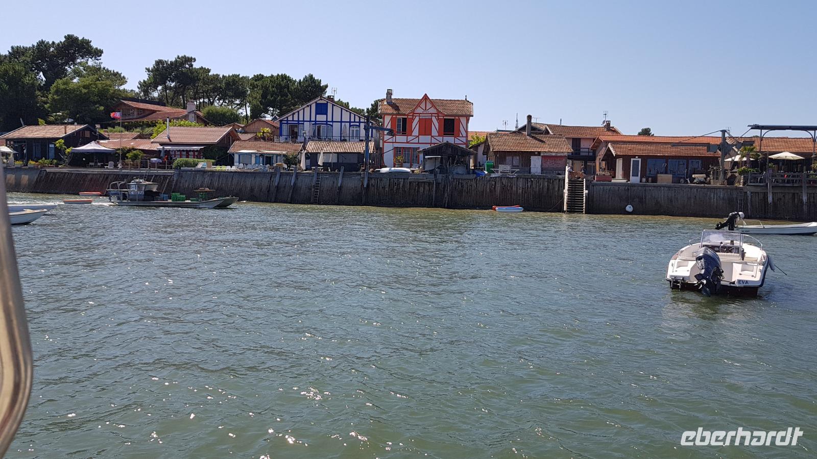 Unter dem Eindruck dieses großartigen Küstenerlebnises ging es nun in den Badeort Arcachon. Nach unserer Mittagspause begannen wir von hier aus unsere Rundfahrt im Bassin von Arcachon mit einem Boot der „Union des Bateliers Arcachonnais". Das Bassin von Arcachon ist 155 km² groß, besitzt eine etwa dreieckige Form und wird zum Atlantik hin durch die Halbinsel Cap Ferret abgeschlossen. Während unser Rundfahrt erklärte uns der Kapitän des Schiffes die Austernparks, die hier von ca. 350 Fischern bewirtschaftet werden, und die Art der hier früher eingesetzten Boote, die heute mit Motorantrieb wieder nachgebaut werden. Die Holzpfähle, die die Gebiete der Austernparks abgrenzen, dienten früher der Pfahlmuschelzucht. An der Küste des Cap Ferret sahen wir traumhafte Ferienhäuser in idyllischen Grundstücken. Dazu gehörte auch eine Kapelle, die im 19. Jahrhundert von dem damaligen Besitzer des Grundstückes, einem lange Jahr in Algerien und Marokko tätigen Kaufmann, im maurischen Stiel errichtet wurde und die im Gegensatz zu seiner Villa bis heute erhalten blieb. Dann plötzlich sah unser Kapitän in der Nähe unseres Schiffes drei junge Leute, deren Segelboot gerade umkippte. Er steuerte sein Boot sofort in die Nähe der Unglücksstelle, um die drei Schiffbrüchigen aufzunehmen und zum nächsten Anlegesteg zu bringen. Während sich andere inzwischen herbeigekommene Schiffe um die Bergung des umgekippten Segelbootes kümmerten, warfen wir noch mal eine Blick zur Düne du Pilat, bevor wir zum Anlegesteg von Arcachon zurückkehrten.