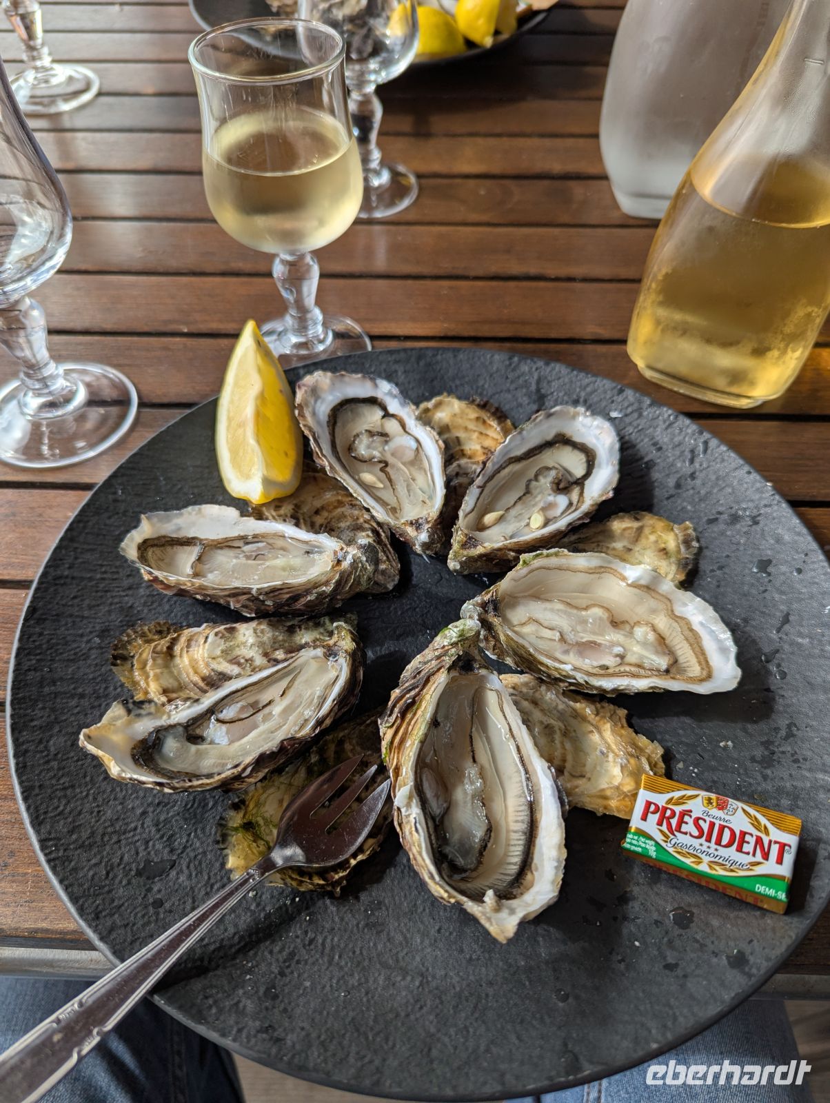 Heute standen die Île d’Oléron und ihre unterschiedlichen Facetten auf dem Programm. Zunächst ging es zu einer Austernzucht-Station, bei der wir nicht nur eine ganze Menge über die Entwicklung von Austern lernten, sondern auch, wie man diese fachmännisch öffnet und anschließend stilecht genießt. Am Ende durfte natürlich eine liebevoll hergerichtete Verkostung inklusive Wein und Baguette nicht fehlen. Nach einem kurzen Spaziergang entlang der farbenfrohen Hütten am Hafen von Le Chateau d’Oléron steuerten wir den Hafen von Boyardville an, wo unsere einstündige Bootsfahrt zur Meeresfestung Fort Boyard und zur Insel d’Aix begann- bei herrlichem Wetter ein fantastisches Erlebnis! Ein Fotostopp bei der „Lanterne des Morts“, einer Totenlanterne aus dem 12. Jahrhundert, deren brennende Flamme die Unsterblichkeit der Seele symbolisierte und ein Spaziergang rund um den Leuchtturm „Phare de Chassiron“ am Nordkap der Insel rundeten unseren Besuch auf der Île d’Oléron ab. Zum Abendessen ging es heute in eine kleine Bar in Hafennähe, die sich auf kleine Fisch- und Meeresfrüchte-Tapas spezialisiert hat. Mit 9 Gästen genossen wir die kulinarische Vielfalt und die großartigen Weine der Charente. Besser hätte unser Aufenthalt in La Rochelle nicht enden können.