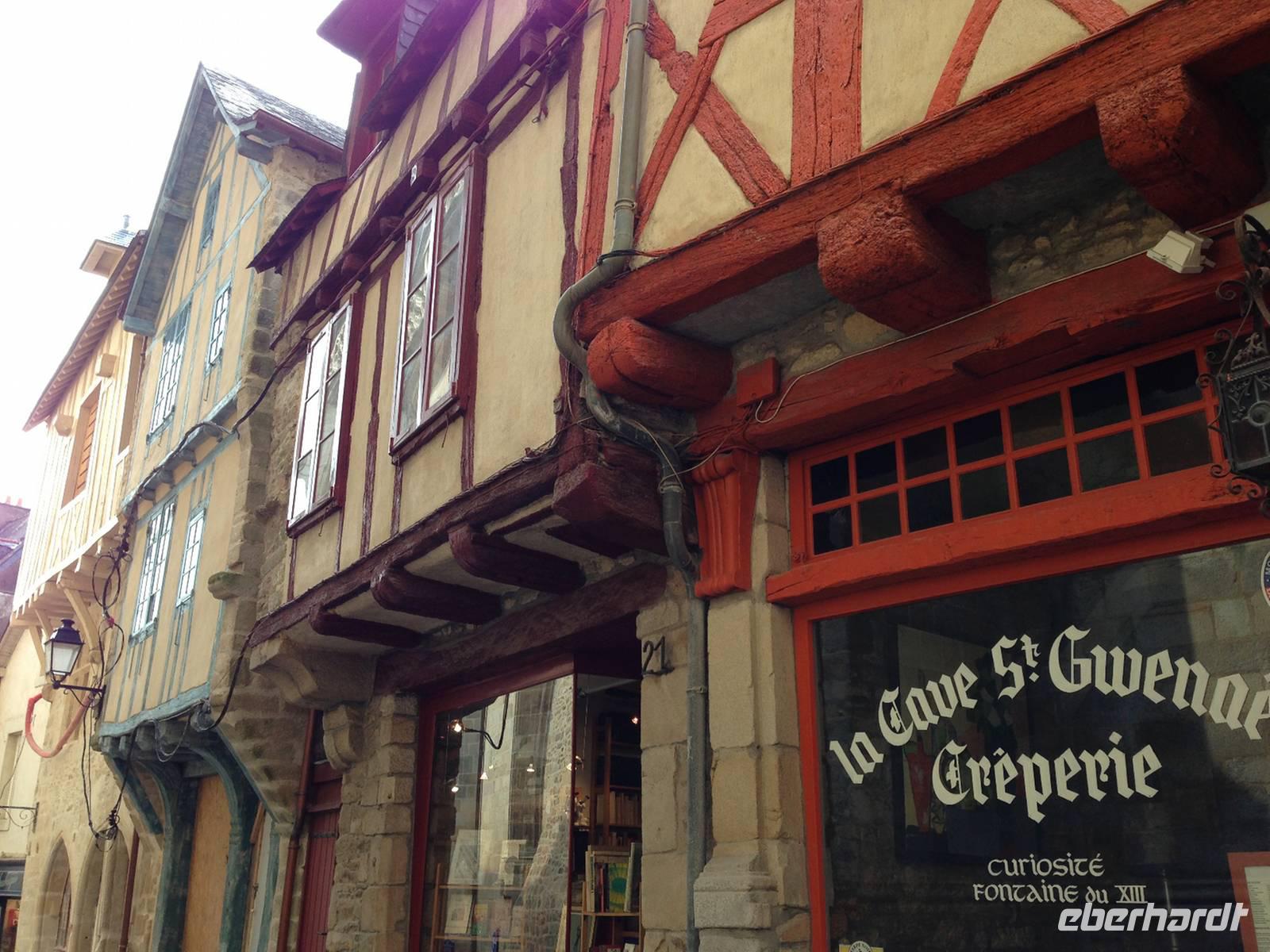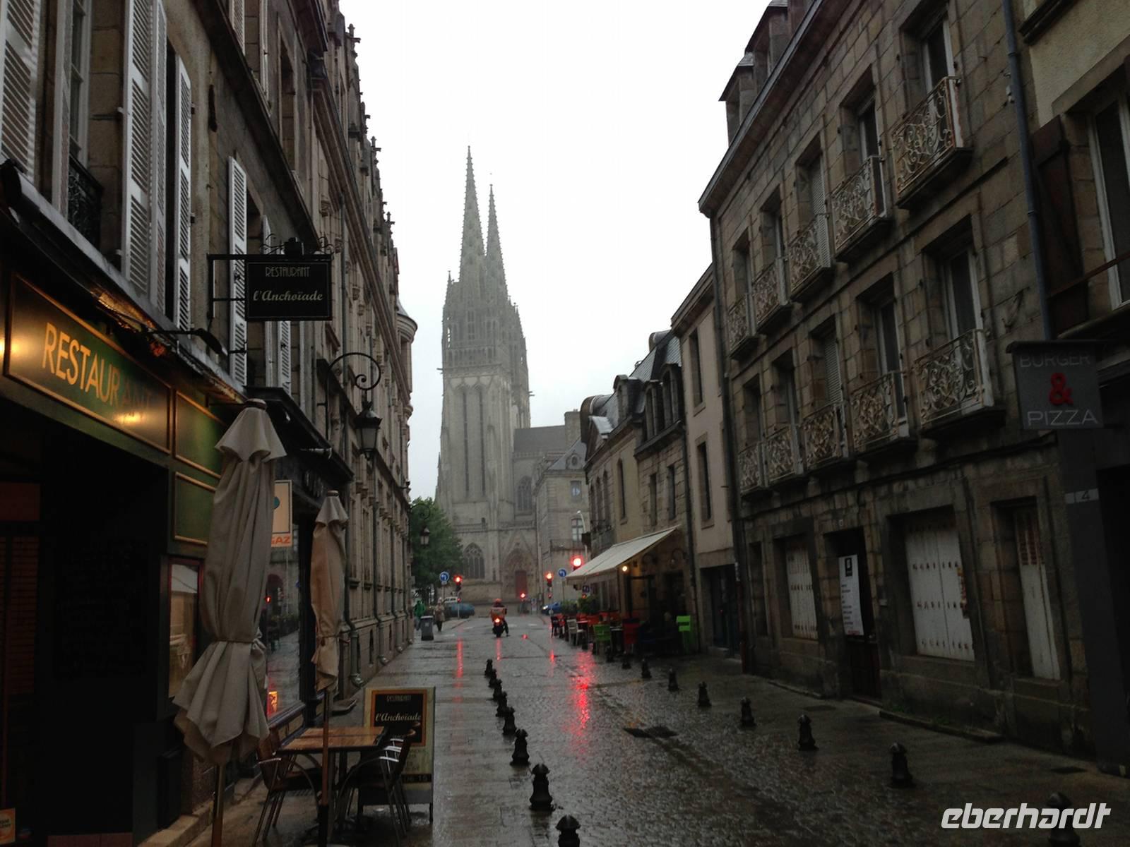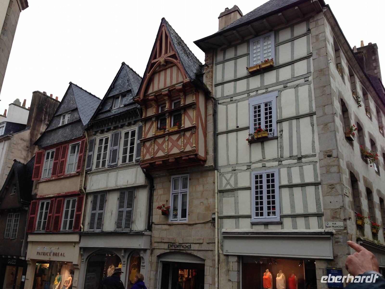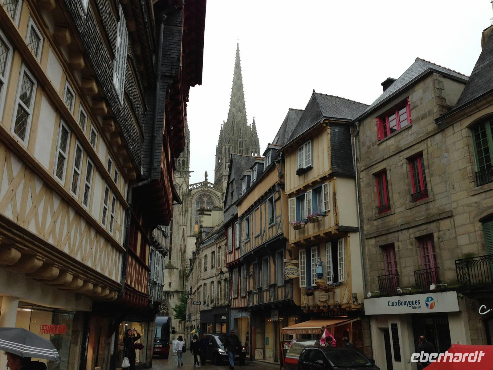 Für die Stadtführung in Quimper brauchen wir zwar ab und zu einen Regenschirm, trotzdem gefällt uns das historische Zentrum mit den schiefen Fachwerkhäusern. Die älteren ragen mit ihren Obergeschossen weit in den Straßenraum und boten im Mittelalter den offenen Läden im Erdgeschoss einen gewissen Wetterschutz. In der Kathedrale Saint-Corentin sehen wir die Glasfenster, welche die Legende vom Heiligen Corentin erzählen: Täglich schnitt sich der Einsiedler von einem Fisch ein Stück ab und warf ihn ins Wasser zurück. Am nächsten Tag war das fehlende Stück wieder nachgewachsen und Corentin konnte sich so täglich von einem einzigen Fisch ernähren. Es heißt, dass 7777 Heilige in der Bretagne verehrt werden und zu jedem Heiligen gibt es Dutzende von Legenden!