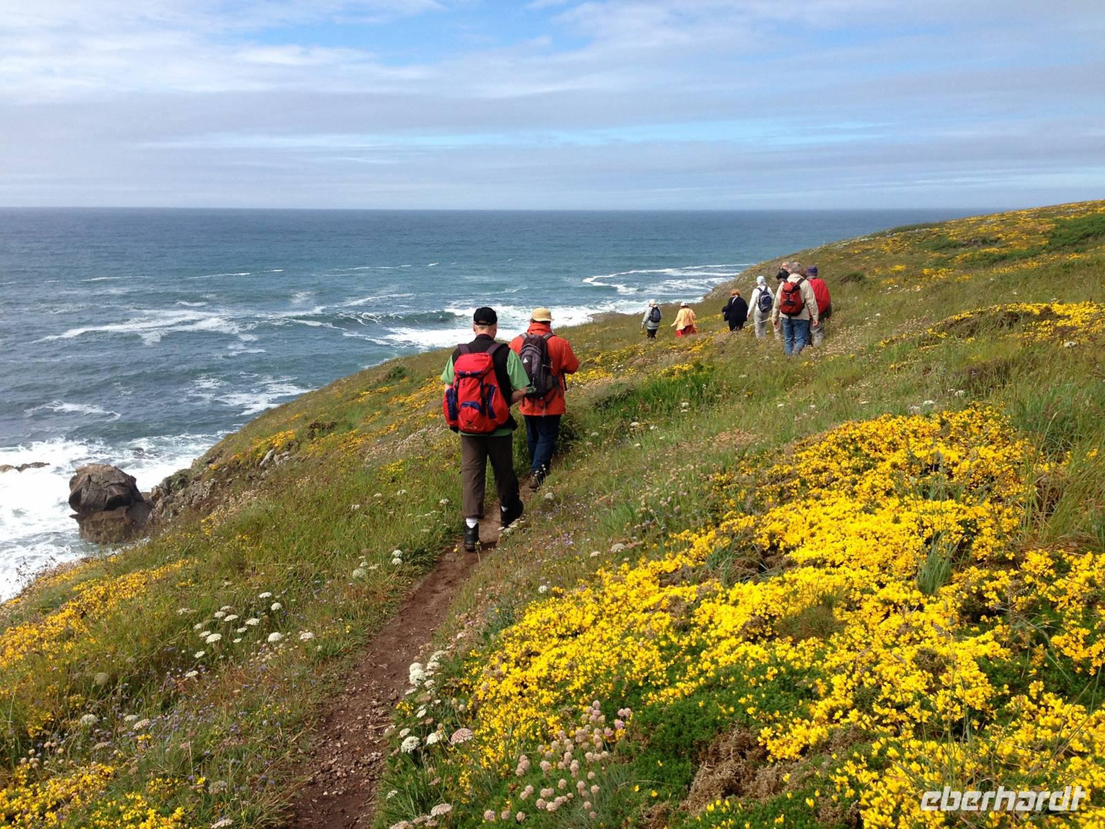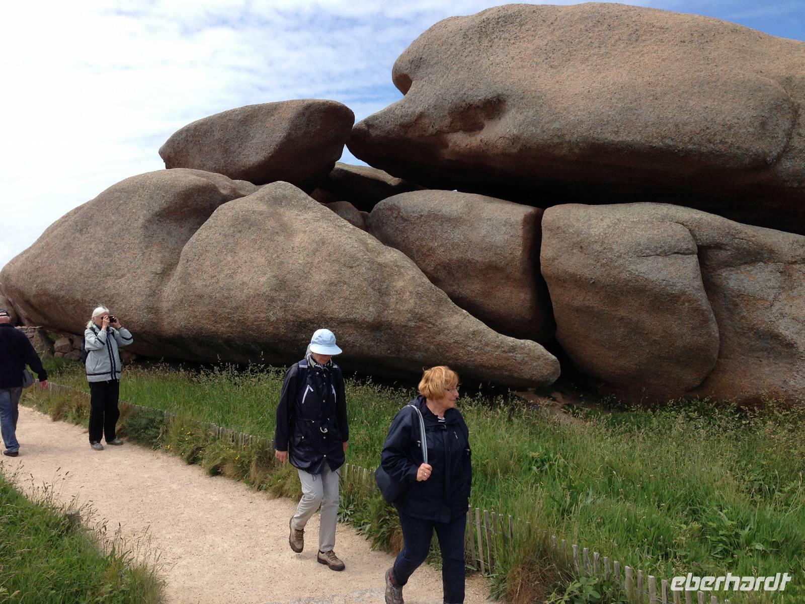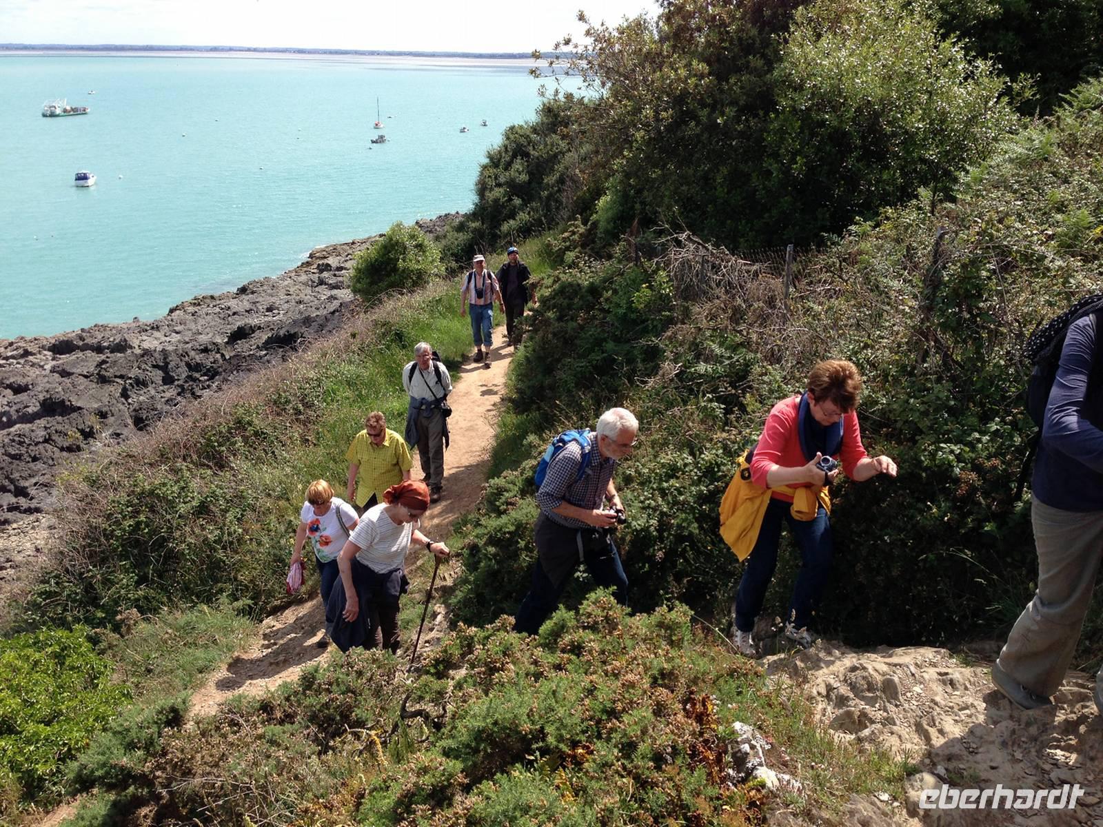 Mittlerweile zeigt uns sich die Bretagne von ihrer sonnigen Seite und auf der anschließenden Wanderung kommen wir schon etwas ins Schwitzen. Vor allem die Reiseleiterin auf der Suche nach drei verlorenen Schäfchen, die trotz längeren Wartens nicht zur Gruppe aufschließen. Wo der heimliche Überholprozess stattgefunden hat ist noch zu klären - denn lange vor der restlichen Gruppe waren die „Überholer" am Bus angelangt ... kein Wunder, hatten sie sich doch die ganze Zeit beeilt um die vermeintlich vor ihnen Gehenden einzuholen!