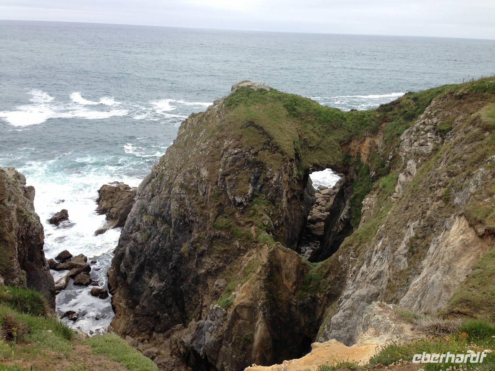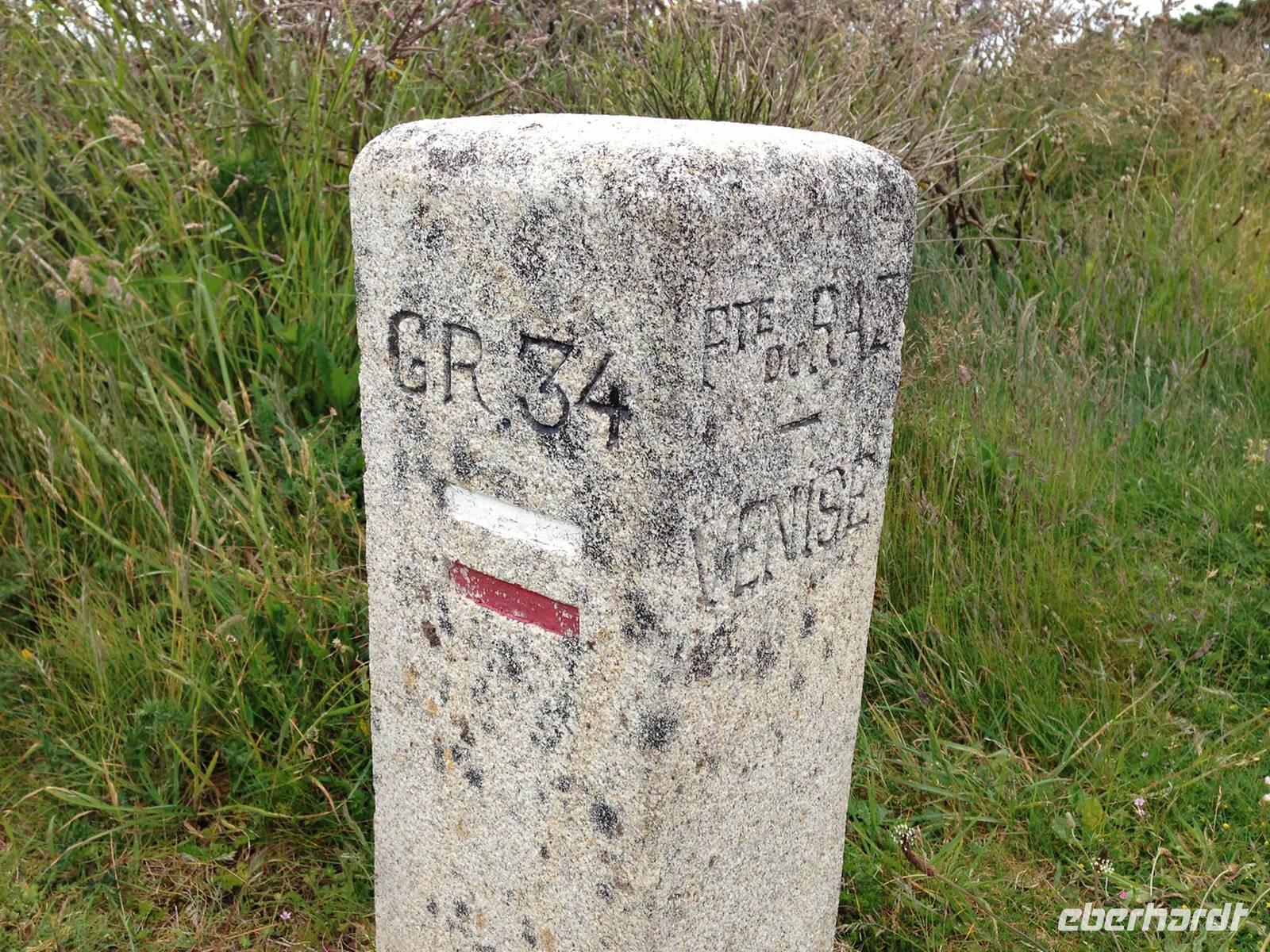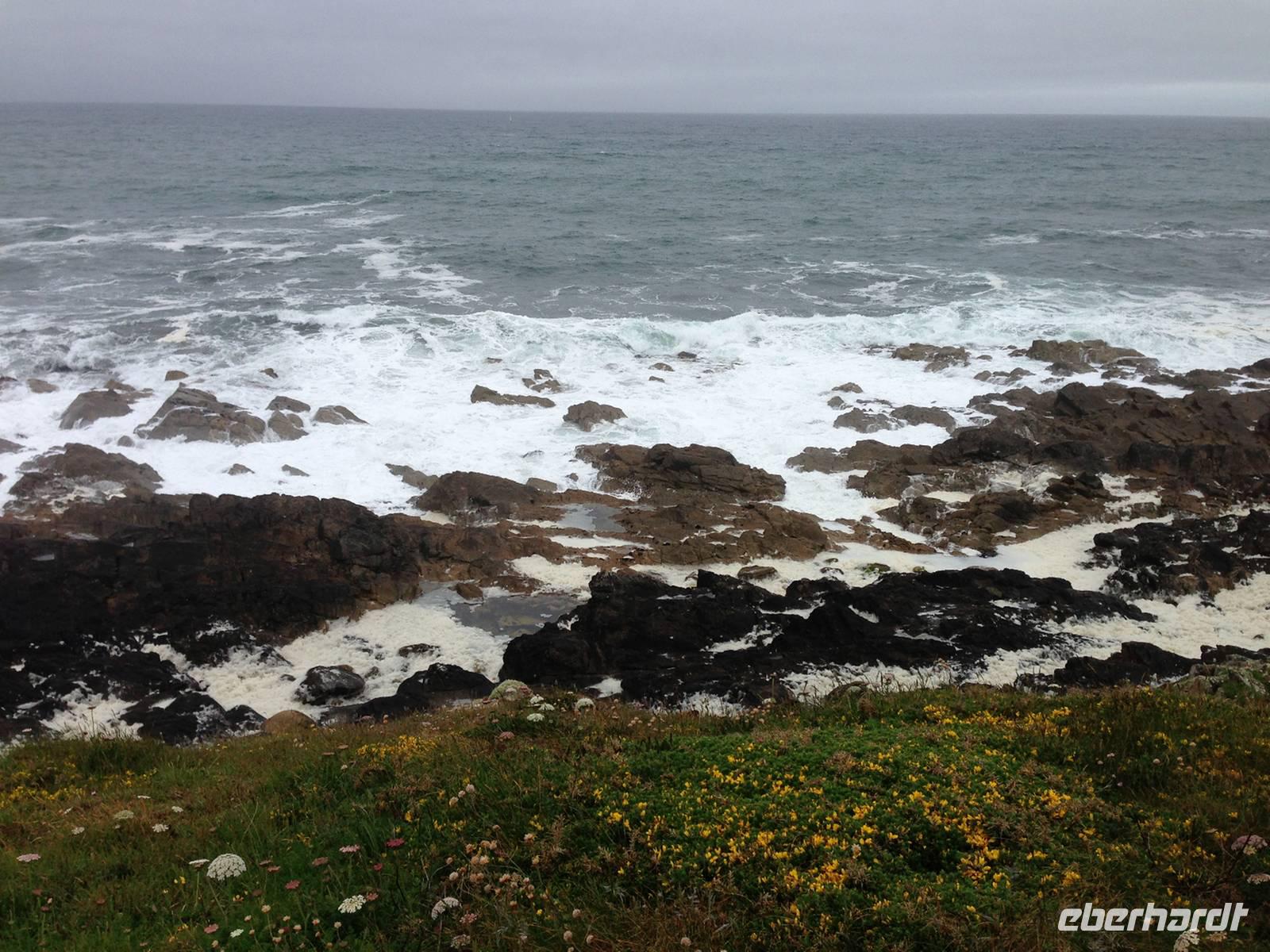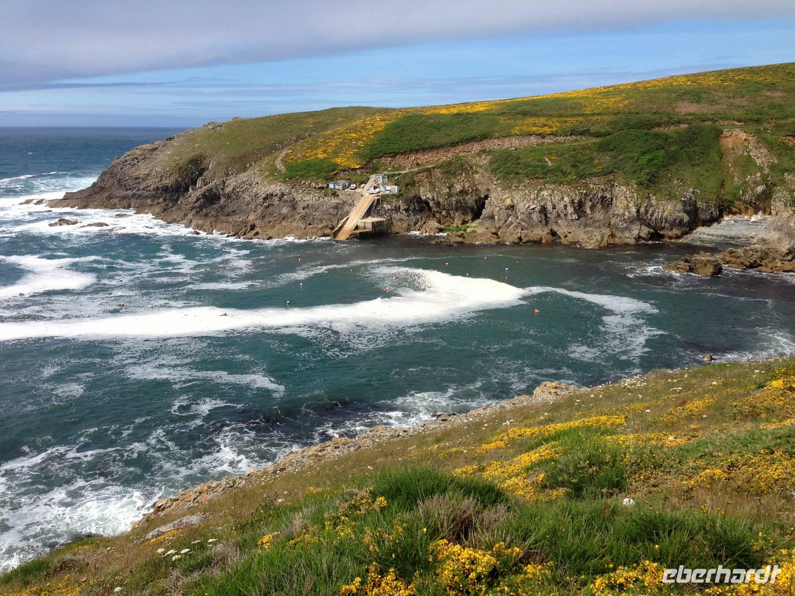 Bei der Kapelle Notre Dame de Bon Voyage beginnt unsere 13-Kilometer-Wanderung zur Pointe du Raz. Zunächst auf von blühendem Ginster gesäumten Wegen, dann immer entlang der schroffen Küste mit der heute sehr wilden See. Das Wetter wird mit jedem Meter besser, die Mittagsrast verbringen wir bei Sonnenschein und die durch das hohe Gras bis zur Hüfte nassen Hosenbeine der beiden tapferen Vorhut-Damen trocknen schnell. An der Landspitze angekommen, befinden wir uns am westlichsten Punkt nicht nur der Festland-Bretagne sondern auch von Mitteleuropa. Hier wurde bis ins 16. Jahrhundert das Ende der Welt vermutet und der lateinische Name Finis Terrae stand Pate für das heutige Bezeichnung Finistère.