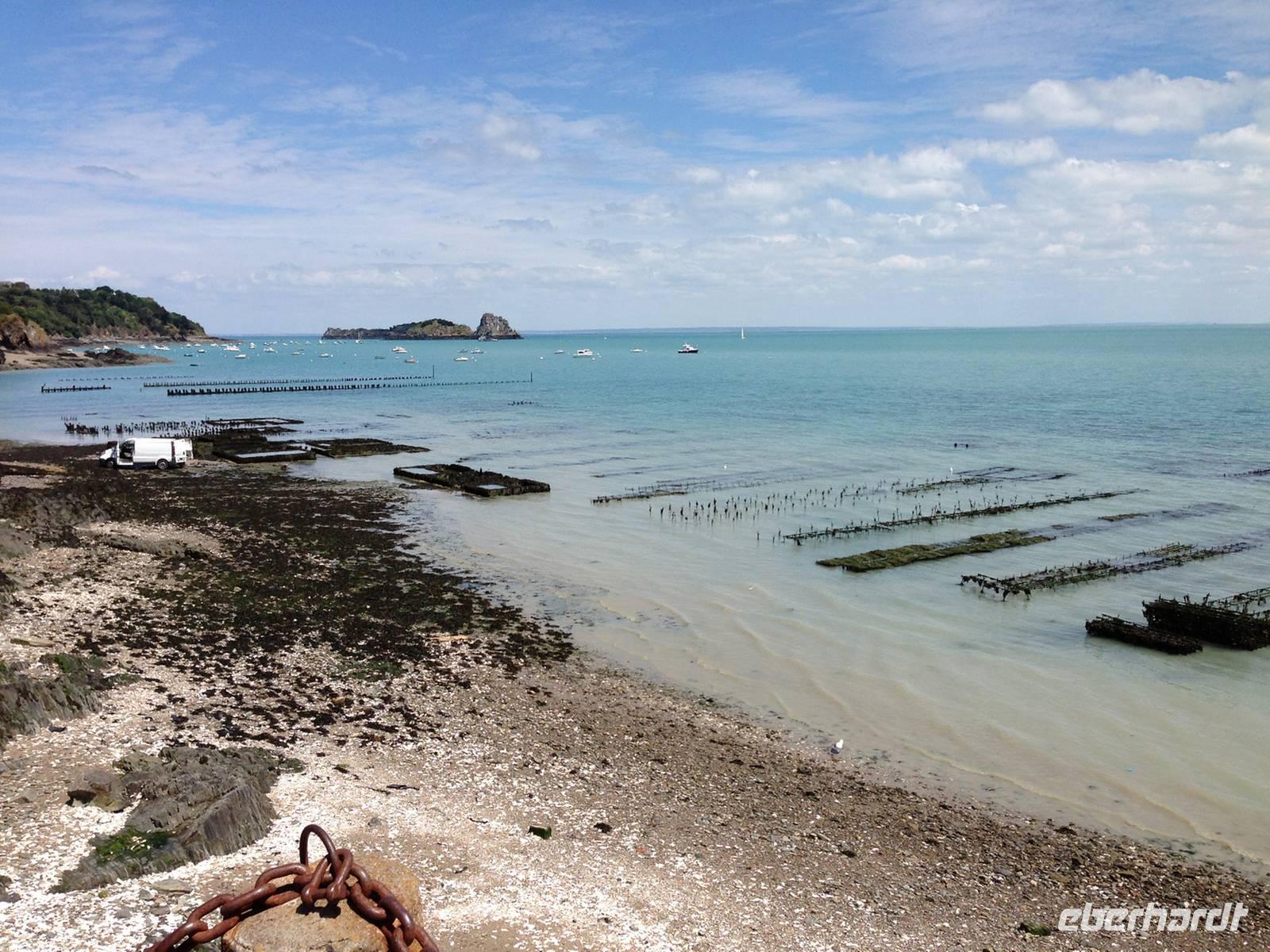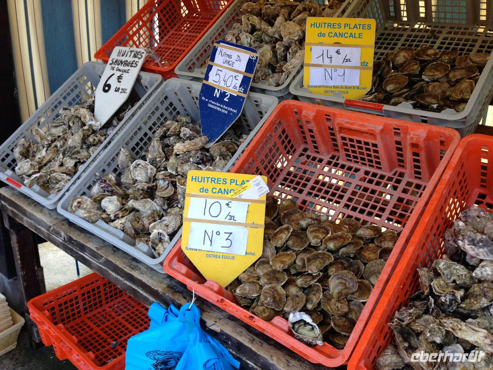 Die Rückfahrt nach Cancale erfolgt durch die Polder und weit draußen in der Bucht kann man die Austernbänke erkennen. Am Markt von Cancale erstehen wir einige Teller Austern, die von der Marktfrau vor unseren Augen geöffnet werden. Frische ist das oberste Gebot bei dieser Delikatesse. Geöffnet müssen sie sofort verspeist werden, im geschlossenen Zustand leben sie etwa zwei Wochen außerhalb des Meeres weiter, solange Sie nicht austrocknen. Das heißt, sie müssen mit der gewölbten Seite nach unten kühl und dunkel gelagert werden, am besten abgedeckt mit einem feuchten Tuch. Nicht alle Wanderfreunde, jedoch sogar einige der Skeptiker probieren die nach Meer schmeckende Köstlichkeit.