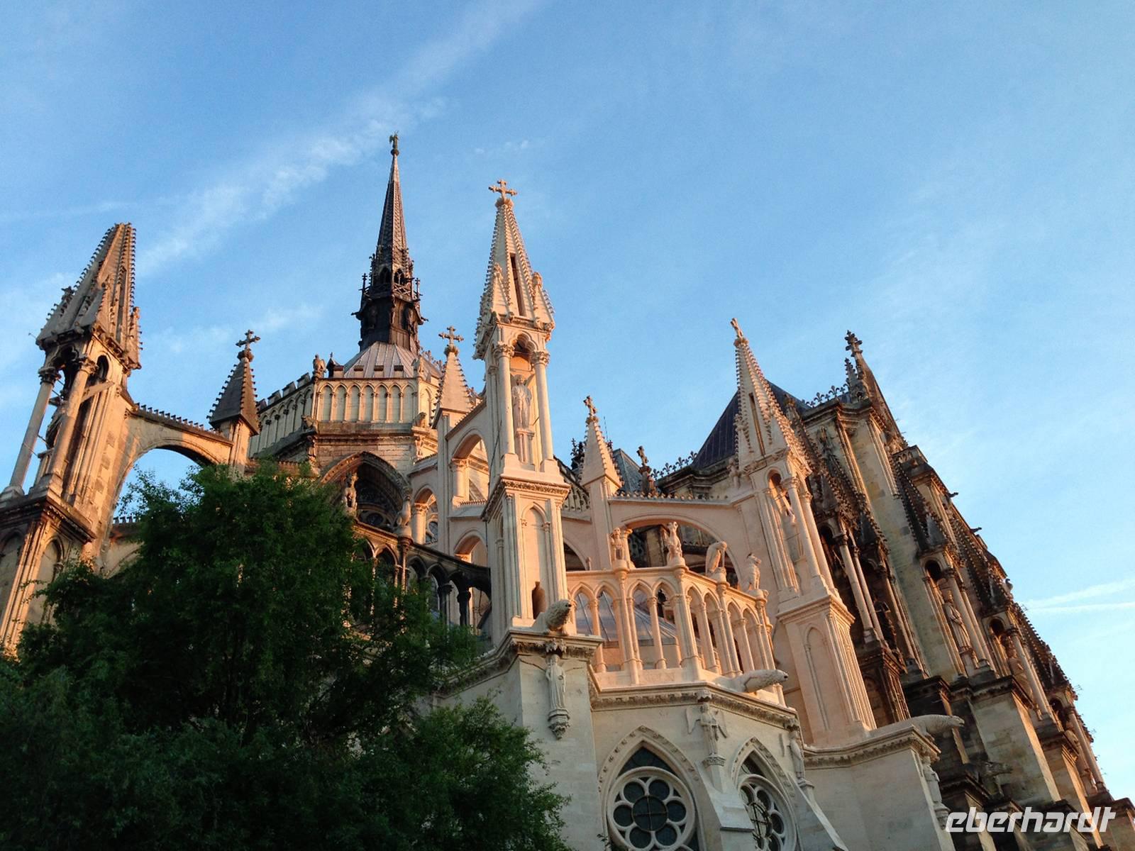 Da wir die Nacht in Reims verbringen, haben wir auch dort Gelegenheit, die Kathedrale zu besichtigen. Zunächst bei wunderschön goldenem Abendlicht und dann noch einmal gegen Mitternacht, wenn das Westwerk mit einer phantasievollen Lasershow zu neuem Leben erweckt wird.