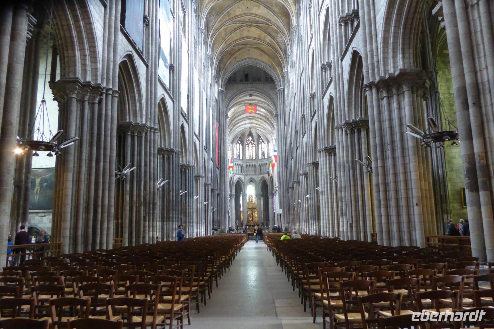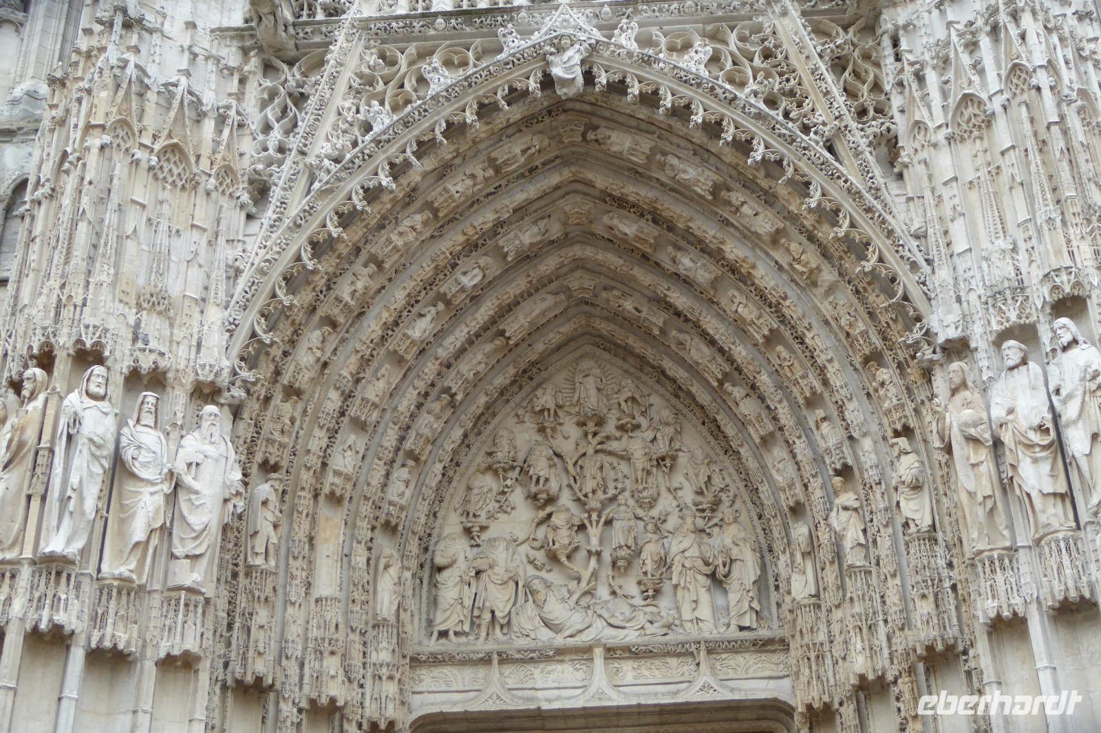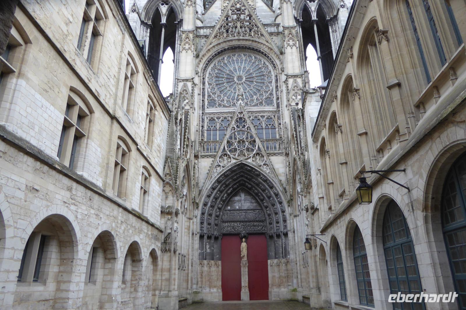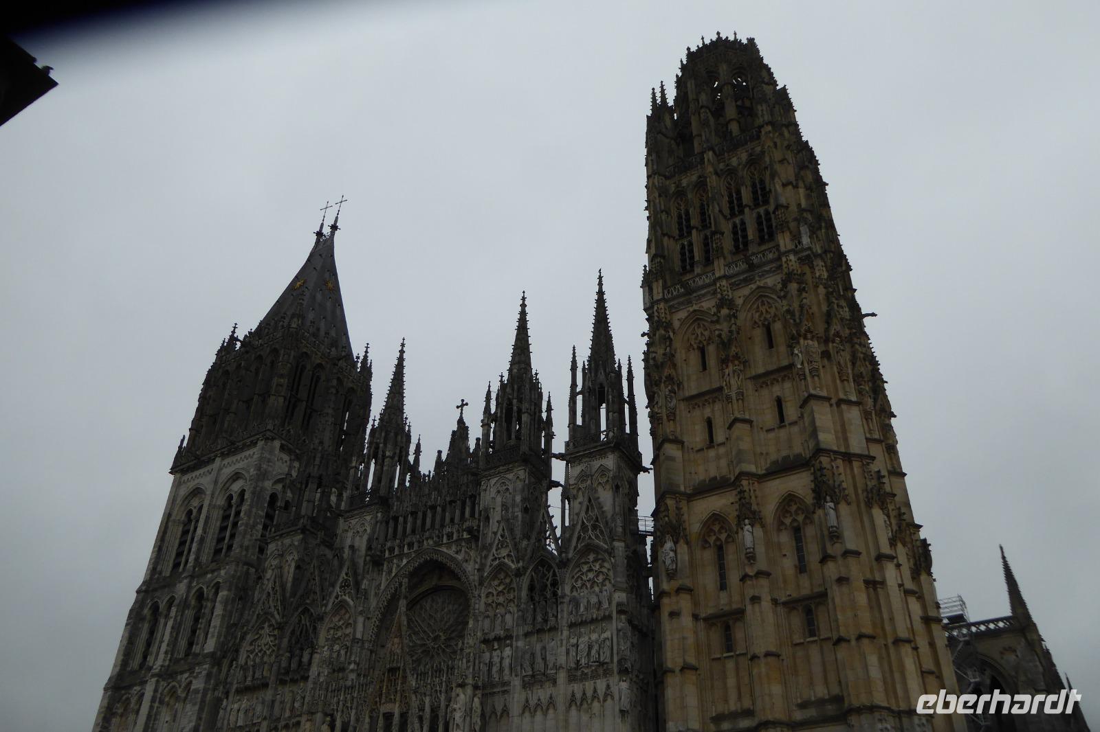 Am Nächsten Morgen hieß es 'Koffer packen' und Abschied nehmen von der Bretagne, dem Meer und der Küste. Die erste Etappe unserer Rückreise führte uns über die Straße der Gotik nach Rouen. Die ganze Stadt stand im Zeichen der `Armada´, einer Großveranstaltung, bei der sich die größten Segelschiffe der Welt auf der Seine ein Stelldichein geben. Im Vorbeifahren staunten wir über die gewaltigen Viermaster, die vor der Hubbrücke lagen. In der Stadt war alles geöffnet und so konnten wir die Kathedrale mit ihren enormen Ausmaßen auch im Inneren bewunderten. Vor der Fassade der Kathedrale kapituliert jede Linse und wir begnügten uns, sie von genau der Stelle, wo die Staffelei Claude Monets stand, zu betrachten. Die heutige Kathedrale Notre-Dame mit ihren beiden Türmen der Westfassade steht auf den Grundmauern eines romanischen Vorgängerbaus. Der Butterturm mit seinen 75 Metern Höhe ist eines der schönsten Beispiele für die Kunstfertigkeit der Bauleute der Hochgotik. Bis 1880 war der Turm über der Vierung mit 151 Metern Höhe das höchste Bauwerk der Welt! Durch die engen Gassen, dicht mit Fachwerkhäusern bestanden, kamen wir zum Justizpalast. An diesem größten, nicht sakralen Gebäude des ausgehenden Mittelalters, waren noch deutlich die Spuren der Häuserkämpfe am Ende des Zweiten Weltkriegs zu erkennen. Wir bestaunten noch den Uhrturm und gingen dann zum Alten Markt, der Stätte an der die junge Jeanne d´Arc 1431 den Flammentod erleiden musste. Die zu Ihren Ehren errichtete Kirche verblüfft im Inneren durch ihre großzügige Architektur, die einen ganz eigenen Raum schafft. Die bunten Glasfenster aus dem 16. Jahrhundert stammen aus dem 1944 zerstörten Vorgängerbau.