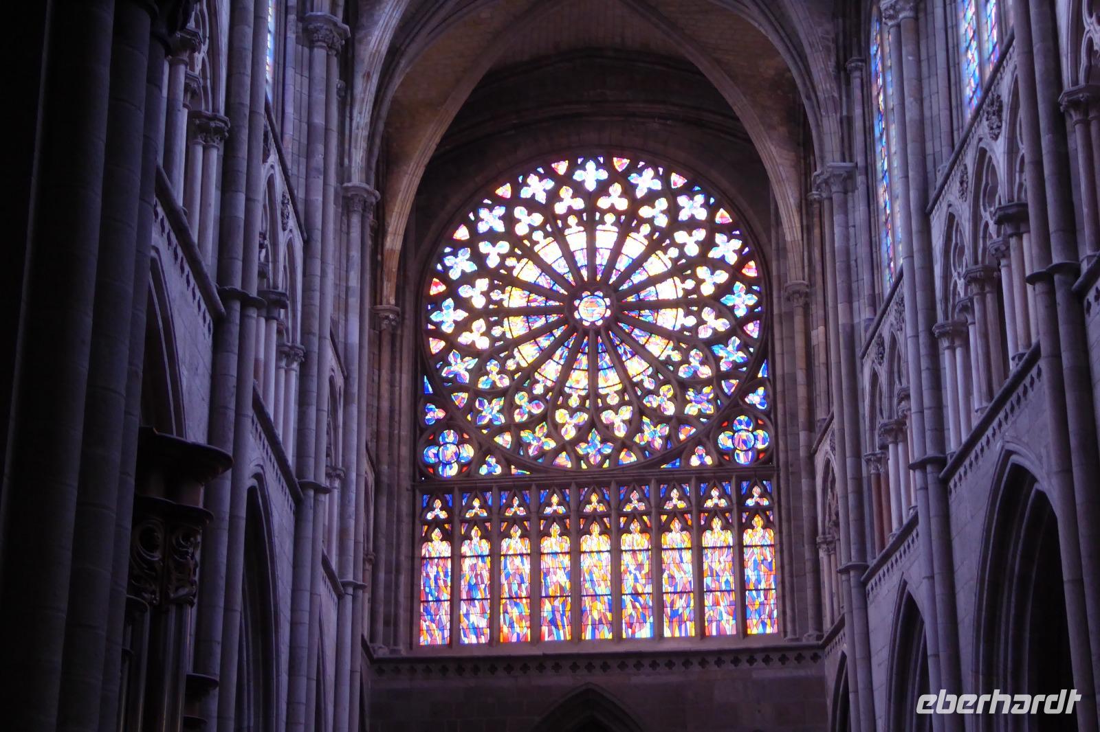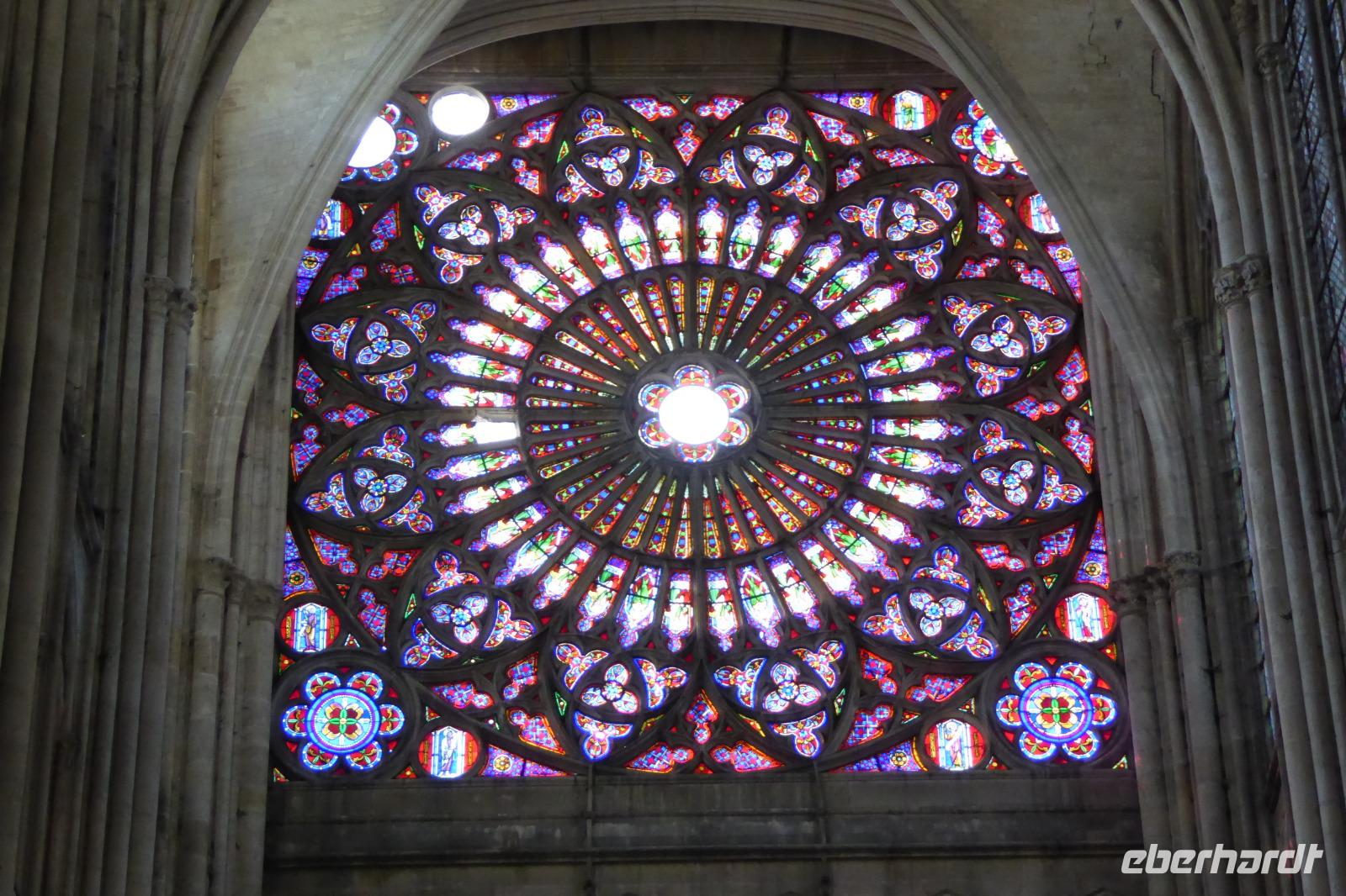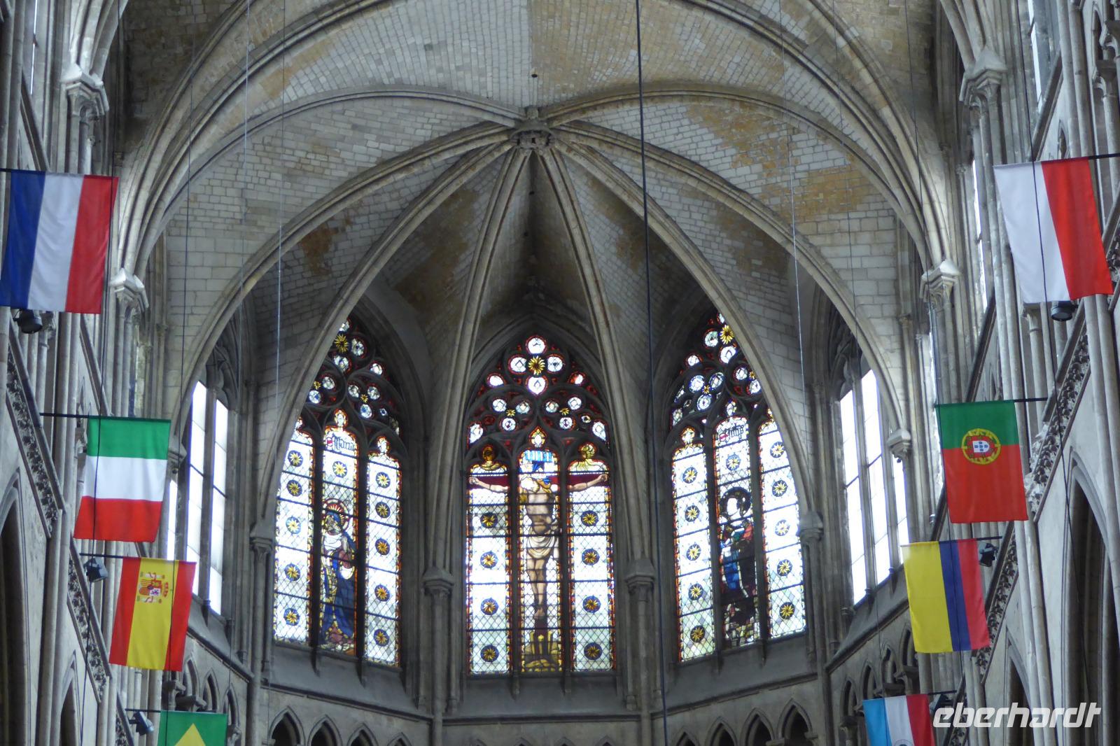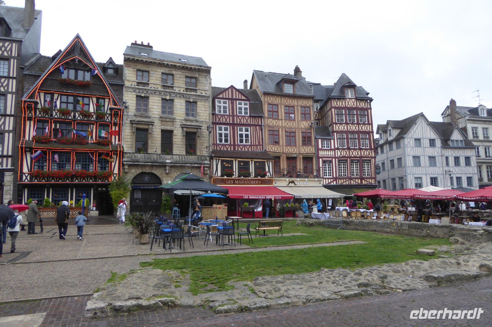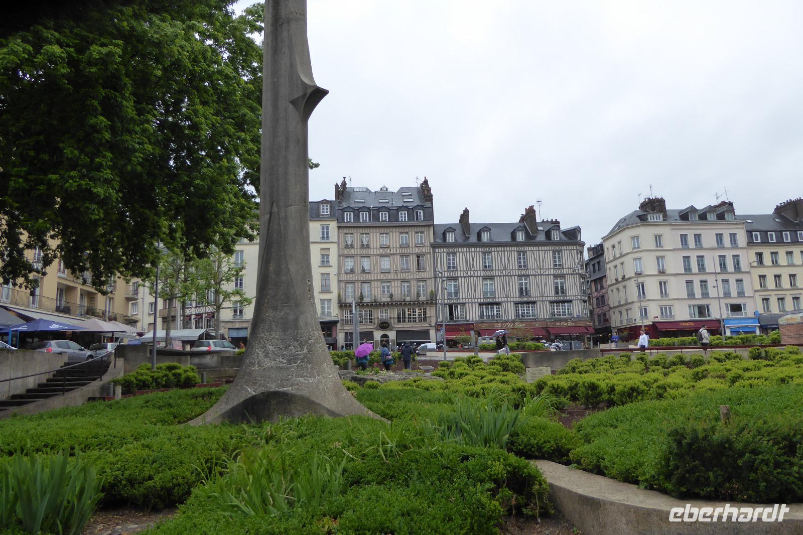 Am Nächsten Morgen hieß es 'Koffer packen' und Abschied nehmen von der Bretagne, dem Meer und der Küste. Die erste Etappe unserer Rückreise führte uns über die Straße der Gotik nach Rouen. Die ganze Stadt stand im Zeichen der `Armada´, einer Großveranstaltung, bei der sich die größten Segelschiffe der Welt auf der Seine ein Stelldichein geben. Im Vorbeifahren staunten wir über die gewaltigen Viermaster, die vor der Hubbrücke lagen. In der Stadt war alles geöffnet und so konnten wir die Kathedrale mit ihren enormen Ausmaßen auch im Inneren bewunderten. Vor der Fassade der Kathedrale kapituliert jede Linse und wir begnügten uns, sie von genau der Stelle, wo die Staffelei Claude Monets stand, zu betrachten. Die heutige Kathedrale Notre-Dame mit ihren beiden Türmen der Westfassade steht auf den Grundmauern eines romanischen Vorgängerbaus. Der Butterturm mit seinen 75 Metern Höhe ist eines der schönsten Beispiele für die Kunstfertigkeit der Bauleute der Hochgotik. Bis 1880 war der Turm über der Vierung mit 151 Metern Höhe das höchste Bauwerk der Welt! Durch die engen Gassen, dicht mit Fachwerkhäusern bestanden, kamen wir zum Justizpalast. An diesem größten, nicht sakralen Gebäude des ausgehenden Mittelalters, waren noch deutlich die Spuren der Häuserkämpfe am Ende des Zweiten Weltkriegs zu erkennen. Wir bestaunten noch den Uhrturm und gingen dann zum Alten Markt, der Stätte an der die junge Jeanne d´Arc 1431 den Flammentod erleiden musste. Die zu Ihren Ehren errichtete Kirche verblüfft im Inneren durch ihre großzügige Architektur, die einen ganz eigenen Raum schafft. Die bunten Glasfenster aus dem 16. Jahrhundert stammen aus dem 1944 zerstörten Vorgängerbau.