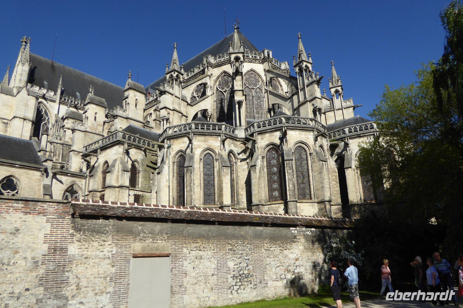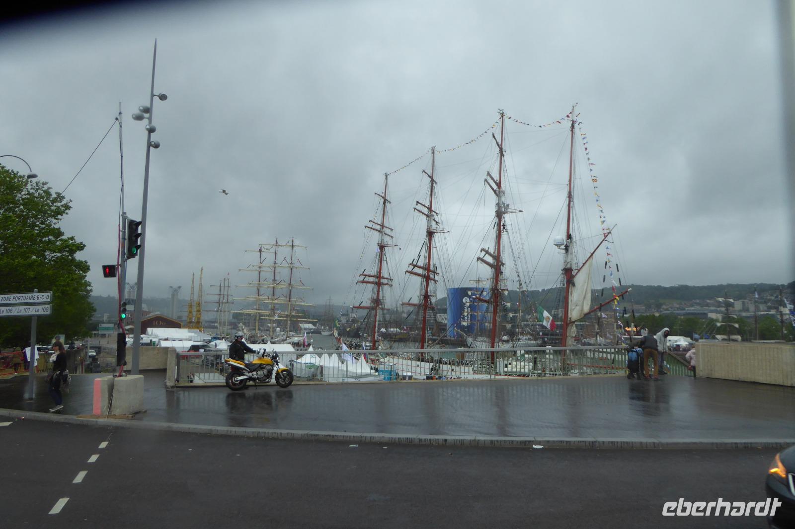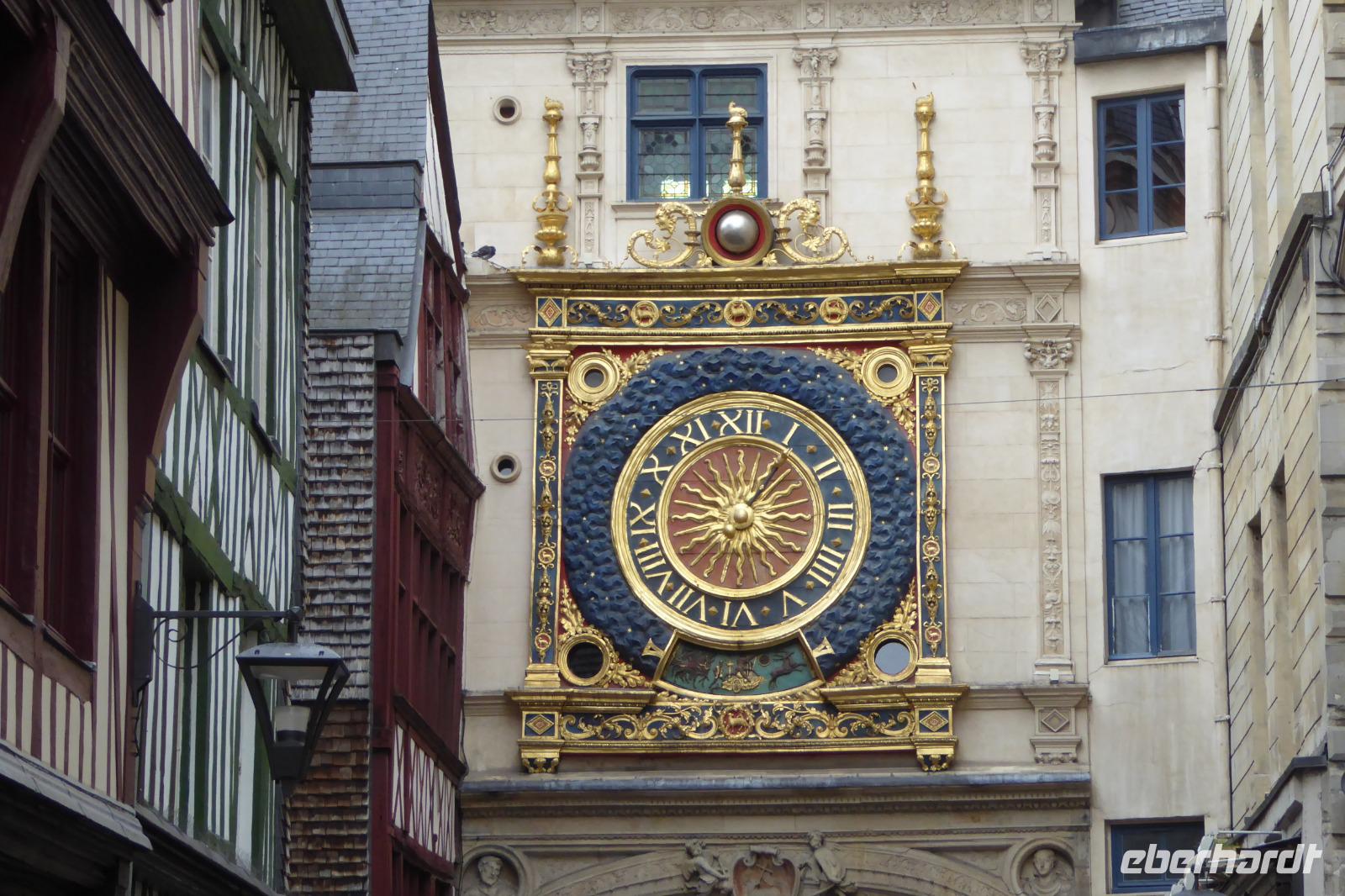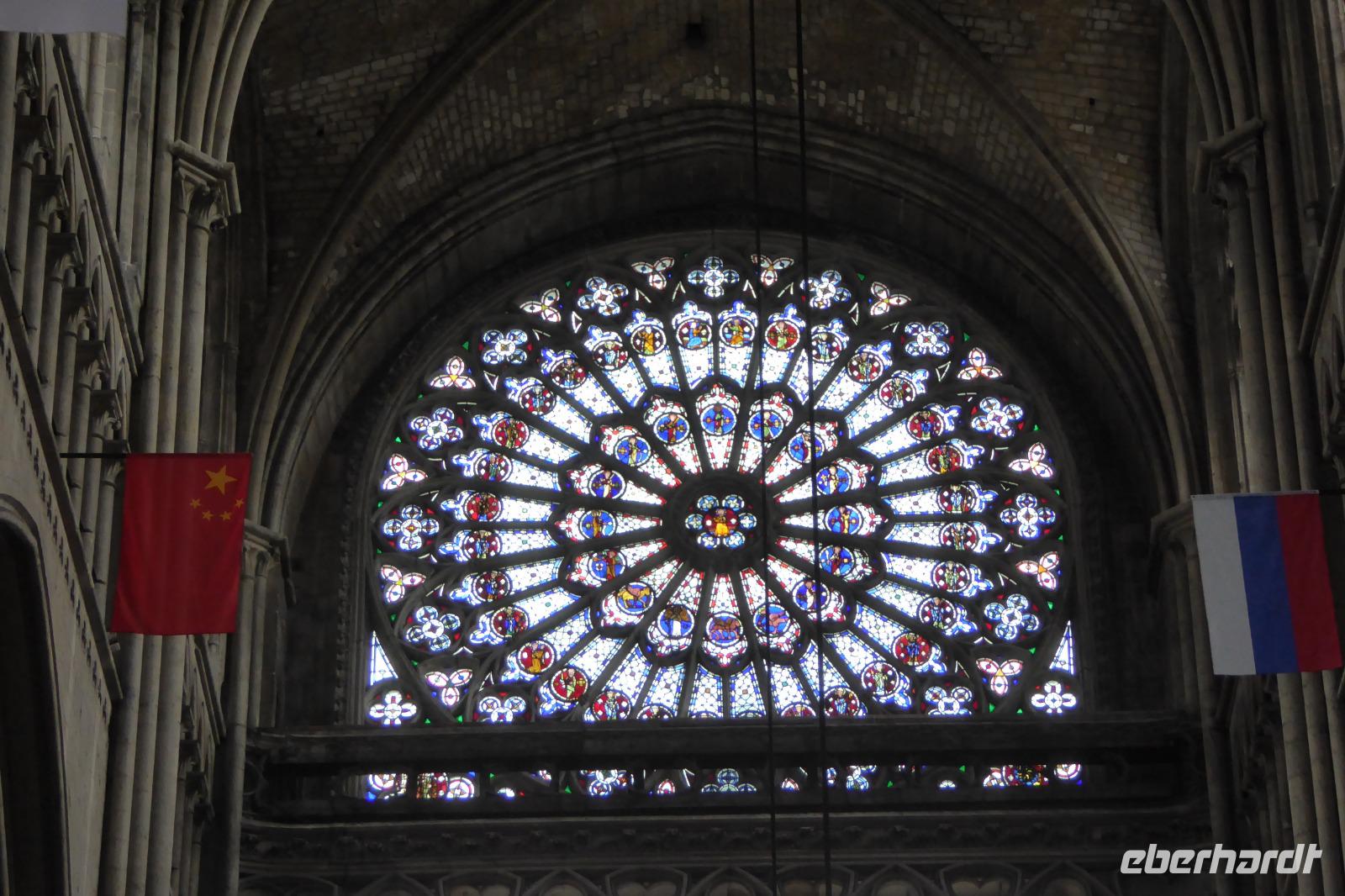 Am Nächsten Morgen hieß es 'Koffer packen' und Abschied nehmen von der Bretagne, dem Meer und der Küste. Die erste Etappe unserer Rückreise führte uns über die Straße der Gotik nach Rouen. Die ganze Stadt stand im Zeichen der `Armada´, einer Großveranstaltung, bei der sich die größten Segelschiffe der Welt auf der Seine ein Stelldichein geben. Im Vorbeifahren staunten wir über die gewaltigen Viermaster, die vor der Hubbrücke lagen. In der Stadt war alles geöffnet und so konnten wir die Kathedrale mit ihren enormen Ausmaßen auch im Inneren bewunderten. Vor der Fassade der Kathedrale kapituliert jede Linse und wir begnügten uns, sie von genau der Stelle, wo die Staffelei Claude Monets stand, zu betrachten. Die heutige Kathedrale Notre-Dame mit ihren beiden Türmen der Westfassade steht auf den Grundmauern eines romanischen Vorgängerbaus. Der Butterturm mit seinen 75 Metern Höhe ist eines der schönsten Beispiele für die Kunstfertigkeit der Bauleute der Hochgotik. Bis 1880 war der Turm über der Vierung mit 151 Metern Höhe das höchste Bauwerk der Welt! Durch die engen Gassen, dicht mit Fachwerkhäusern bestanden, kamen wir zum Justizpalast. An diesem größten, nicht sakralen Gebäude des ausgehenden Mittelalters, waren noch deutlich die Spuren der Häuserkämpfe am Ende des Zweiten Weltkriegs zu erkennen. Wir bestaunten noch den Uhrturm und gingen dann zum Alten Markt, der Stätte an der die junge Jeanne d´Arc 1431 den Flammentod erleiden musste. Die zu Ihren Ehren errichtete Kirche verblüfft im Inneren durch ihre großzügige Architektur, die einen ganz eigenen Raum schafft. Die bunten Glasfenster aus dem 16. Jahrhundert stammen aus dem 1944 zerstörten Vorgängerbau.