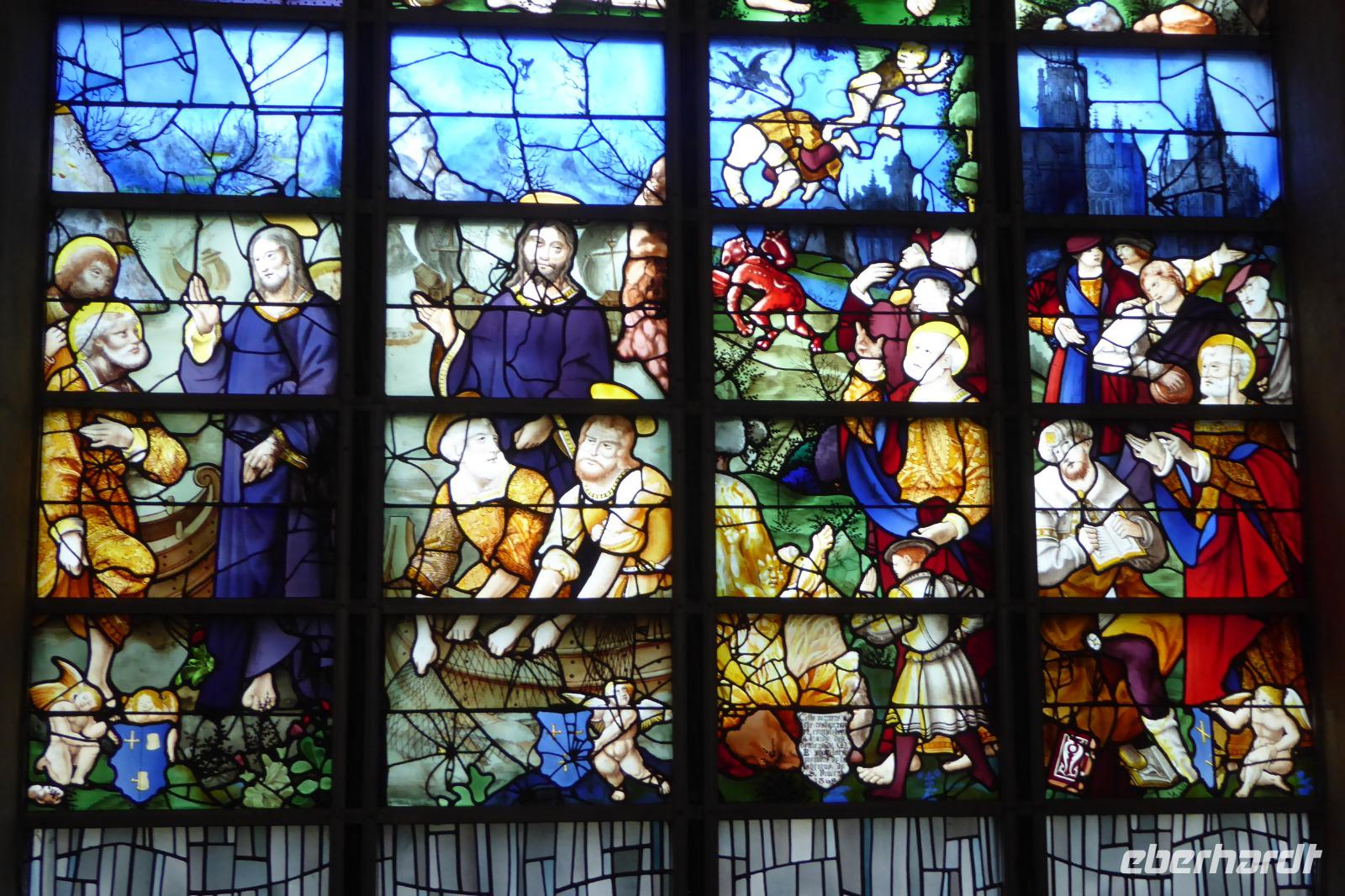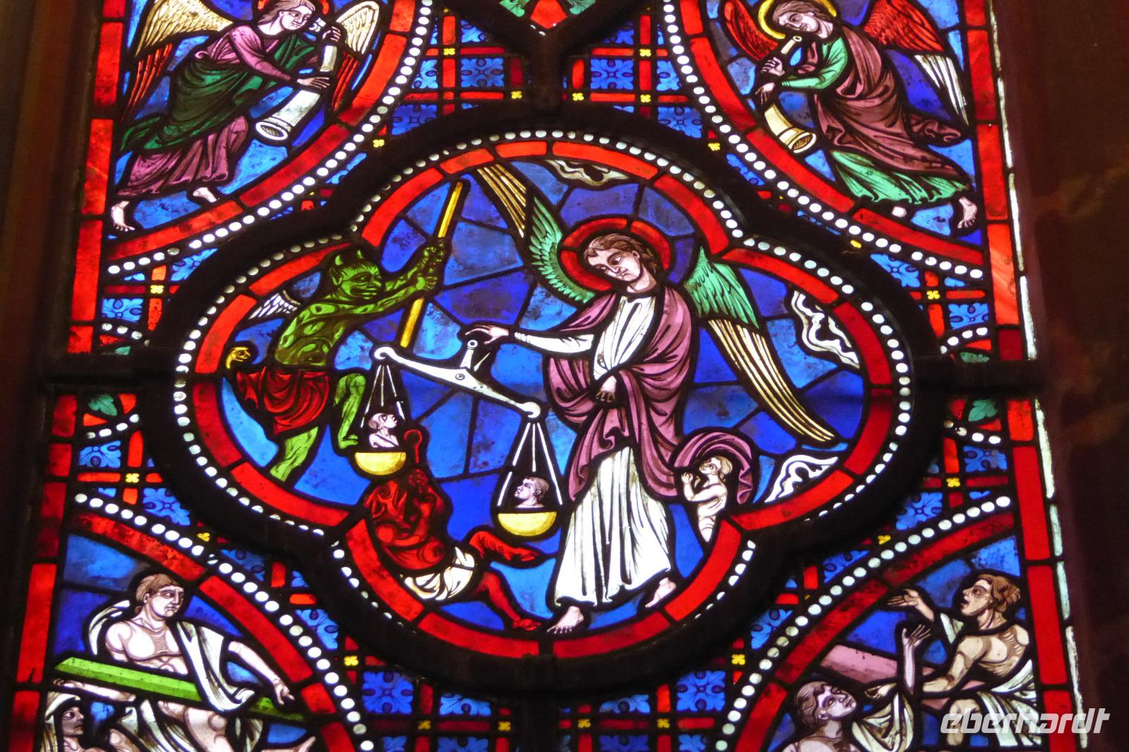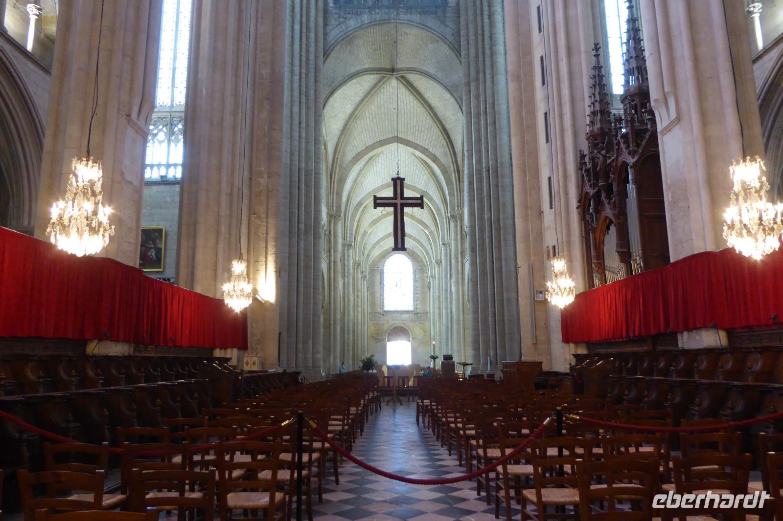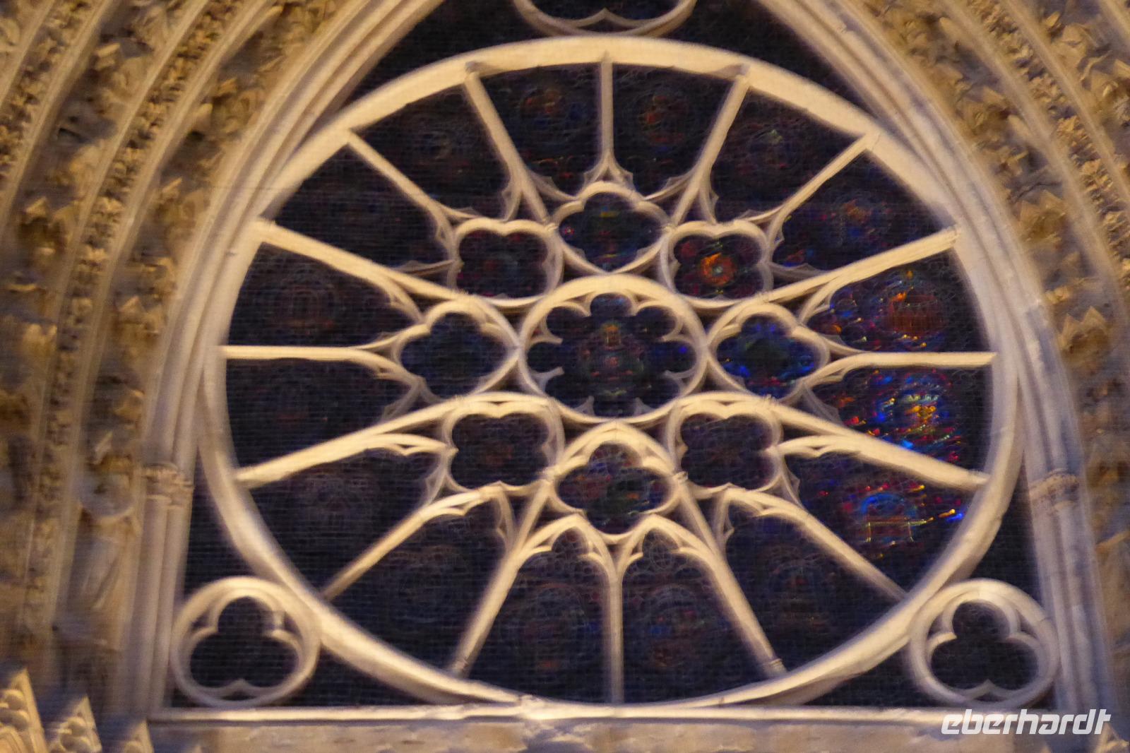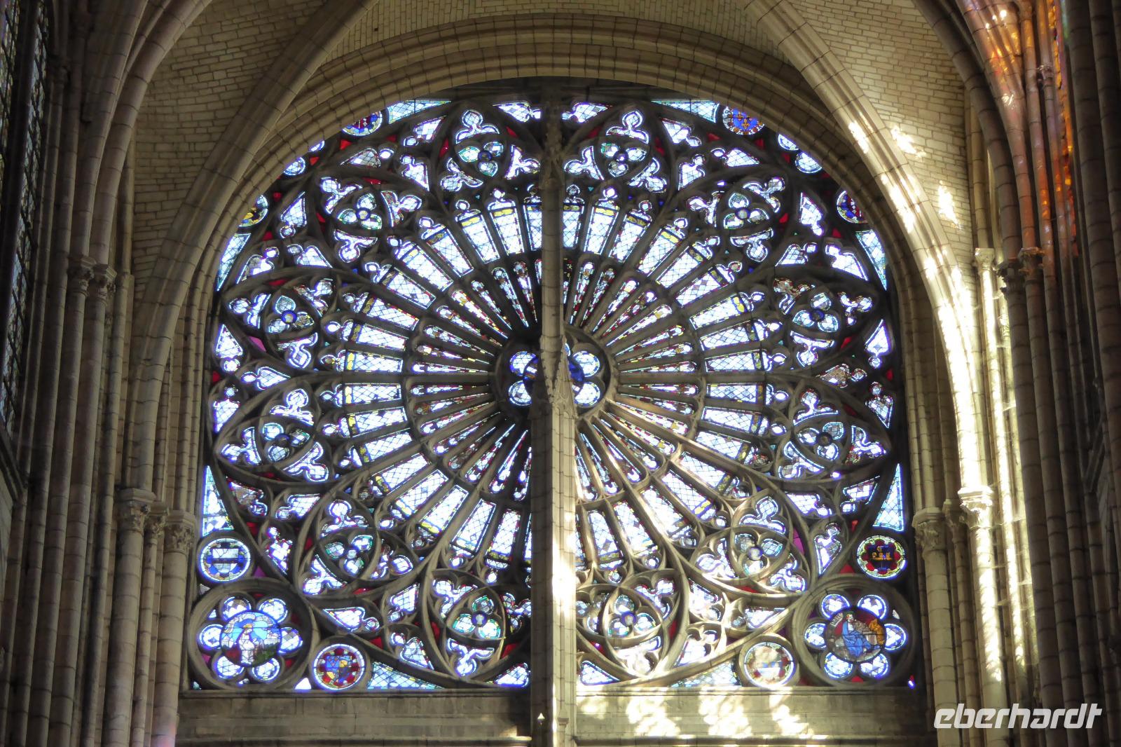 Am Nächsten Morgen hieß es 'Koffer packen' und Abschied nehmen von der Bretagne, dem Meer und der Küste. Die erste Etappe unserer Rückreise führte uns über die Straße der Gotik nach Rouen. Die ganze Stadt stand im Zeichen der `Armada´, einer Großveranstaltung, bei der sich die größten Segelschiffe der Welt auf der Seine ein Stelldichein geben. Im Vorbeifahren staunten wir über die gewaltigen Viermaster, die vor der Hubbrücke lagen. In der Stadt war alles geöffnet und so konnten wir die Kathedrale mit ihren enormen Ausmaßen auch im Inneren bewunderten. Vor der Fassade der Kathedrale kapituliert jede Linse und wir begnügten uns, sie von genau der Stelle, wo die Staffelei Claude Monets stand, zu betrachten. Die heutige Kathedrale Notre-Dame mit ihren beiden Türmen der Westfassade steht auf den Grundmauern eines romanischen Vorgängerbaus. Der Butterturm mit seinen 75 Metern Höhe ist eines der schönsten Beispiele für die Kunstfertigkeit der Bauleute der Hochgotik. Bis 1880 war der Turm über der Vierung mit 151 Metern Höhe das höchste Bauwerk der Welt! Durch die engen Gassen, dicht mit Fachwerkhäusern bestanden, kamen wir zum Justizpalast. An diesem größten, nicht sakralen Gebäude des ausgehenden Mittelalters, waren noch deutlich die Spuren der Häuserkämpfe am Ende des Zweiten Weltkriegs zu erkennen. Wir bestaunten noch den Uhrturm und gingen dann zum Alten Markt, der Stätte an der die junge Jeanne d´Arc 1431 den Flammentod erleiden musste. Die zu Ihren Ehren errichtete Kirche verblüfft im Inneren durch ihre großzügige Architektur, die einen ganz eigenen Raum schafft. Die bunten Glasfenster aus dem 16. Jahrhundert stammen aus dem 1944 zerstörten Vorgängerbau.