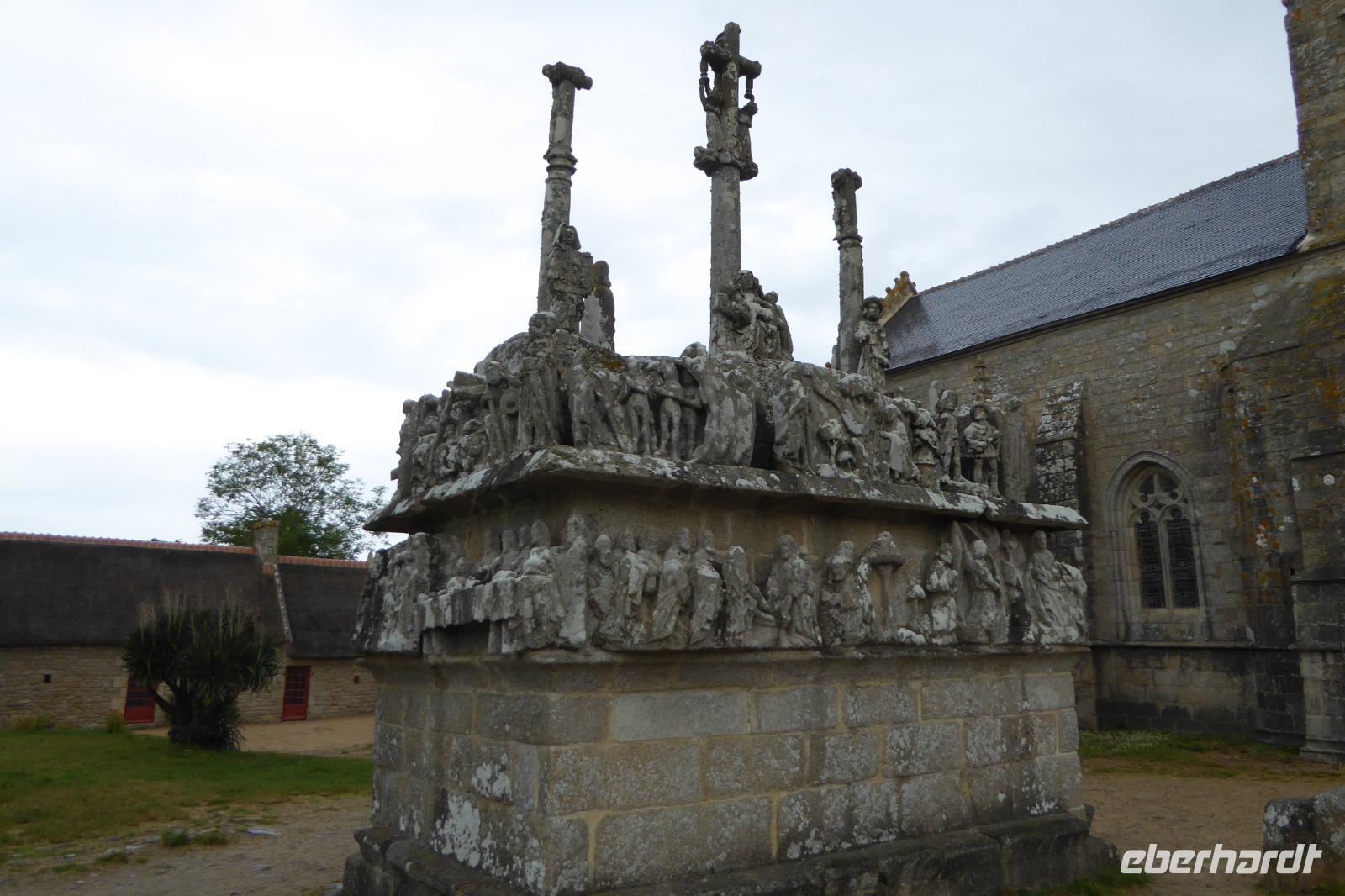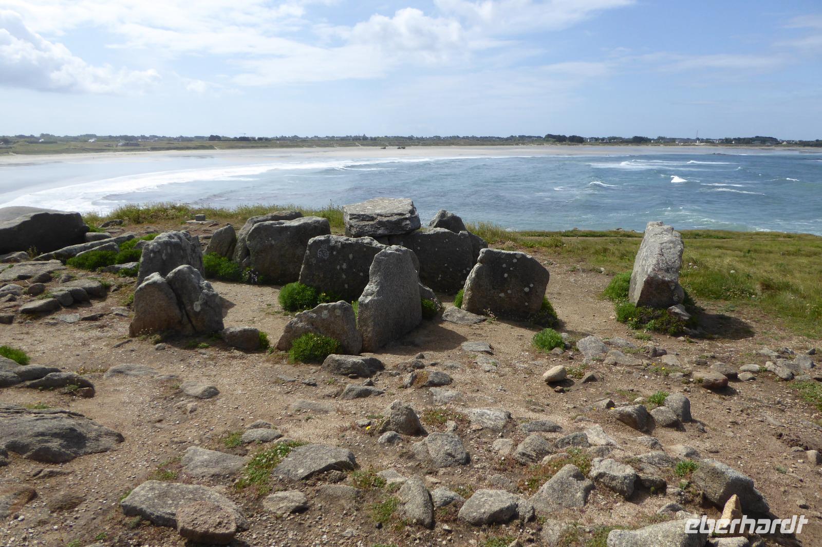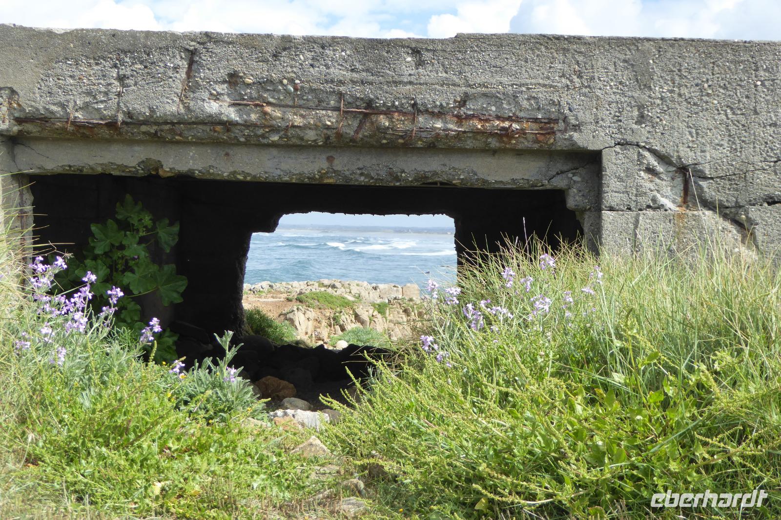 Neben der kleinen Kirche von Tronoën, die gerne die Kathedrale der Dünen genannt wird, steht der älteste Kalvarienberg der Bretagne. Mit über 100 ursprünglich wohl bunt bemalten Figuren, wird hier das Leben Christi dargestellt. Sieben solche in Stein gemeißelte Evangelien kann man in der Bretagne entdecken. Unsere Wanderung zur Küste führte uns über die Dünen zu Meer. Die Ebbe ausnutzend spazierten wir barfuß über den Strand und genoßen die kostenlose Thalasso-Therapie für Körper und Seele! In Penmarch trafen wir wieder auf steinerne Zeugnisse der Vergangenheit: wie von Teufels Hand geworfene Würfel liegen die Bunker des Atlantikwalles am Strand und auf der Pointe de la Torche findet sich der in Beton gegossene Größenwahn der deutschen Heeresführung neben einem Megalithgrab der Jungsteinzeit. Kleine Kinder nutzen die Anlagen für ihr fröhliches Versteckspiel.