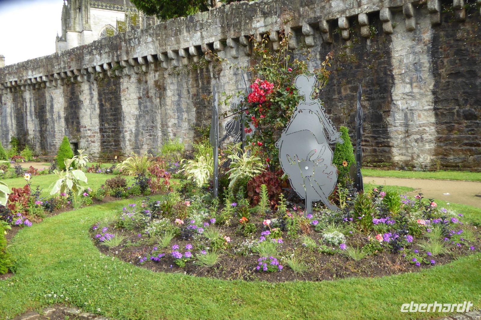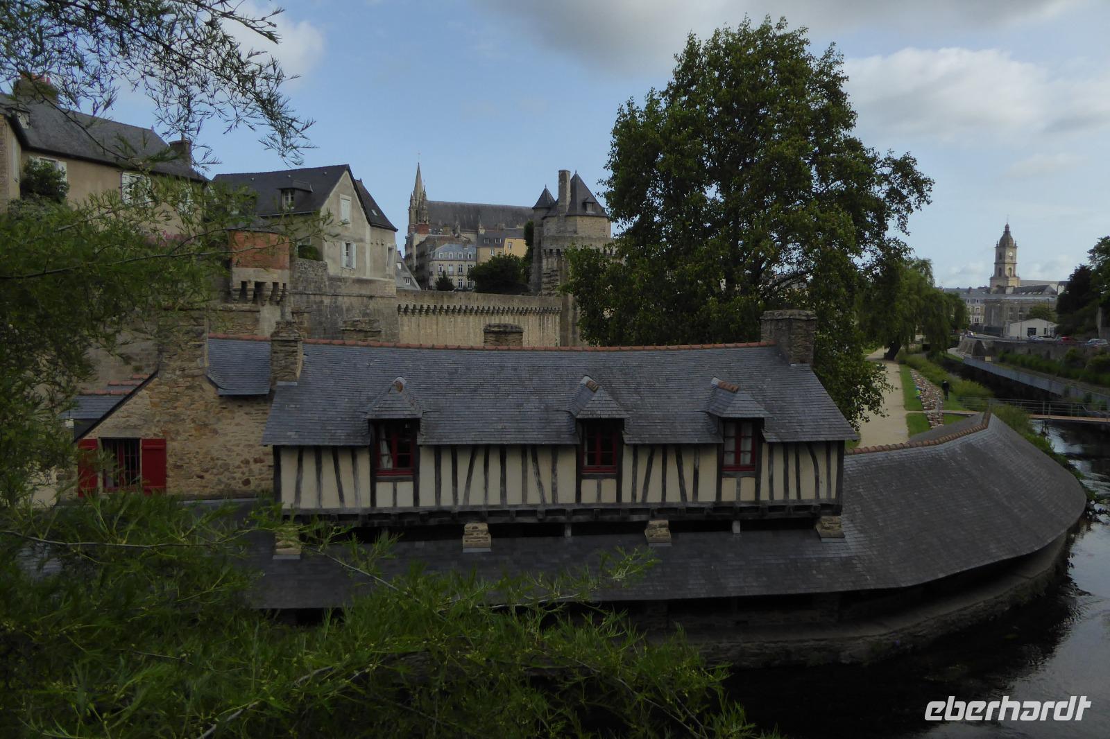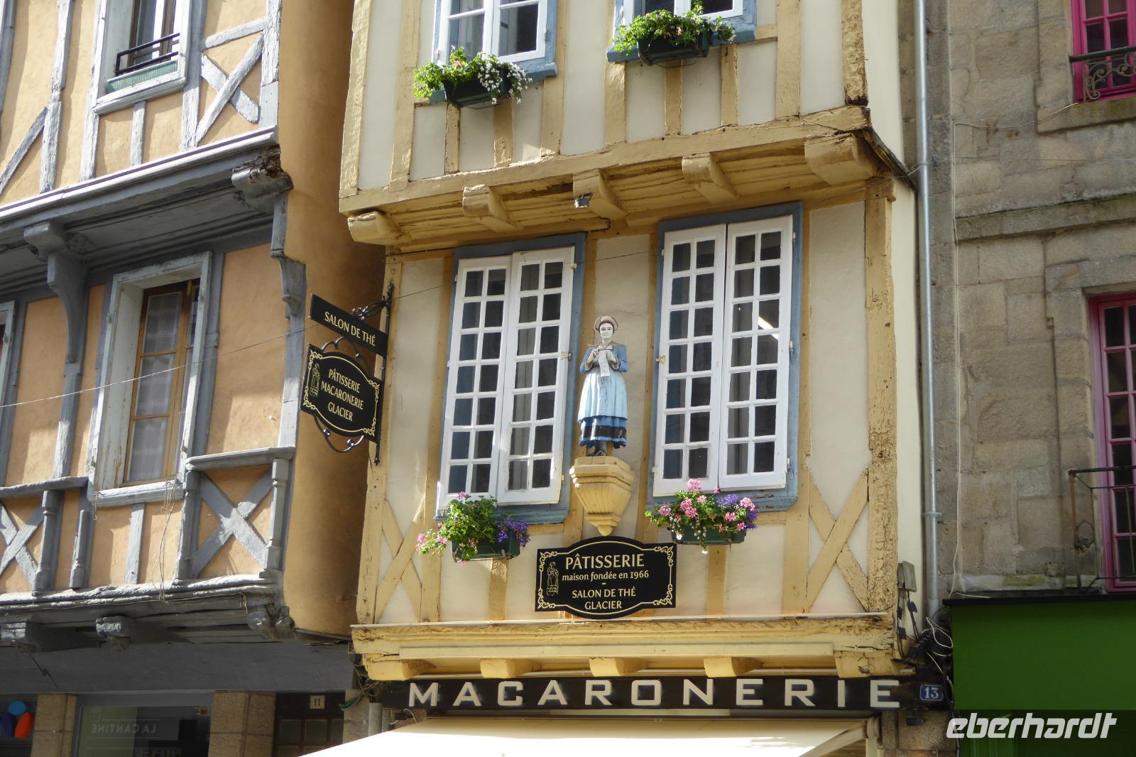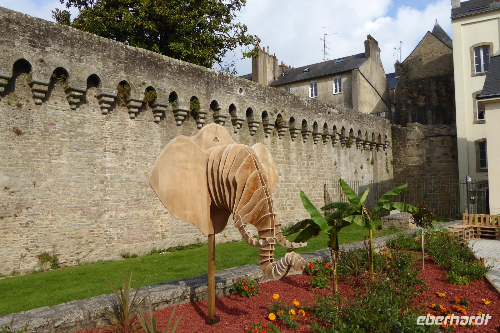 Am Vormittag holte uns unsere Stadtführerin Kristin am Hotel ab und wir ließen uns direkt an das Stadttor von Vannes bringen. Am Wochenende war Segler Messe, der Hafen war noch gesäumt von weißen Zelten und unterstrichen so den bretonischen Namen Vannes: Gwened, die Weiße. Sie liegt am Ende des Golfe du Morbihan geschützt von massiven Stadtmauern. Durch das Saint-Vincent-Stadttor kamen wir in die Altstadt. Jenseits des Tors drängen sich dicht an dicht Gebäude aus dem 17. Jahrhundert. Rund um den Place des Lices, an dem die mittelalterlichen Turniere ausgetragen wurden, stehen Stadtvillen neben alten Fachwerkhäusern. Die Fassaden leuchten in fröhlichen bunten Farben. Hinter der Kathedrale bietet die Rue Saint-Gwénaël eine große Auswahl an Baudetails, bis hinab zur Porte Prison, an der das malerische Viertel Saint-Patern beginnt. Von der Porte Prison gingen wir entlang der Garenne-Promenade, die an den im 13. Jahrhundert errichteten Stadtmauern entlangführt. Türme und Tore folgen in bemerkenswerter Harmonie aufeinander, zu ihren Füßen bewunderten wir die schönen französischen Gärten und daneben das beeindruckende Château de l´Hermine mit einem überdimensionalen Hermelin Wappen aus roten und weißen Blumen. Die öffentlichen Waschplätze neigen ihre langen Schieferdächer malerisch über die Marle. Viel zu schnell ging die Zeit vorüber, doch es reichte noch für einen Blick in die Kathedrale, die mit 110 Metern Länge eine der größten in der Bretagne ist und um bei der Skulptur "Vannes et sa femme" zu rätseln, wer denn nun der Mann und wer die Frau sei!