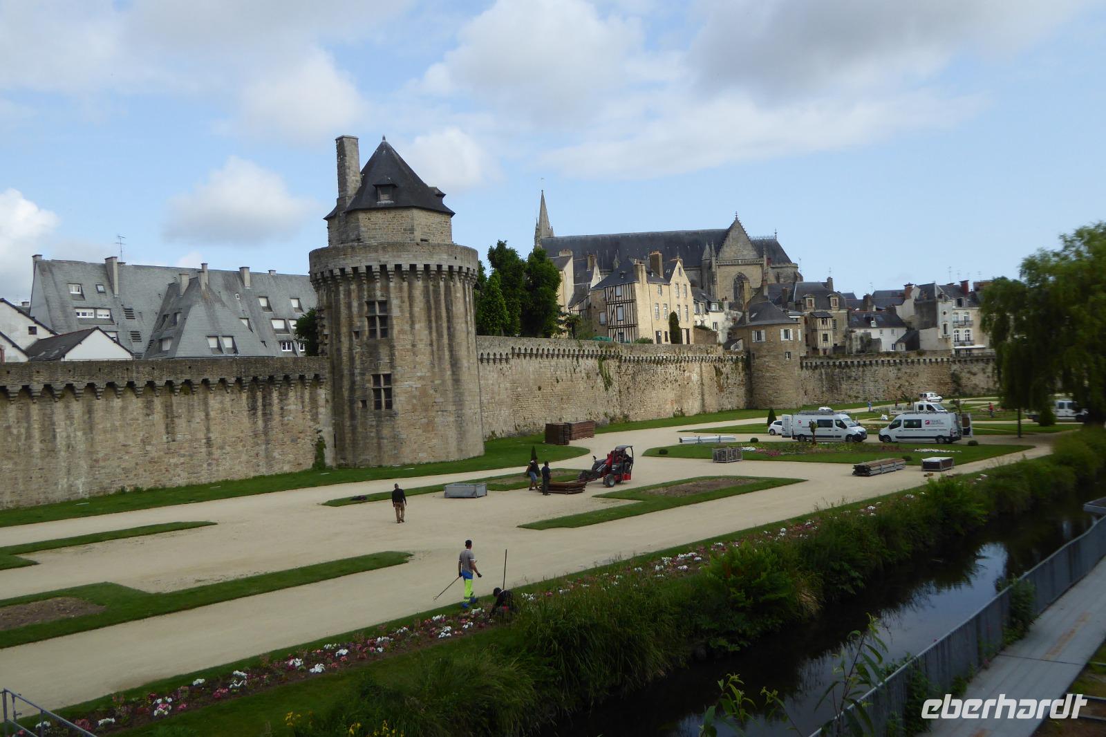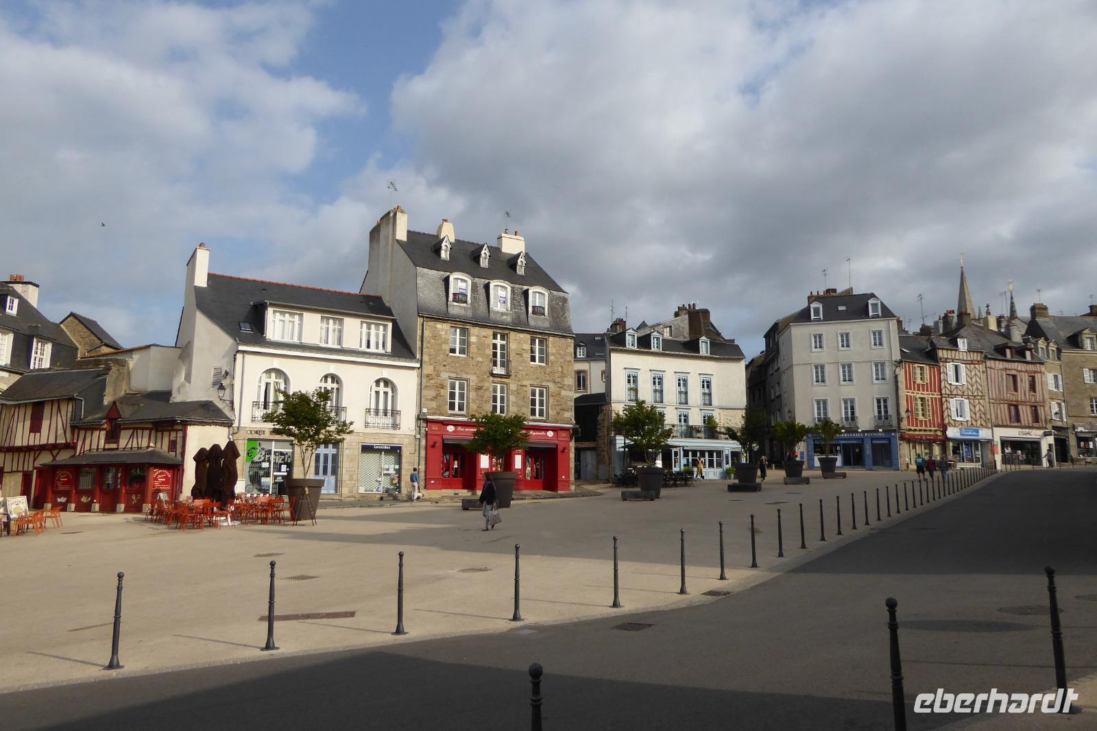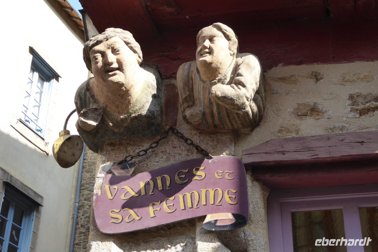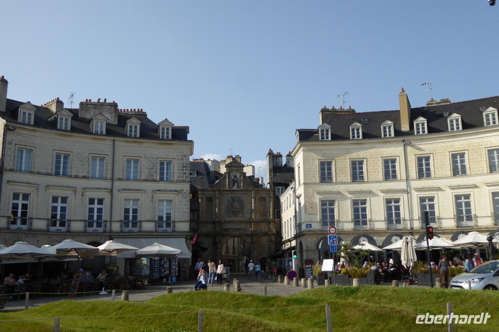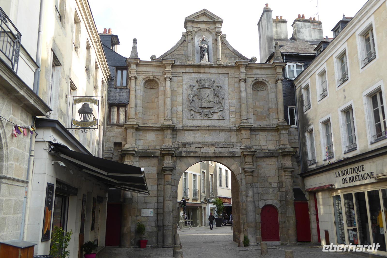 Am Vormittag holte uns unsere Stadtführerin Kristin am Hotel ab und wir ließen uns direkt an das Stadttor von Vannes bringen. Am Wochenende war Segler Messe, der Hafen war noch gesäumt von weißen Zelten und unterstrichen so den bretonischen Namen Vannes: Gwened, die Weiße. Sie liegt am Ende des Golfe du Morbihan geschützt von massiven Stadtmauern. Durch das Saint-Vincent-Stadttor kamen wir in die Altstadt. Jenseits des Tors drängen sich dicht an dicht Gebäude aus dem 17. Jahrhundert. Rund um den Place des Lices, an dem die mittelalterlichen Turniere ausgetragen wurden, stehen Stadtvillen neben alten Fachwerkhäusern. Die Fassaden leuchten in fröhlichen bunten Farben. Hinter der Kathedrale bietet die Rue Saint-Gwénaël eine große Auswahl an Baudetails, bis hinab zur Porte Prison, an der das malerische Viertel Saint-Patern beginnt. Von der Porte Prison gingen wir entlang der Garenne-Promenade, die an den im 13. Jahrhundert errichteten Stadtmauern entlangführt. Türme und Tore folgen in bemerkenswerter Harmonie aufeinander, zu ihren Füßen bewunderten wir die schönen französischen Gärten und daneben das beeindruckende Château de l´Hermine mit einem überdimensionalen Hermelin Wappen aus roten und weißen Blumen. Die öffentlichen Waschplätze neigen ihre langen Schieferdächer malerisch über die Marle. Viel zu schnell ging die Zeit vorüber, doch es reichte noch für einen Blick in die Kathedrale, die mit 110 Metern Länge eine der größten in der Bretagne ist und um bei der Skulptur "Vannes et sa femme" zu rätseln, wer denn nun der Mann und wer die Frau sei!