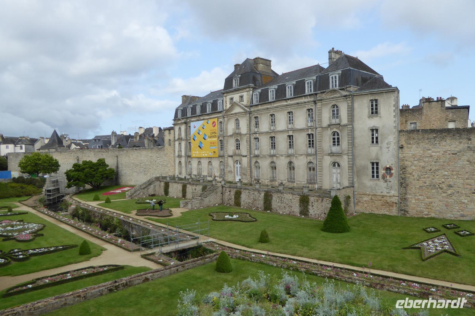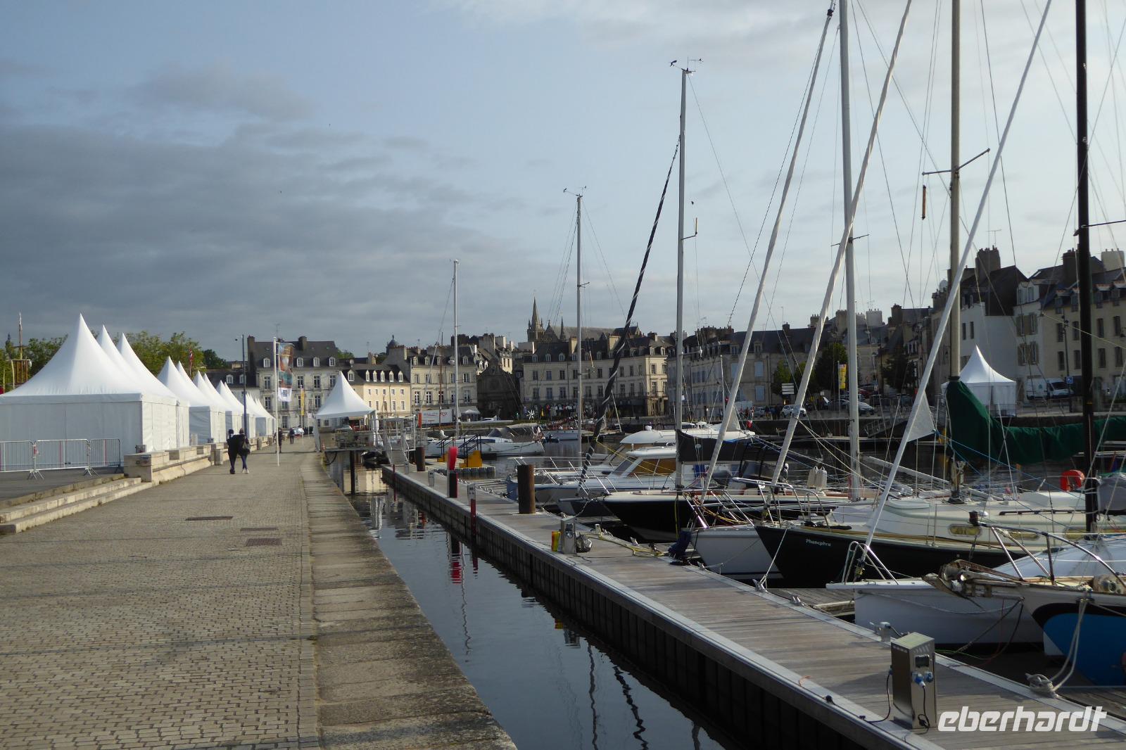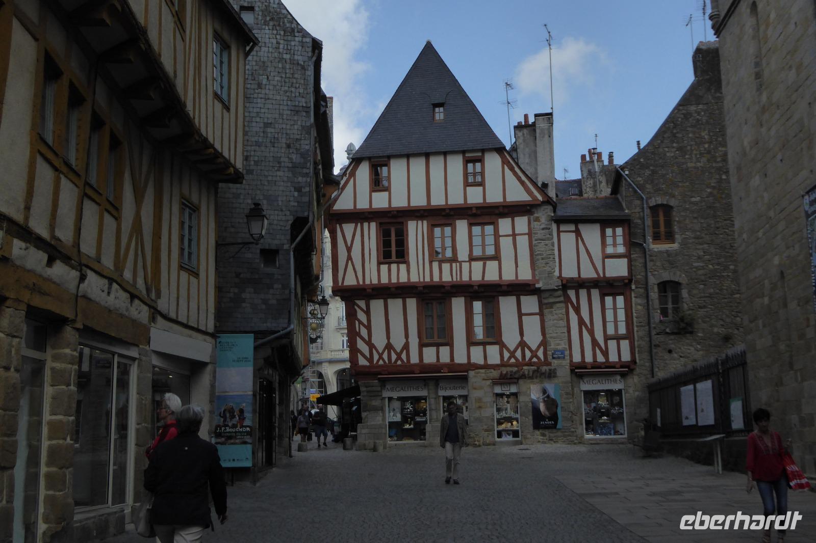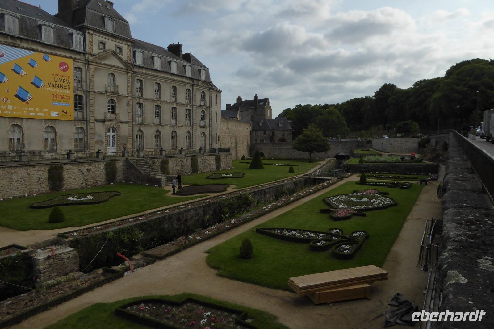 Am Vormittag holte uns unsere Stadtführerin Kristin am Hotel ab und wir ließen uns direkt an das Stadttor von Vannes bringen. Am Wochenende war Segler Messe, der Hafen war noch gesäumt von weißen Zelten und unterstrichen so den bretonischen Namen Vannes: Gwened, die Weiße. Sie liegt am Ende des Golfe du Morbihan geschützt von massiven Stadtmauern. Durch das Saint-Vincent-Stadttor kamen wir in die Altstadt. Jenseits des Tors drängen sich dicht an dicht Gebäude aus dem 17. Jahrhundert. Rund um den Place des Lices, an dem die mittelalterlichen Turniere ausgetragen wurden, stehen Stadtvillen neben alten Fachwerkhäusern. Die Fassaden leuchten in fröhlichen bunten Farben. Hinter der Kathedrale bietet die Rue Saint-Gwénaël eine große Auswahl an Baudetails, bis hinab zur Porte Prison, an der das malerische Viertel Saint-Patern beginnt. Von der Porte Prison gingen wir entlang der Garenne-Promenade, die an den im 13. Jahrhundert errichteten Stadtmauern entlangführt. Türme und Tore folgen in bemerkenswerter Harmonie aufeinander, zu ihren Füßen bewunderten wir die schönen französischen Gärten und daneben das beeindruckende Château de l´Hermine mit einem überdimensionalen Hermelin Wappen aus roten und weißen Blumen. Die öffentlichen Waschplätze neigen ihre langen Schieferdächer malerisch über die Marle. Viel zu schnell ging die Zeit vorüber, doch es reichte noch für einen Blick in die Kathedrale, die mit 110 Metern Länge eine der größten in der Bretagne ist und um bei der Skulptur "Vannes et sa femme" zu rätseln, wer denn nun der Mann und wer die Frau sei!