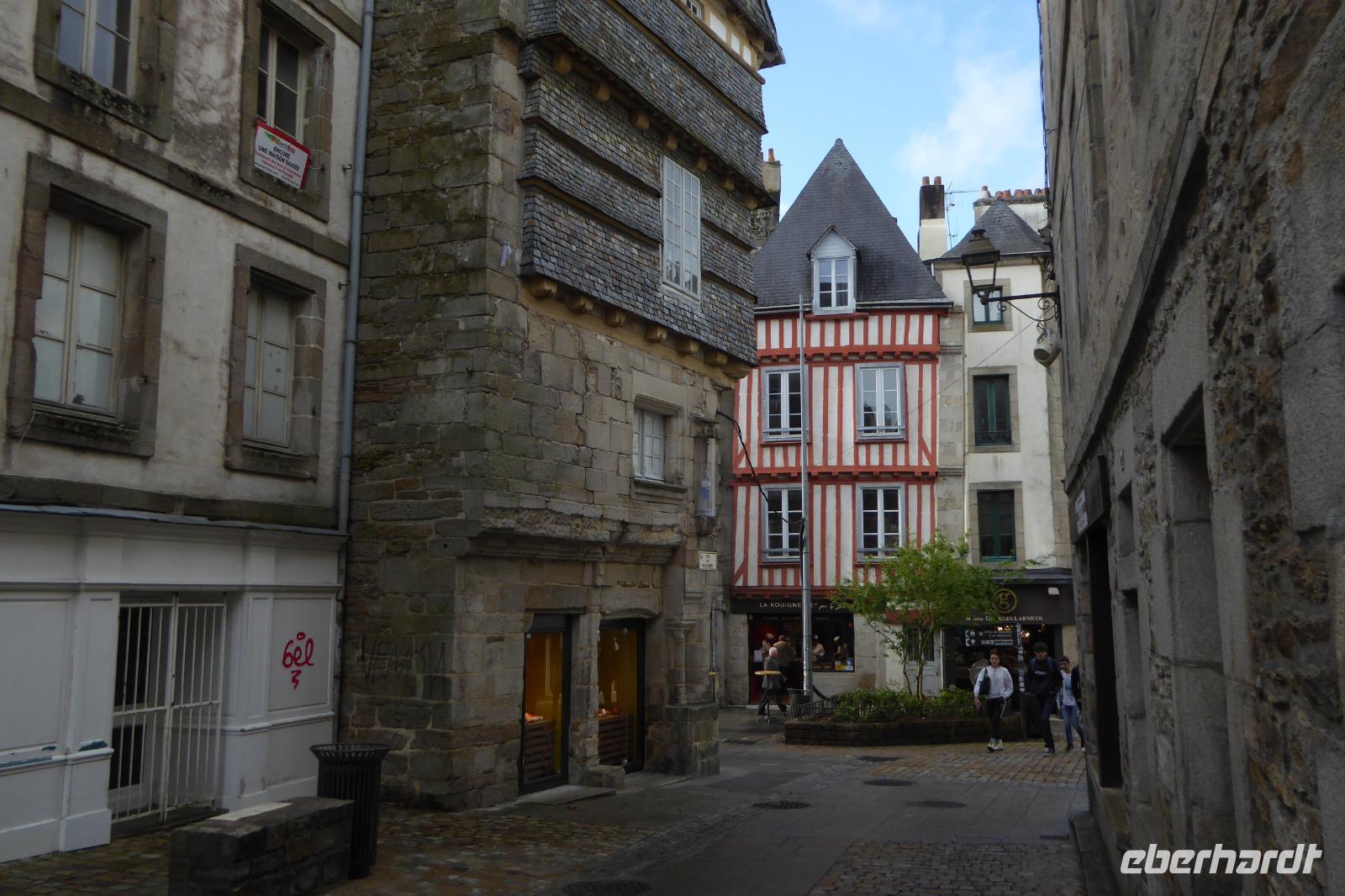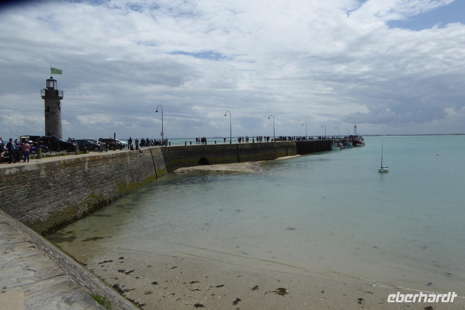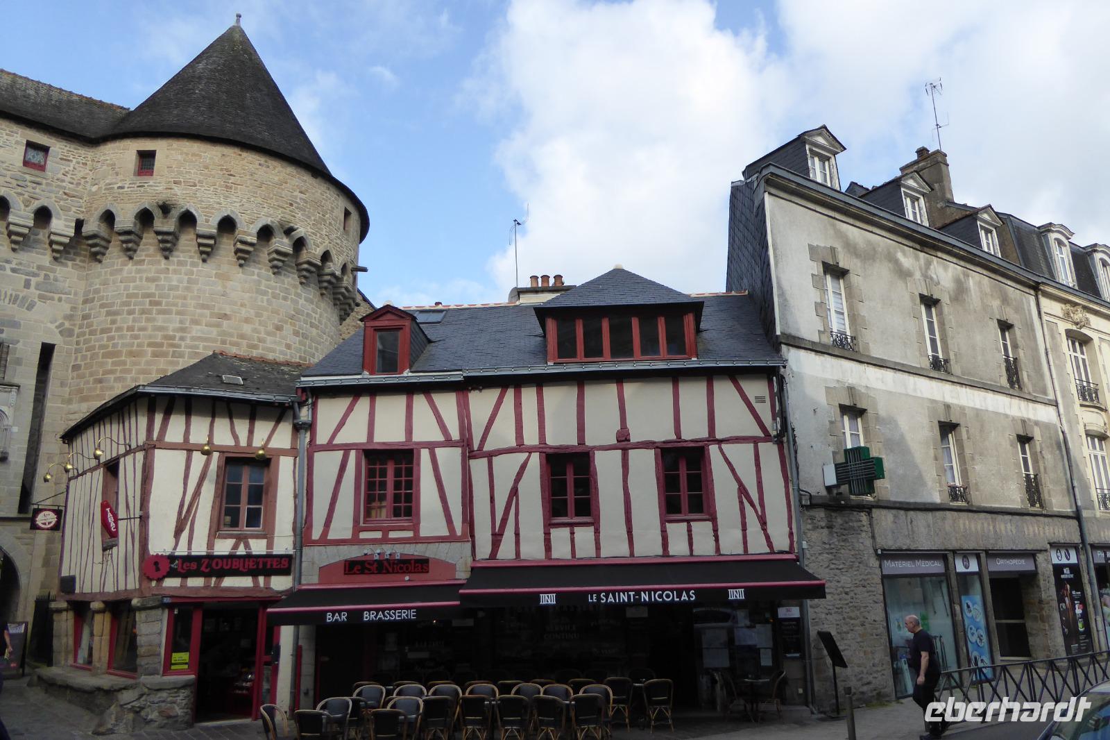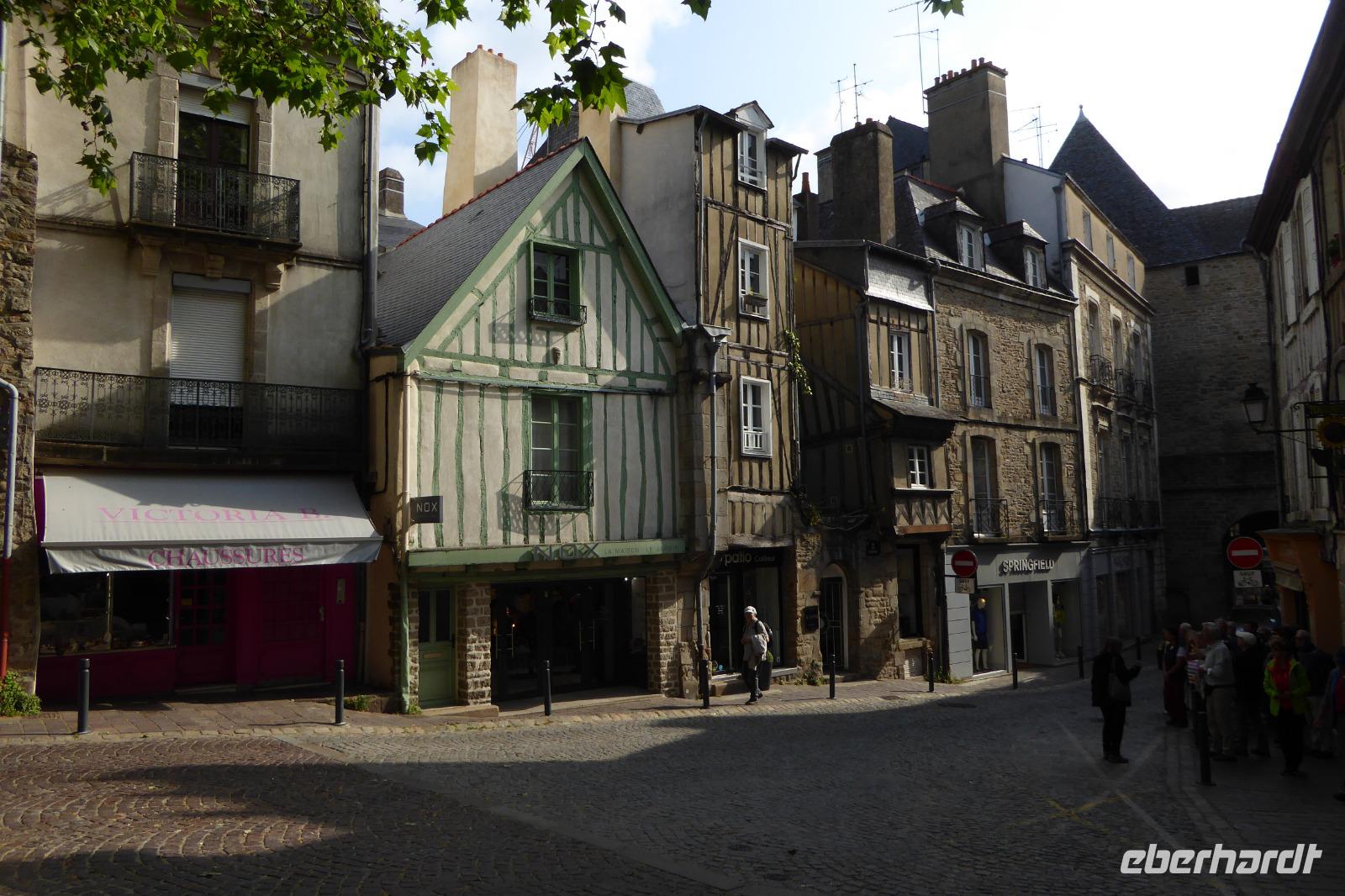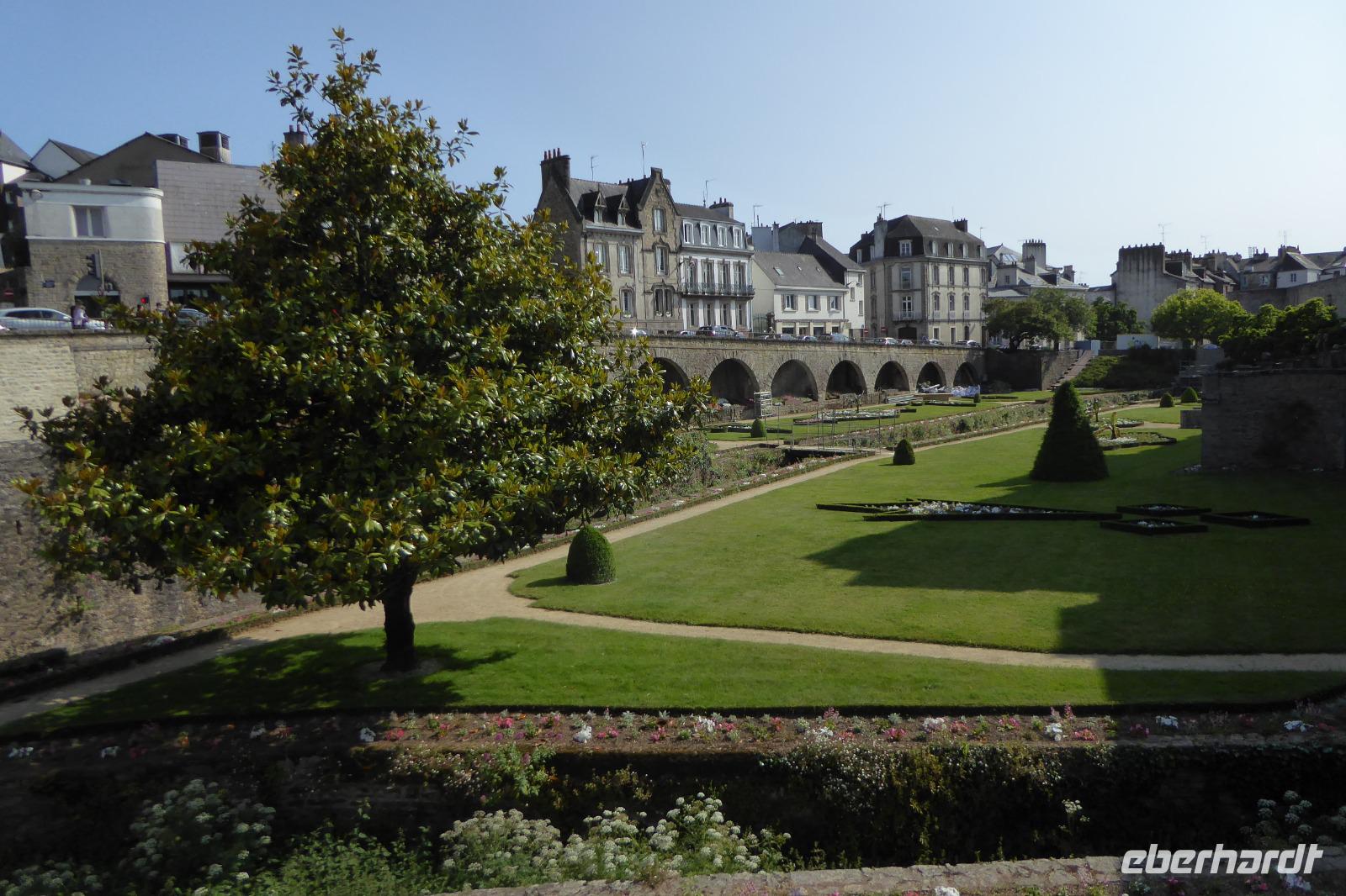 Am Vormittag holte uns unsere Stadtführerin Kristin am Hotel ab und wir ließen uns direkt an das Stadttor von Vannes bringen. Am Wochenende war Segler Messe, der Hafen war noch gesäumt von weißen Zelten und unterstrichen so den bretonischen Namen Vannes: Gwened, die Weiße. Sie liegt am Ende des Golfe du Morbihan geschützt von massiven Stadtmauern. Durch das Saint-Vincent-Stadttor kamen wir in die Altstadt. Jenseits des Tors drängen sich dicht an dicht Gebäude aus dem 17. Jahrhundert. Rund um den Place des Lices, an dem die mittelalterlichen Turniere ausgetragen wurden, stehen Stadtvillen neben alten Fachwerkhäusern. Die Fassaden leuchten in fröhlichen bunten Farben. Hinter der Kathedrale bietet die Rue Saint-Gwénaël eine große Auswahl an Baudetails, bis hinab zur Porte Prison, an der das malerische Viertel Saint-Patern beginnt. Von der Porte Prison gingen wir entlang der Garenne-Promenade, die an den im 13. Jahrhundert errichteten Stadtmauern entlangführt. Türme und Tore folgen in bemerkenswerter Harmonie aufeinander, zu ihren Füßen bewunderten wir die schönen französischen Gärten und daneben das beeindruckende Château de l´Hermine mit einem überdimensionalen Hermelin Wappen aus roten und weißen Blumen. Die öffentlichen Waschplätze neigen ihre langen Schieferdächer malerisch über die Marle. Viel zu schnell ging die Zeit vorüber, doch es reichte noch für einen Blick in die Kathedrale, die mit 110 Metern Länge eine der größten in der Bretagne ist und um bei der Skulptur "Vannes et sa femme" zu rätseln, wer denn nun der Mann und wer die Frau sei!