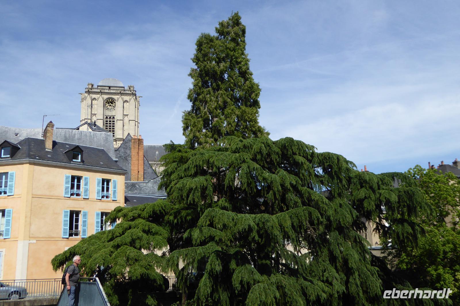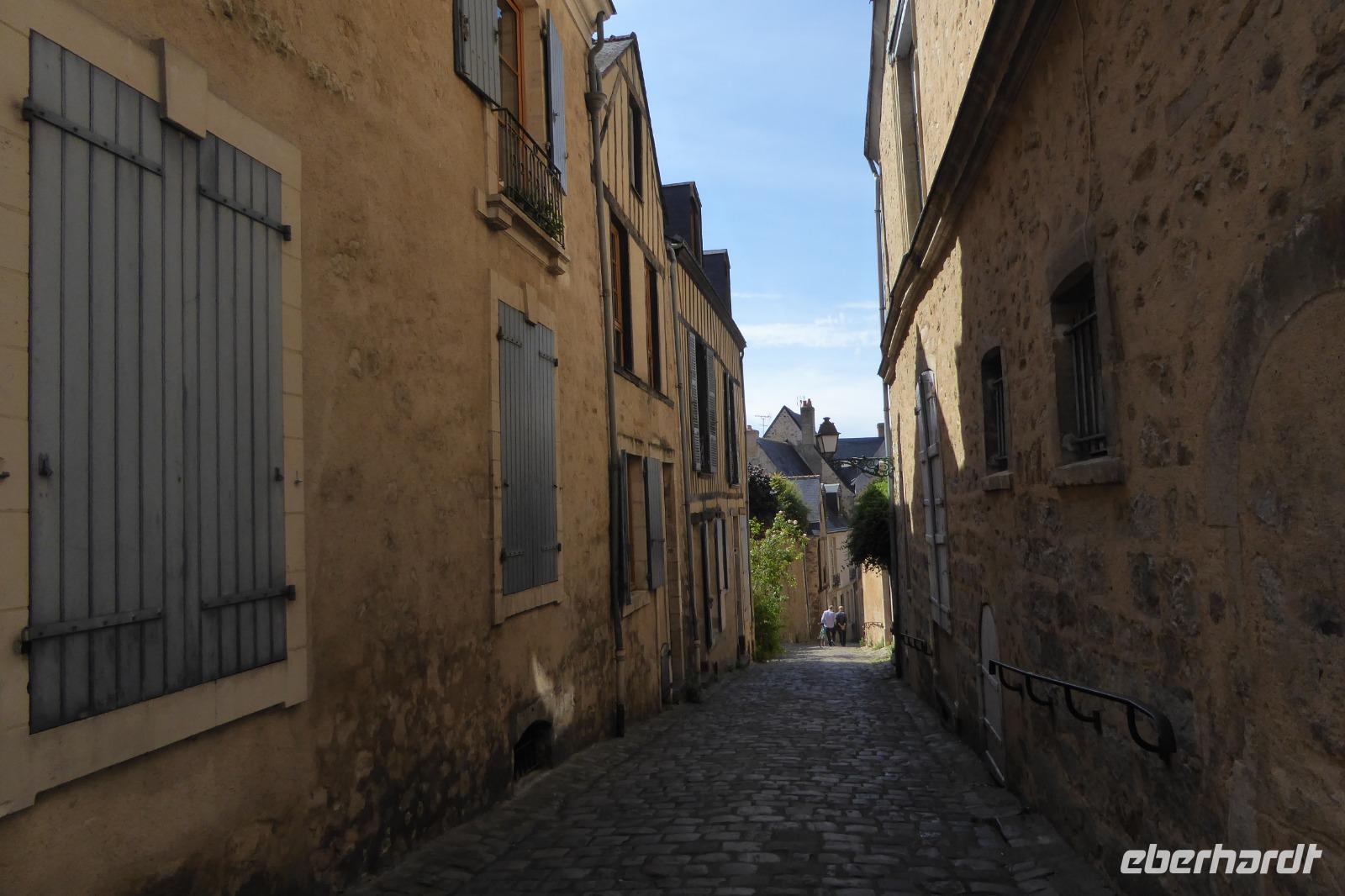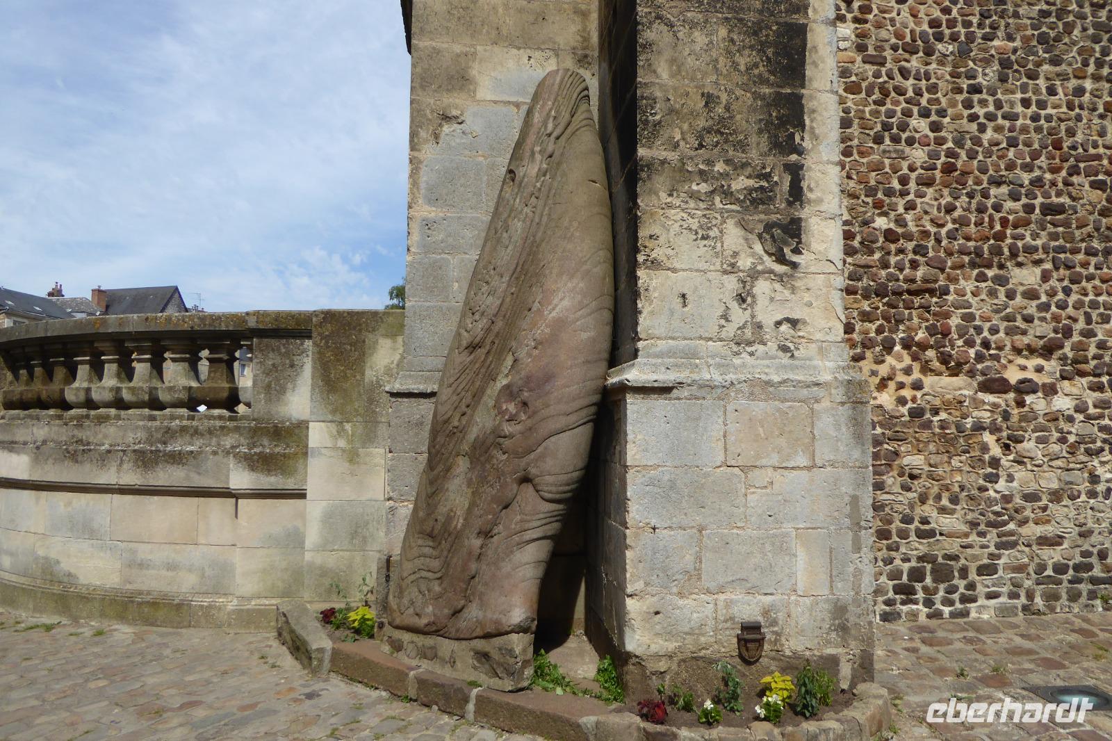 Am frühen Nachmittag erreichten wir Le Mans und beschloßen kurzer Hand, auch diese wunderschöne Stadt zu besuchen. Allein der Name lässt die Herzen der Rennsportfans höher schlagen, denn hier wird seit fast 100 Jahren mit dem 24- Stunden Rennen Rennsportgeschichte geschrieben, wenn die Boliden mit Spitzengeschwindigkeiten bis 340 Stundenkilometern über die Piste fliegen. Wir bummelten entschieden gemächlicher entlang der Sarthe und bewunderten die gewaltige römische Stadtmauer aus dem 3. Jahrhundert, die ursprünglich 1300 Meter lang und mit 26 befestigten Türmen bewehrt war. Trotz des Wehrcharakters, die Mauer hielt den Bretonen wie den Wikingern stand, wirkt das Gebäude durch seine farblich abgesetzten Zierfriese eher leicht und verspielt. Hoch über der Stadt thront die Kathedrale St. Julien, auf einem Hügel, auf dem bereits die Kelten siedelten. Dort oben, genau vor der Kathedrale hatten wir unsere erste Begegnung mit einem Menhir, dem sogenannten Milchstein, der Anlass zu launigen Scherzen bot. Nach der Besichtigung des imposanten Kirchenbaues, mit seinem romanischen Schiff, dem Chor aus dem frühen 13. Jahrhundert mit seinem eigentümlichen Strebewerk, das unerwarteten Lichteinfall ermöglicht, und der Marienkapelle mit den musizierenden Engeln aus dem 14. Jahrhundert drängte es uns wieder hinaus in die nachmittägliche Sonne. In den Gassen wurden berühmte Mantel- und Degenfilme wie "Cyrano de Bergerac" mit Gérard Depardieu und "Der Mann mit der Eisernen Maske" mit Hollywoodstar Leonardo di Caprio gedreht. Heute ging es friedlich zu, ein Flohmarkt mit buntem Angebot lockte die Flaneure.