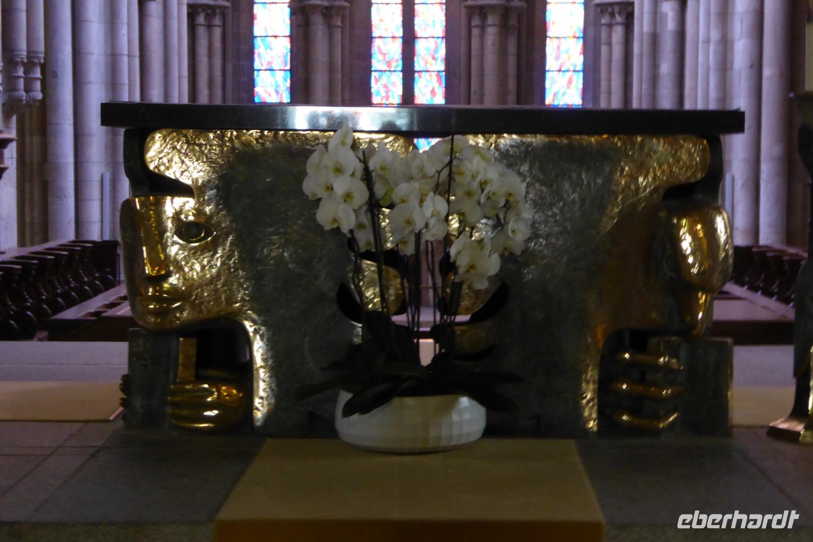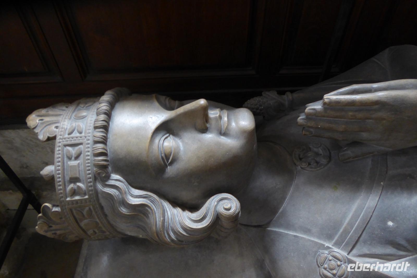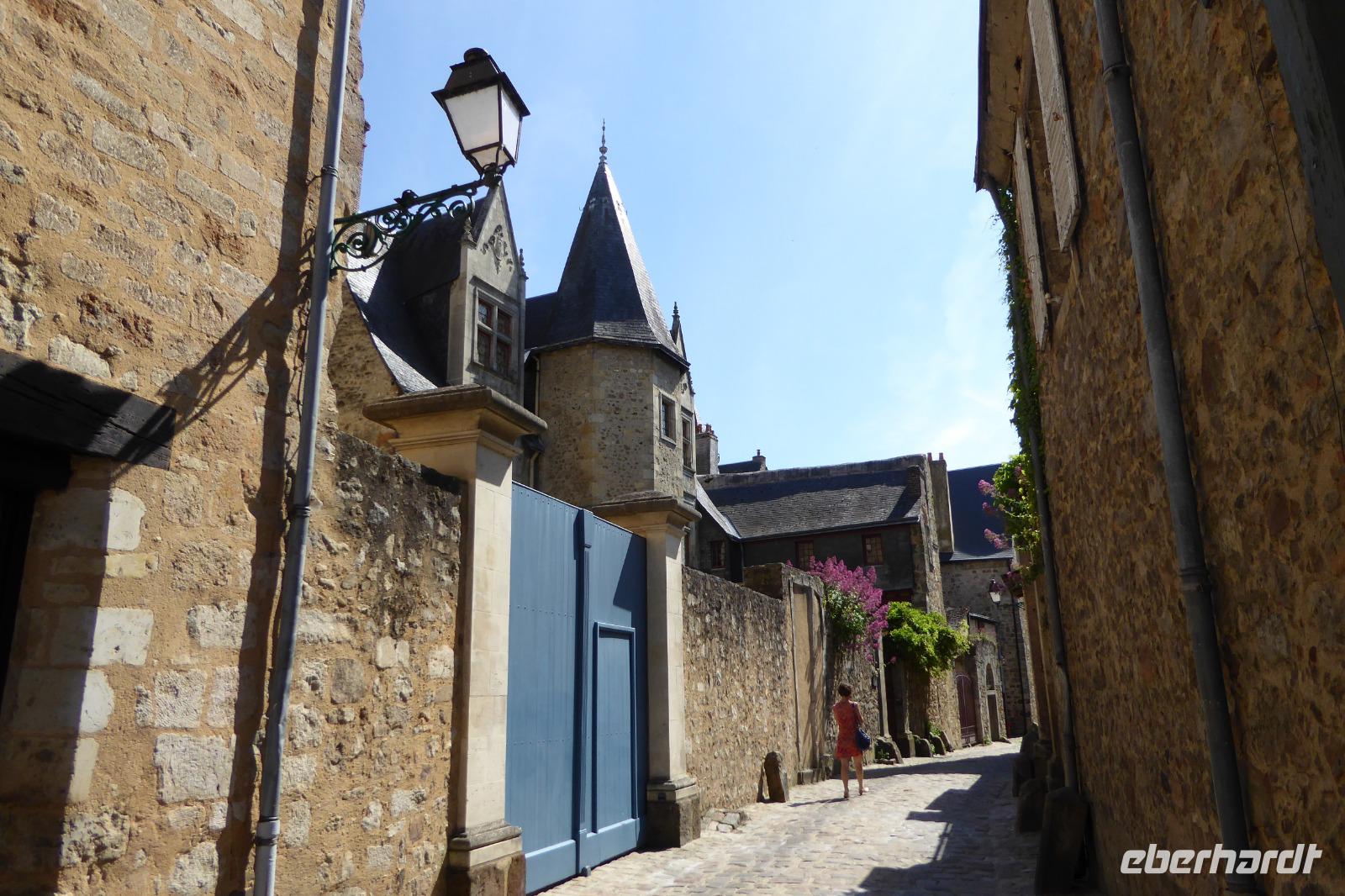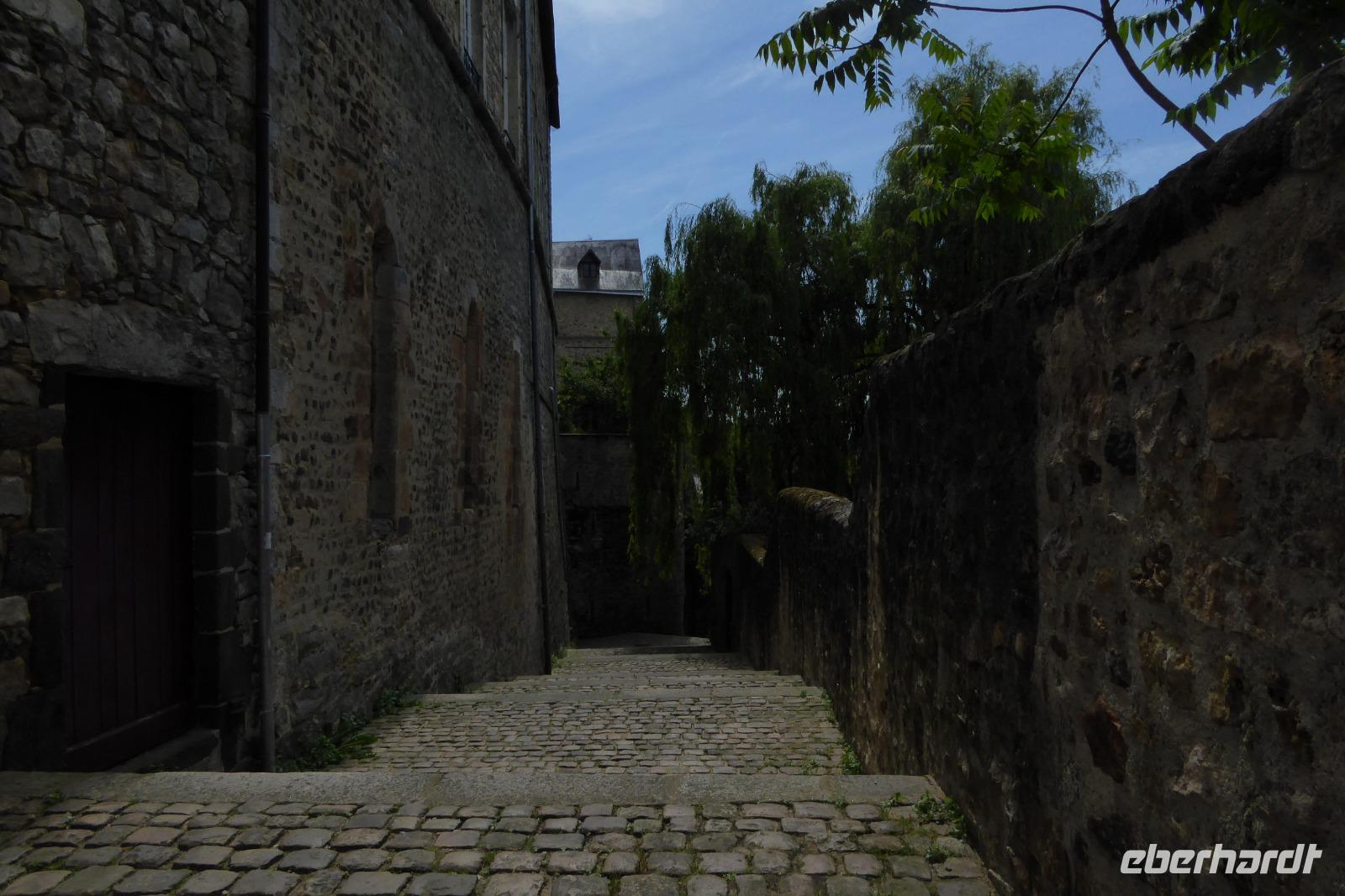 Am frühen Nachmittag erreichten wir Le Mans und beschloßen kurzer Hand, auch diese wunderschöne Stadt zu besuchen. Allein der Name lässt die Herzen der Rennsportfans höher schlagen, denn hier wird seit fast 100 Jahren mit dem 24- Stunden Rennen Rennsportgeschichte geschrieben, wenn die Boliden mit Spitzengeschwindigkeiten bis 340 Stundenkilometern über die Piste fliegen. Wir bummelten entschieden gemächlicher entlang der Sarthe und bewunderten die gewaltige römische Stadtmauer aus dem 3. Jahrhundert, die ursprünglich 1300 Meter lang und mit 26 befestigten Türmen bewehrt war. Trotz des Wehrcharakters, die Mauer hielt den Bretonen wie den Wikingern stand, wirkt das Gebäude durch seine farblich abgesetzten Zierfriese eher leicht und verspielt. Hoch über der Stadt thront die Kathedrale St. Julien, auf einem Hügel, auf dem bereits die Kelten siedelten. Dort oben, genau vor der Kathedrale hatten wir unsere erste Begegnung mit einem Menhir, dem sogenannten Milchstein, der Anlass zu launigen Scherzen bot. Nach der Besichtigung des imposanten Kirchenbaues, mit seinem romanischen Schiff, dem Chor aus dem frühen 13. Jahrhundert mit seinem eigentümlichen Strebewerk, das unerwarteten Lichteinfall ermöglicht, und der Marienkapelle mit den musizierenden Engeln aus dem 14. Jahrhundert drängte es uns wieder hinaus in die nachmittägliche Sonne. In den Gassen wurden berühmte Mantel- und Degenfilme wie "Cyrano de Bergerac" mit Gérard Depardieu und "Der Mann mit der Eisernen Maske" mit Hollywoodstar Leonardo di Caprio gedreht. Heute ging es friedlich zu, ein Flohmarkt mit buntem Angebot lockte die Flaneure.