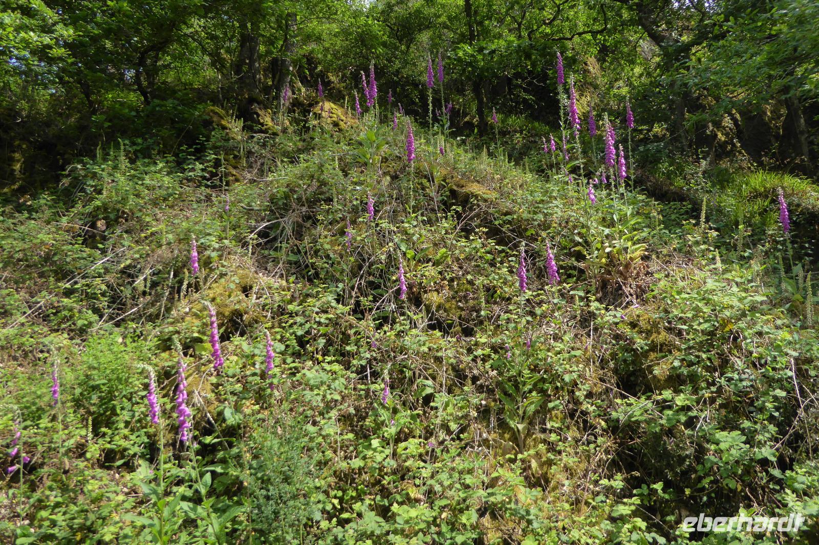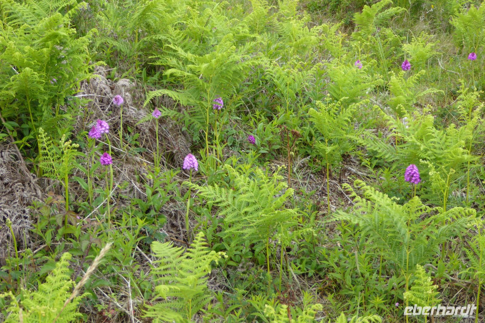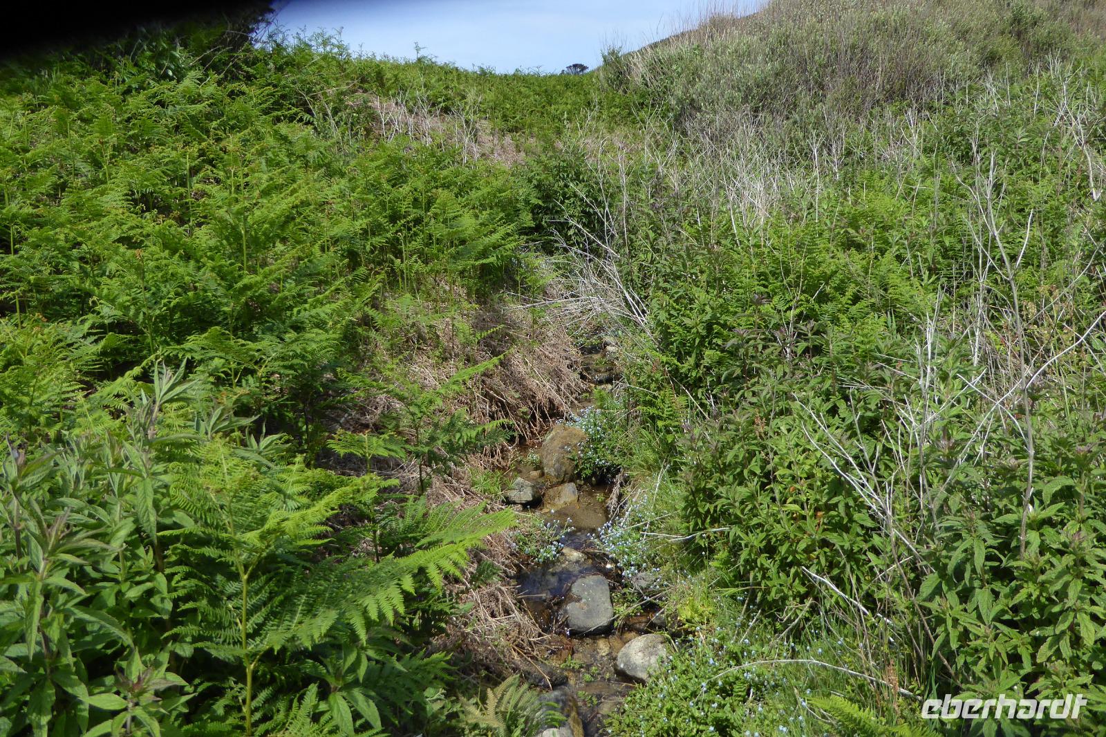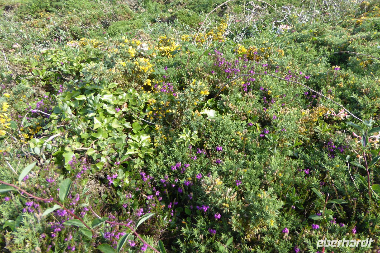 Umgeben von Tamarisken liegt das kleine Kirchlein Notre Dame de Bon Voyage inmitten eines Waldes hoher Farne wie eine Glucke auf den Klippen. Gleich dahinter treffen wir wieder auf den Wanderweg GR 34, der auf 1700 Kilometer um jede Klippe, jede Bucht der Bretagne vom Mont Saint-Michel bis nach Saint-Nazaire führt. Der Gesang der Feldlerchen begleitete unseren Weg zur Steilküste und längs des Weges blühten Erika, Geißblatt, Stachelginster, Fingerhut, Berg-Sandglöckchen, Knabenkraut und Umbilicus, der sonst eher unscheinbare Venusnabel. Wir genoßen bei unserer gut 16 Kilometer langen Wanderung die herrlichen Ausblicke auf das tiefblaue Meer und die schneeweiß schäumende Gischt. Möwen und Kormorane zeigten ihre Flugkünste. Die üppige stets wechselnde Flora, die Felsformationen und plötzlich aus den Farnen springende Quellen boten dem Auge wie der Linse immer neue unerwartete Attraktionen. An der Pointe du Raz (der Name kommt von rasen, nicht von rasten!) dem westlichsten Punkt unserer Reise und dem nicht ganz westlichsten Punkt Europas legten wir dort eine Mittagsrast ein, wo 72 Meter unter uns der Atlantik an die Felsen brandet. Über die hier beginnende Fernwanderroute E5 erreicht man in etwas mehr als 3000 Kilometer das Mittelmeer bei Venedig- wir schlugen die andere Richtung ein und marschierten bis in die tropenhaft anmutende Sandbucht Baie des Trépassés. Dort hatten wir dann noch die Begegnung mit der Fauna der Region: eine seltene Aspisviper schlummerte im Gebüsch.