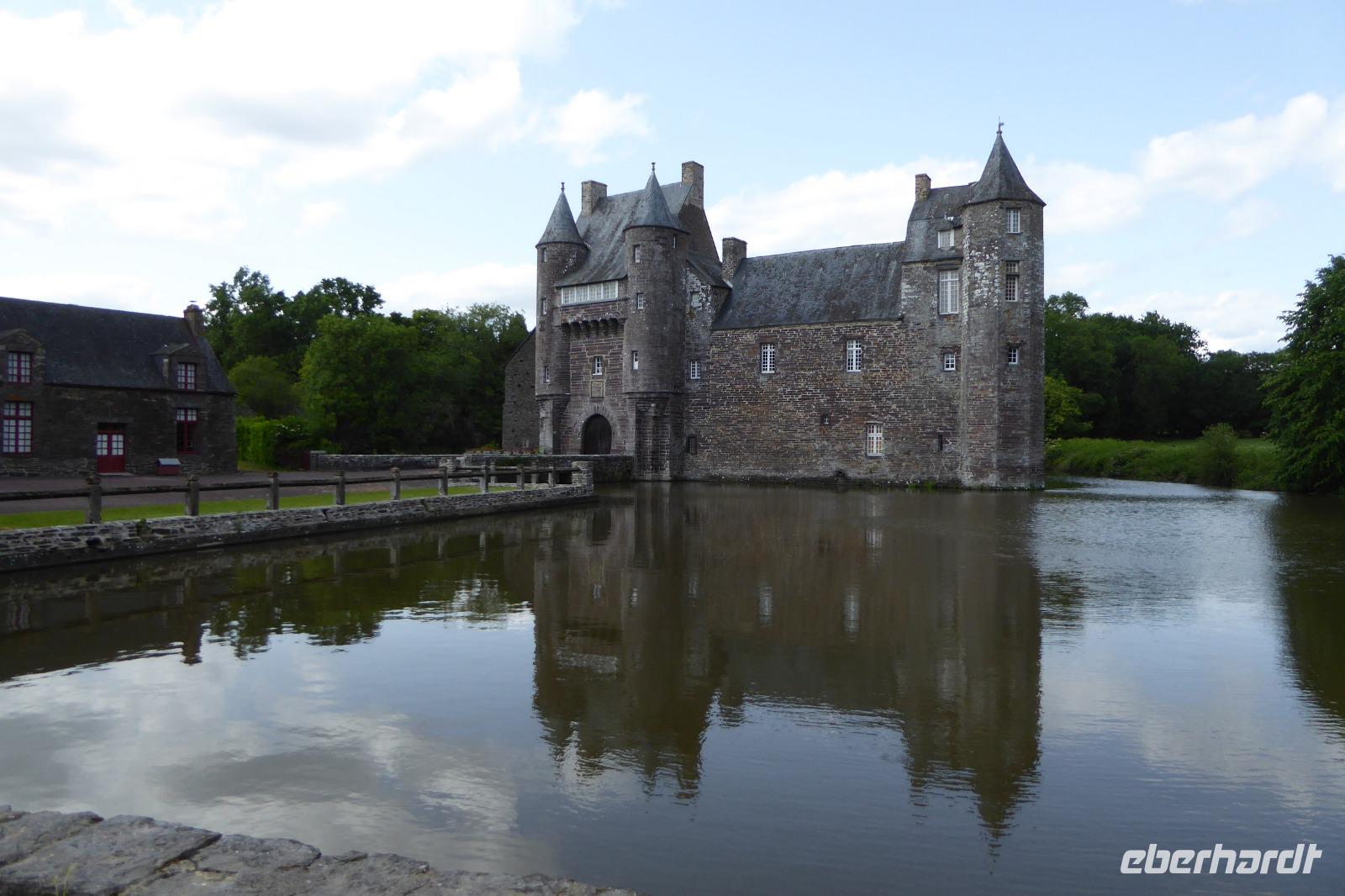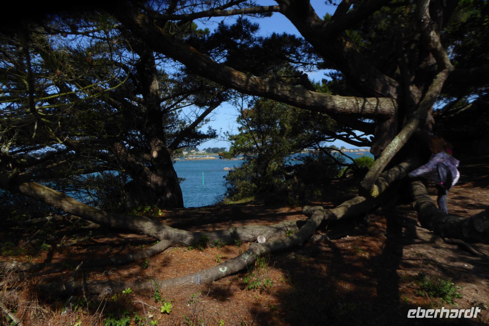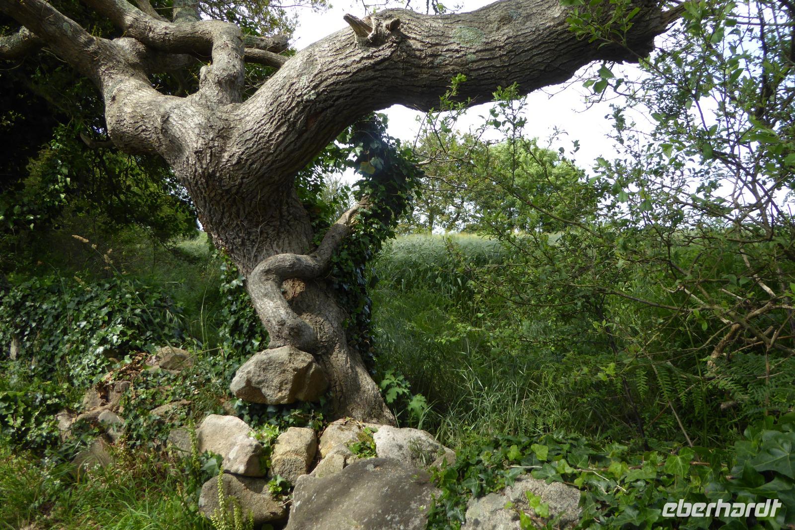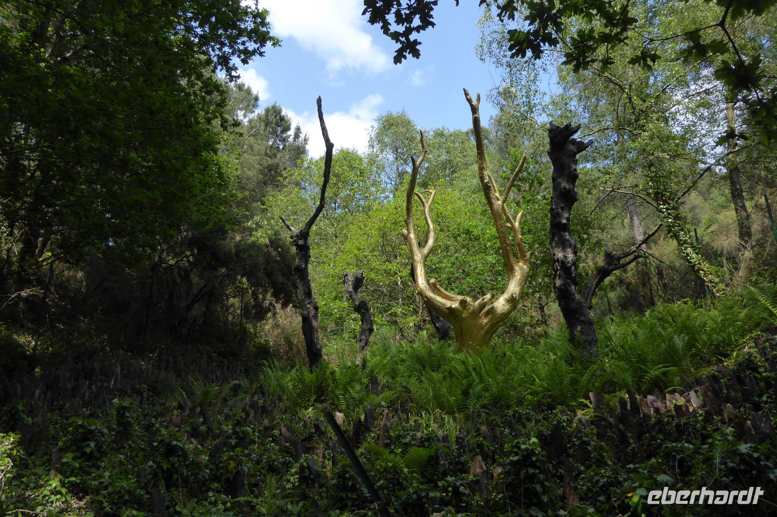 Nach einer gemütlichen Mittagsrast in Tréhorenteuc bestaunten wir die Glasfenster in der kleinen Kirche und waren von der seltsamen Mischung christlicher und mystischer Motive überrascht. Das Tal ohne Wiederkehr entließ uns reichlich zwei Stunden später wieder; nach einem Aufstieg auf das Hochplateau führte unsere Wanderung zum Arbre d´Or, dem goldenen Baum, einem Kunstobjekt des französischen Bildhauers Francois Davin aus dem Jahre 1991. Am Wasserschloß von Trécesson endete unser erster gemeinsamer Wandertag.