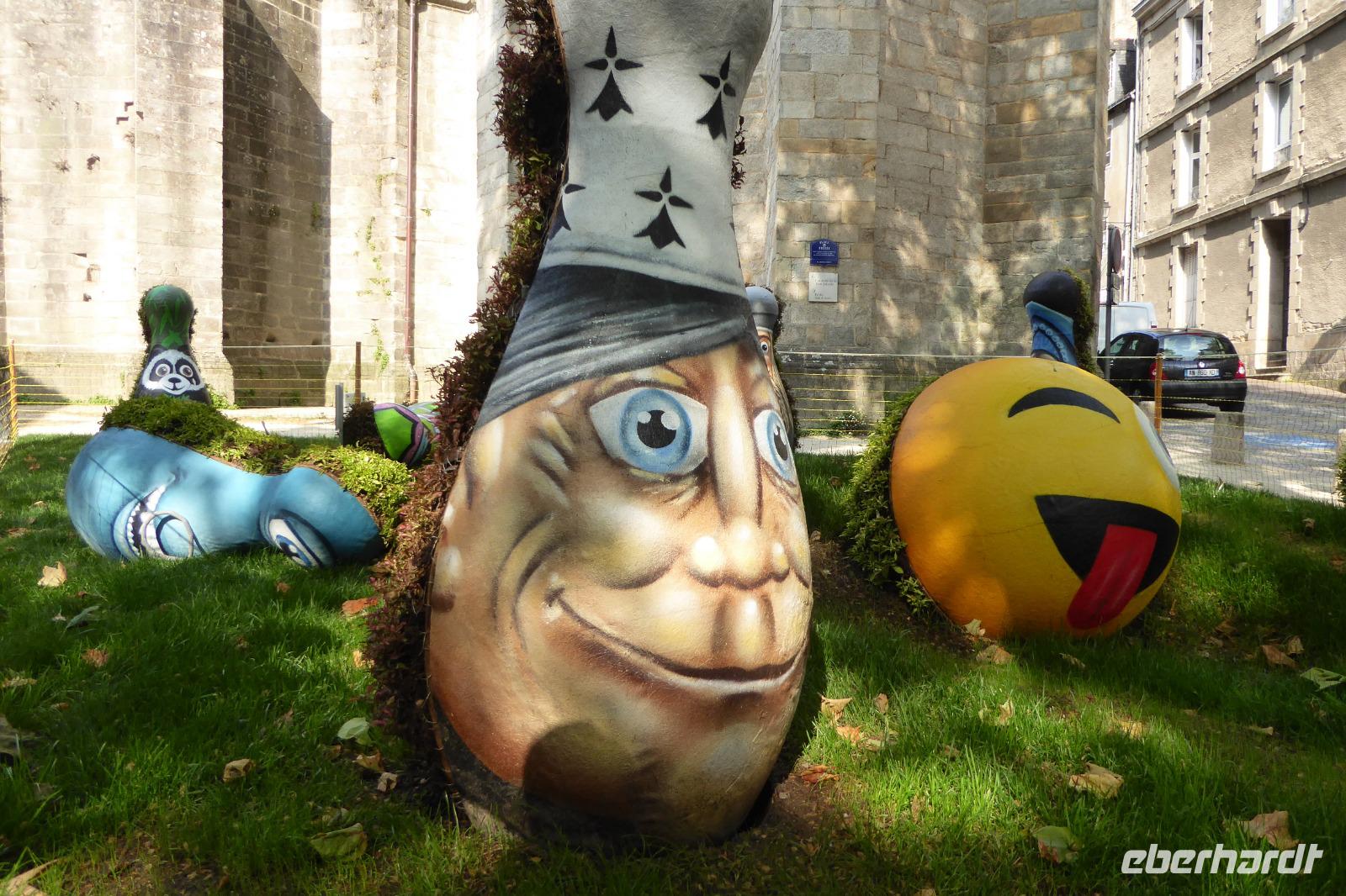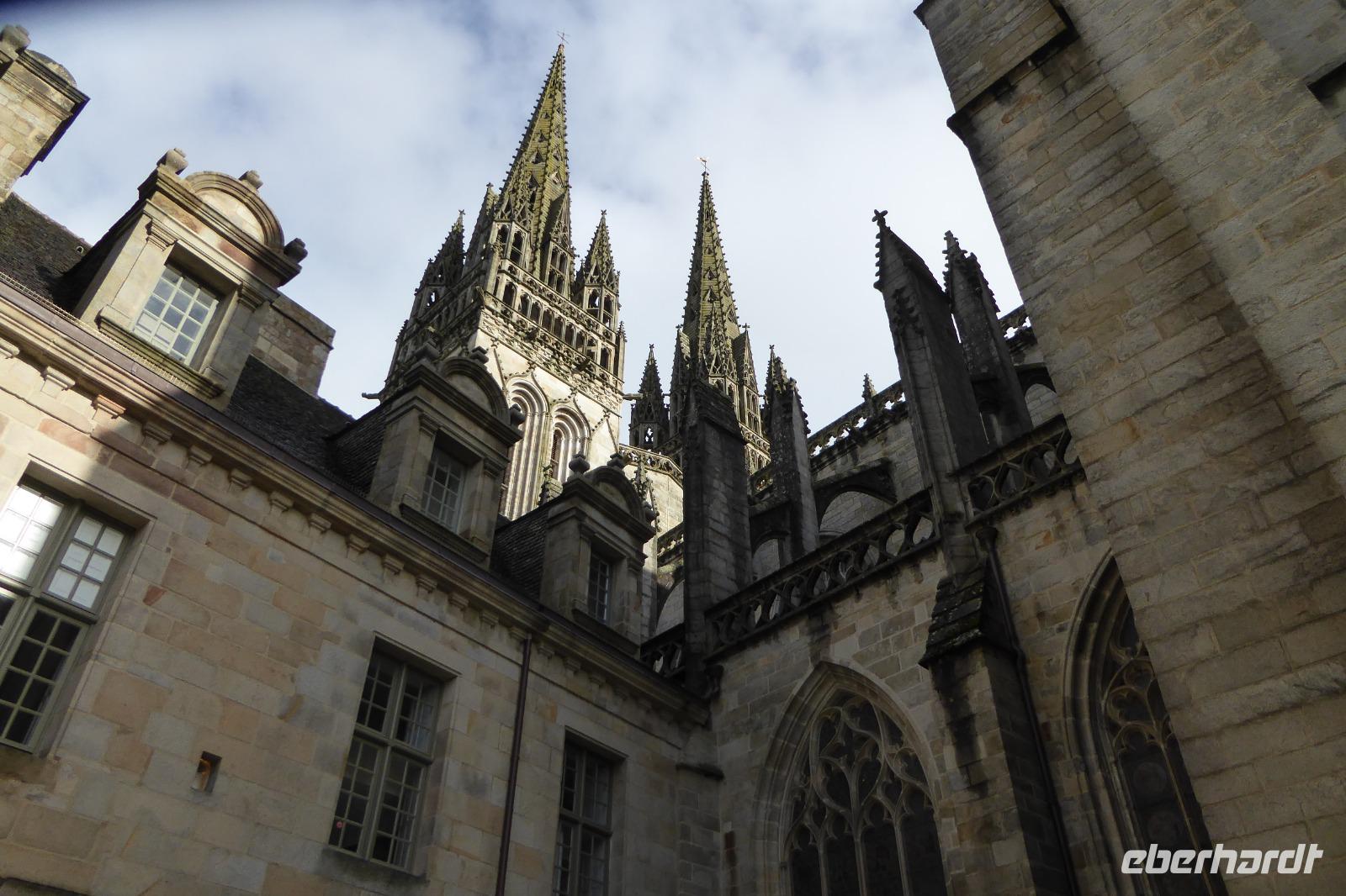 Heute Morgen wollten wir uns noch Quimper genauer ansehen und gingen entlang der Odet zur Kathetrale St. Corentin, wo wir mit unserer Stadtführerin Yolande verabredet waren. Ähnlich wie Rom liegt die Stadt auf sieben Hügeln. Drei Flüße treffen sich hier und bis zum Meer sind es nur wenige Kilometer. Quimper ist die Hauptstadt der Cornouaille und Yolande würzte uns die Geschichte der Stadt mit vielen Details und lustigen persönlichen Anekdoten.