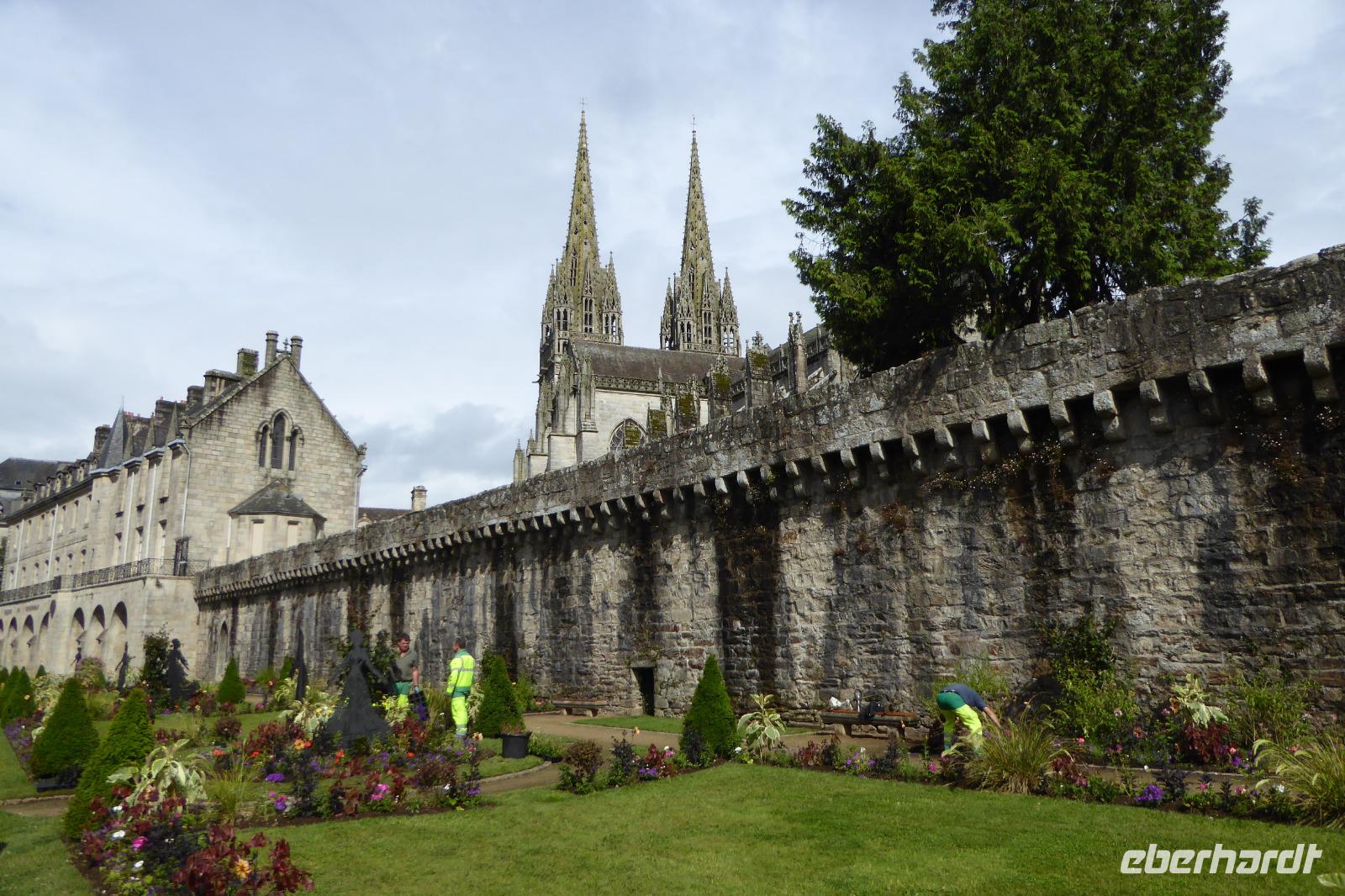 Wir spazierten durch die Gassen der Altstadt mit ihren wunderschönen Fachwerkhäusern, verweilten am Buttermarkt mit seinen vielen Crêperien, bewunderten die frischen Meerestiere und das bunte Angebot in der Markthalle, bevor wir das Innere der Kathedrale Saint Corentin besichtigten. Mehr als 600 Jahre mussten vergehen, bis das Gotteshaus seine heutige Gestalt erhielt. Auffallend ist der leicht abgeknickt gebaute Chor, der viel Raum für Spekulationen lässt, doch in dieser Form baugeschichtlich einzigartig ist. Viel zu schnell verging die Zeit und wir verließen Quimper und fuhren weiter in den Norden Richtung Lannion.