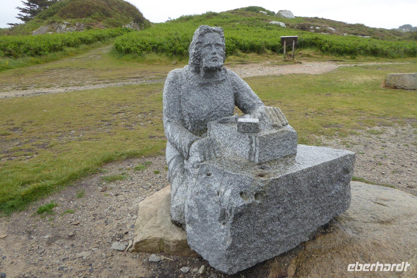 Angekommen auf der Ile Grande stiefelten wir tapfer los, mit dem festen Vorsatz die Insel zu umrunden. Ein Denkmal an der Küste erinnert an die schwere Arbeit der Männer in den Steinbrüchen, die hier an der Côte d´Armor den begehrten rosa Granit abbauten. Kurz vor der Vogelschutzstation im Norden der Insel zwang uns der stärker werdende Regen und der heftige Wind zur Umkehr und weder Basstölpel noch Papageientaucher waren zu sehen.