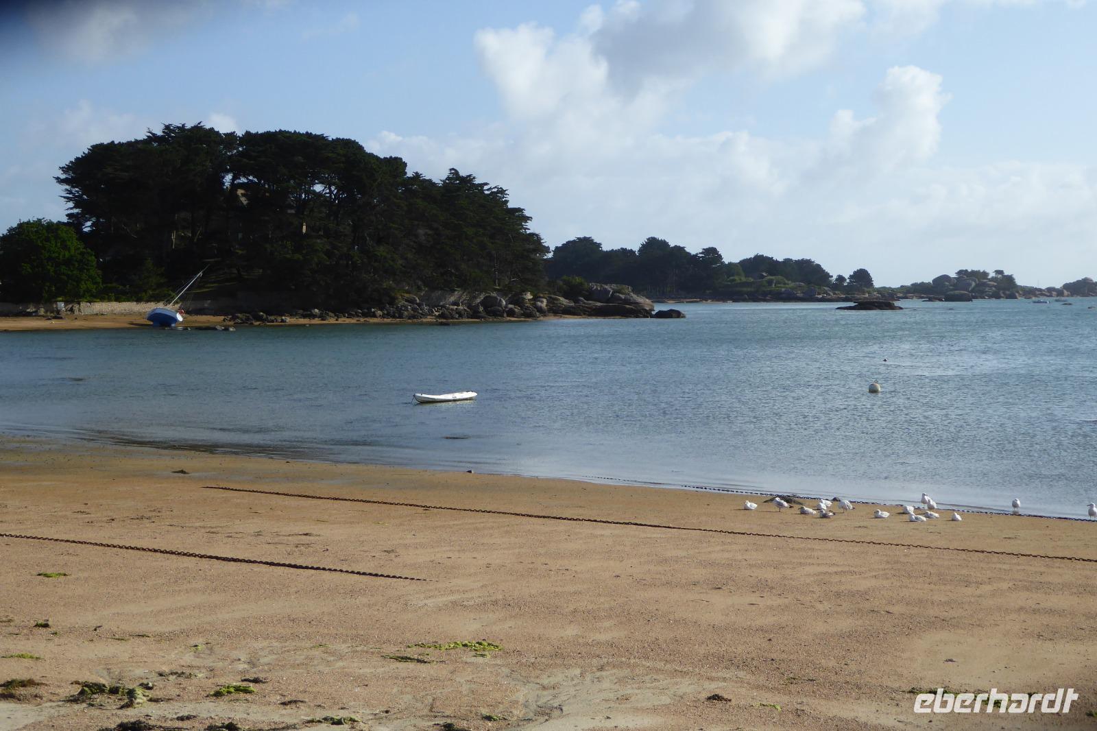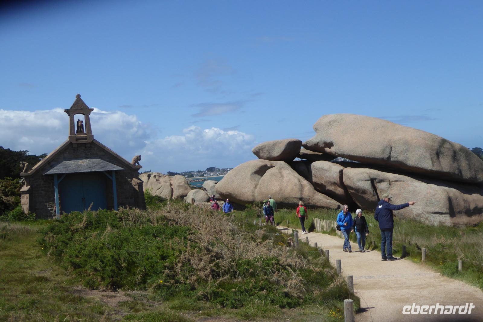 Schlafende Riesen schnarchen am Wegesrand und wir gehen über den alten Zöllnerpfad, der uns immer wieder herrliche Ausblicke auf das Meer und die vorgelagerten Inselchen bietet. Das neogotische Schloss auf der Insel Costaérès ist übrigens der Zweitwohnsitz von Didi Hallervorden. Die ganze Wanderung war ein einziges Spiel der Farben: der rosa Granit, der tiefblaue Himmel, das Smaragdgrün des Meeres dunkelgrüne Koniferen und dazu die blau- violett blühenden Hortensien. Mitten am Strand von Ploumenac´h, heute vom Meer umspült, steht ein kleines Oratorium mit der Statue des Heiligen Guirec. Eine Nadel in seine Nase gestochen, soll heiratswilligen jungen Mädchen einen Ehemann bescheren. Kein Wunder, bei der Beanspruchung, dass die alte Holzstatue längst in massiven Stein ausgetauscht wurde. Am Leuchtturm kletterten wir über die baren Felsen. Unter uns toste das Meer. In der nächsten Bucht nutzte eine Robbe das ruhigere Wasser zum Fische fangen. Nach zwei weiteren Stunden erreichte unsere starke Wandergruppe den herrlich weißen Sandstrand von Trestraou. Der Strand lud ein zum Verweilen und so verbrachten wir unsere Zeit mit Sonnenbaden, Strandlaufen und Eisessen, bevor es wieder Zeit wurde, den Bus zu besteigen.