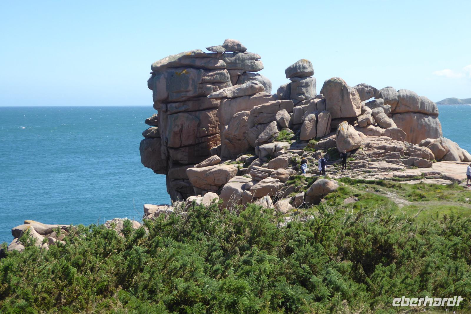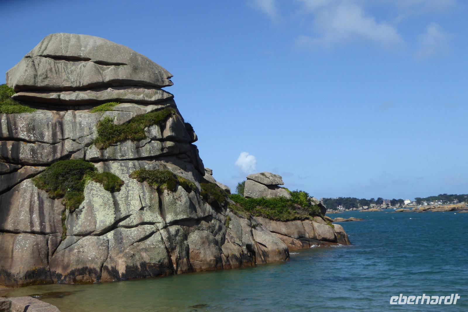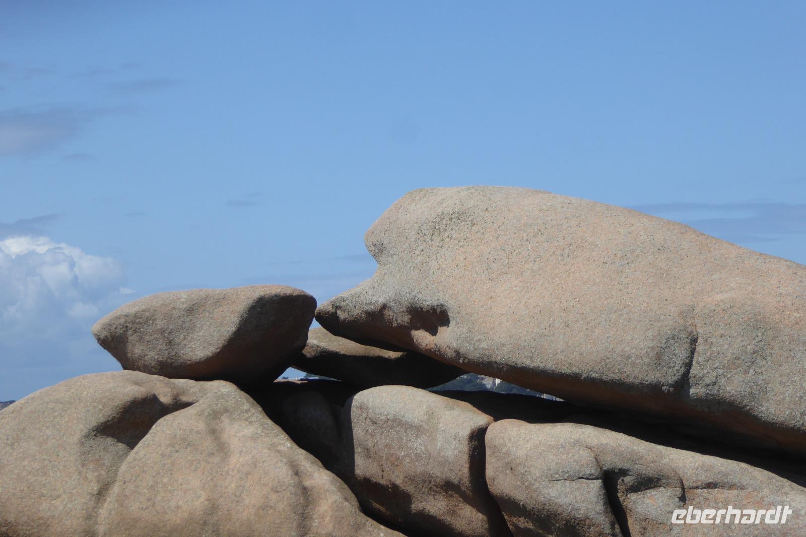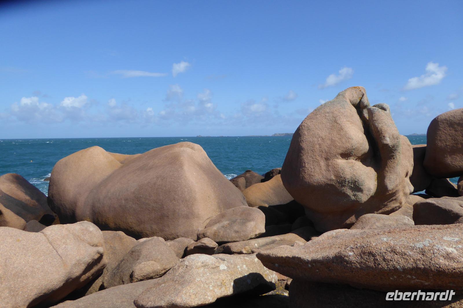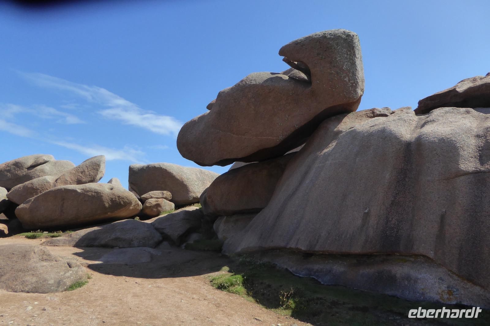 Der Regen war wie weggefegt und wir starteten die längste und wohl schönste Wanderung unserer Reise bei herrlichem Wetter und angenehmen Temperaturen knapp unter 20°. Erst wanderten wir den Strand entlang und durch die eleganten Villenviertel von Trégastel, vorbei an den beiden Wassermühlen von Ploumanac´h. Übrigens, gleich hinter dem kleinen See dort zweigt das Traouiero Tal ab, das im sechsten Band der Romane um Kommissar Dupin, 'Bretonisches Leuchten', eine wichtige Rolle spielt. Hier begann dann der geologisch interessanteste Teil der Route. Vor 300 Millionen Jahren sind diese Steine entstanden, die, wie von Riesenhand geworfen, bizarre Formationen bilden. Bei der Interpretation der Gebilde sind keine Grenzen gesetzt: sieht man hier nicht einen großen Stapel Crêpes und sieht das nicht aus, wie ein Schwarzwälder Bollenhut? Und da hinten, ist das nicht ein riesiger Igel?