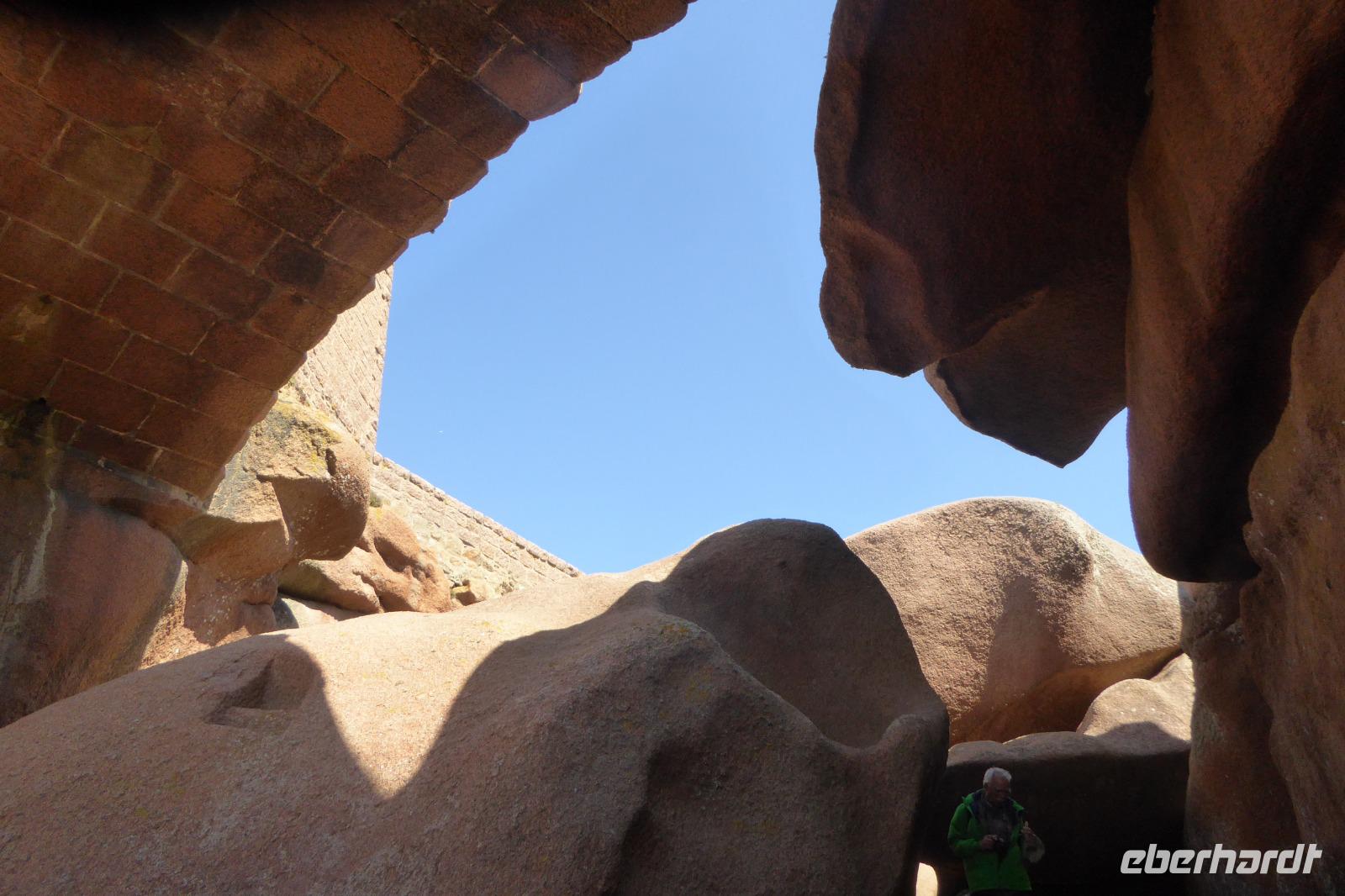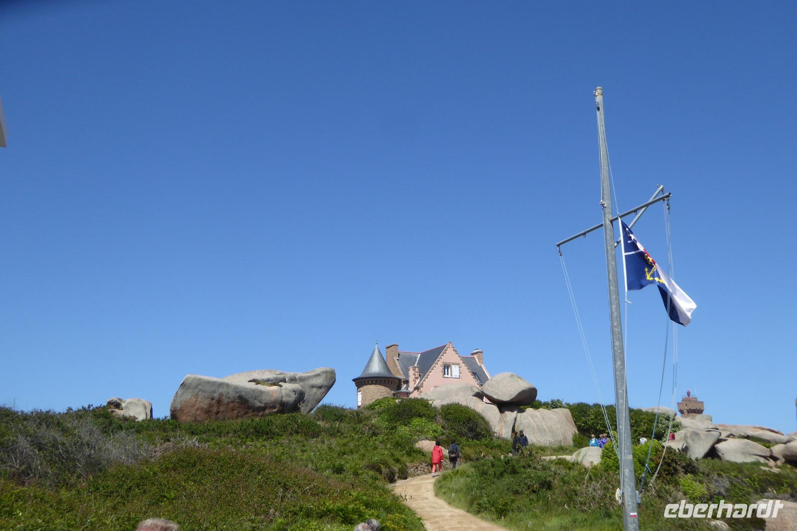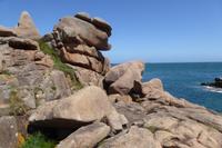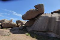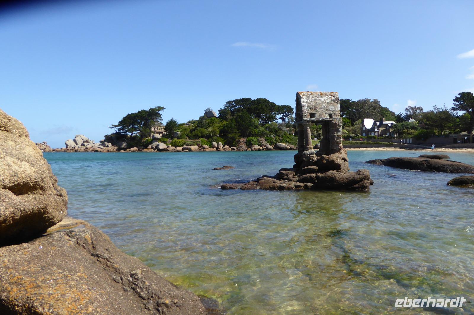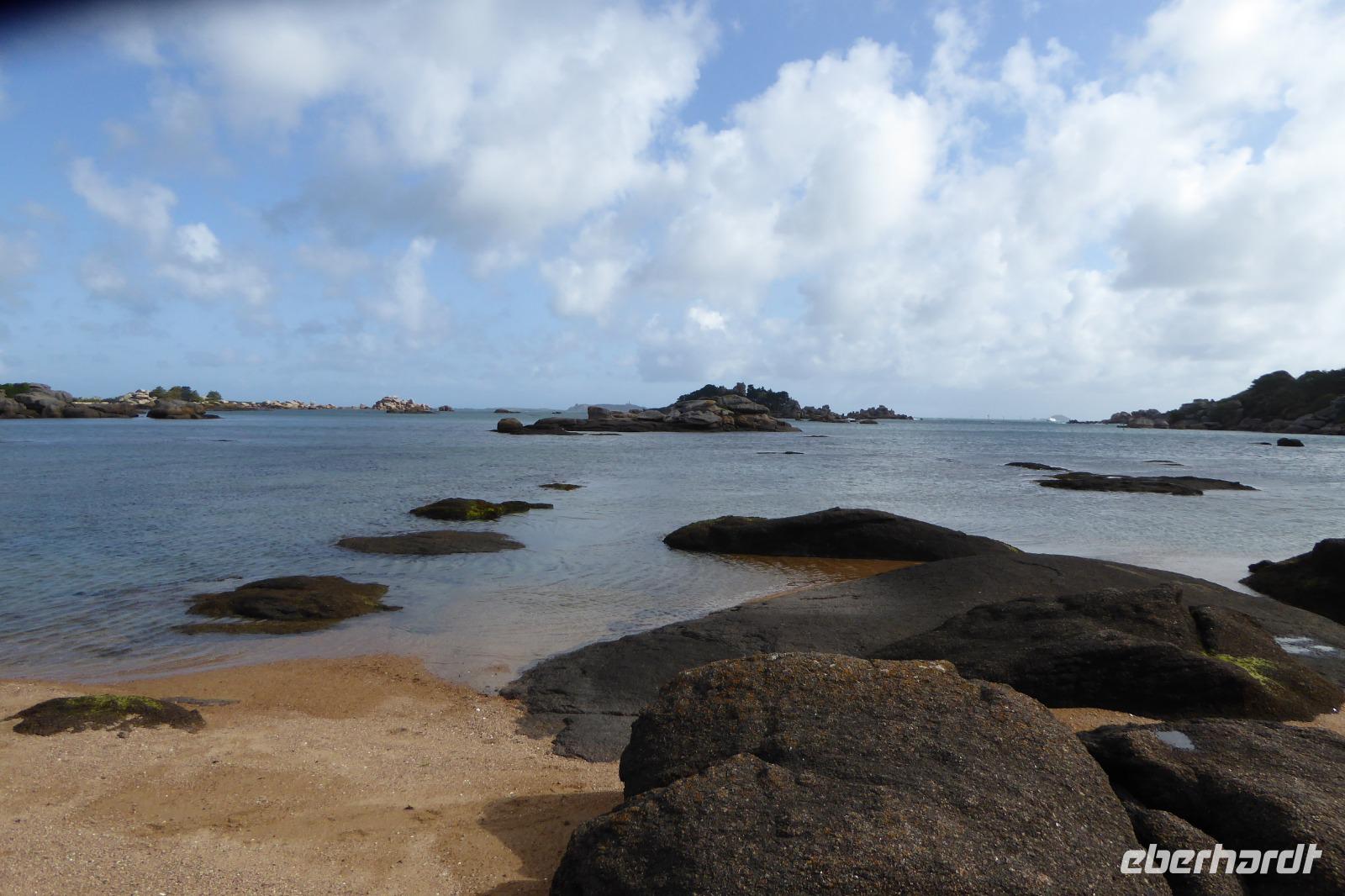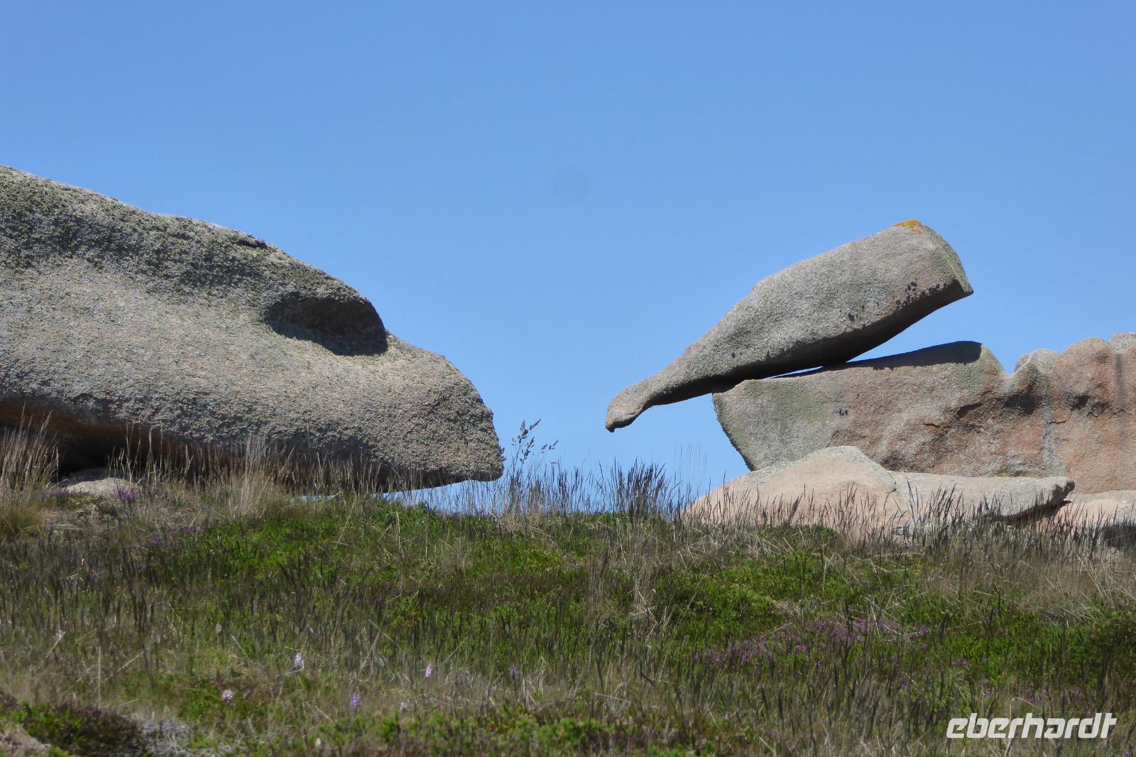 Der Regen war wie weggefegt und wir starteten die längste und wohl schönste Wanderung unserer Reise bei herrlichem Wetter und angenehmen Temperaturen knapp unter 20°. Erst wanderten wir den Strand entlang und durch die eleganten Villenviertel von Trégastel, vorbei an den beiden Wassermühlen von Ploumanac´h. Übrigens, gleich hinter dem kleinen See dort zweigt das Traouiero Tal ab, das im sechsten Band der Romane um Kommissar Dupin, 'Bretonisches Leuchten', eine wichtige Rolle spielt. Hier begann dann der geologisch interessanteste Teil der Route. Vor 300 Millionen Jahren sind diese Steine entstanden, die, wie von Riesenhand geworfen, bizarre Formationen bilden. Bei der Interpretation der Gebilde sind keine Grenzen gesetzt: sieht man hier nicht einen großen Stapel Crêpes und sieht das nicht aus, wie ein Schwarzwälder Bollenhut? Und da hinten, ist das nicht ein riesiger Igel?