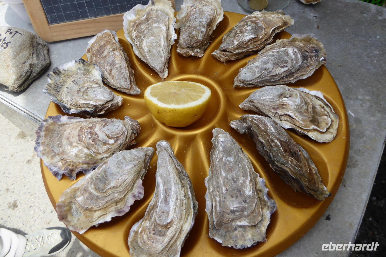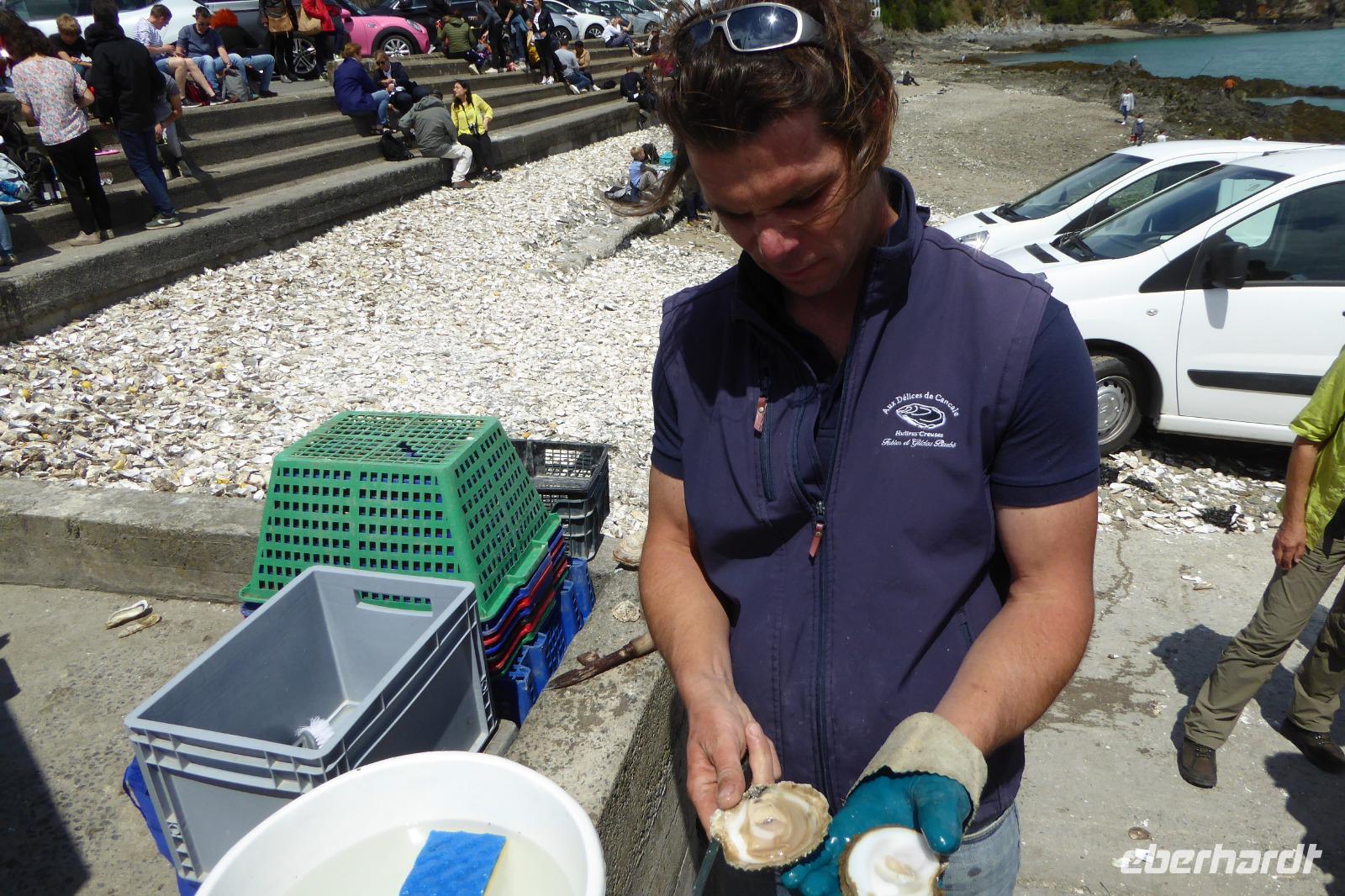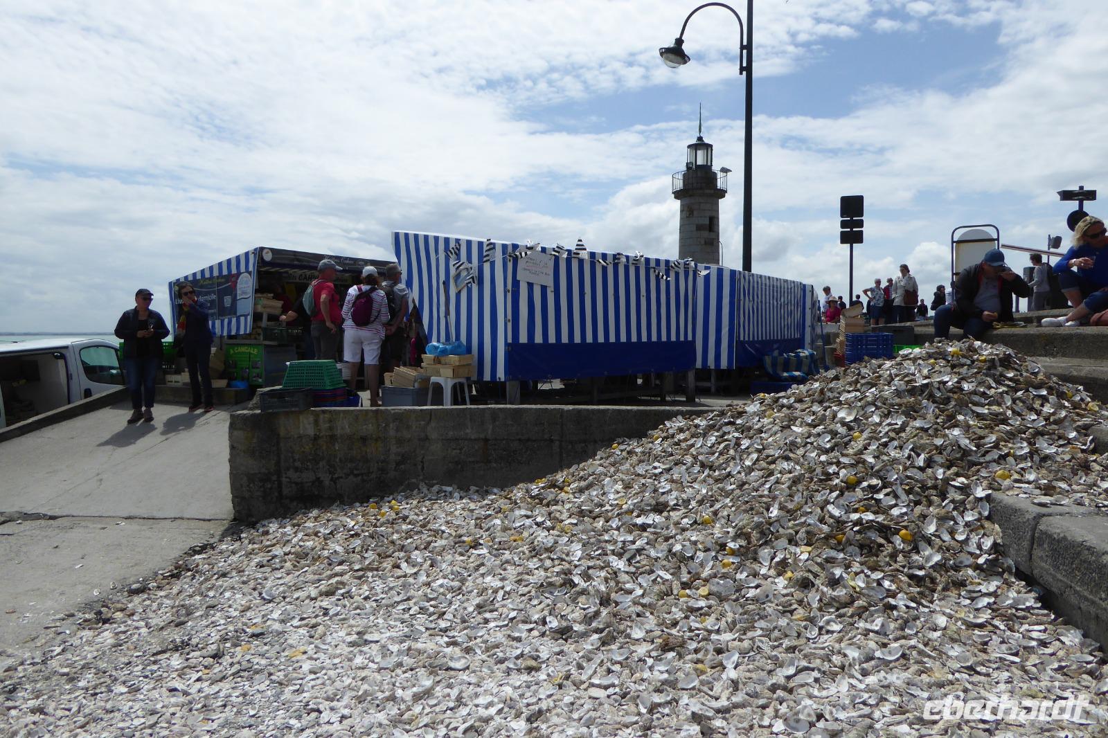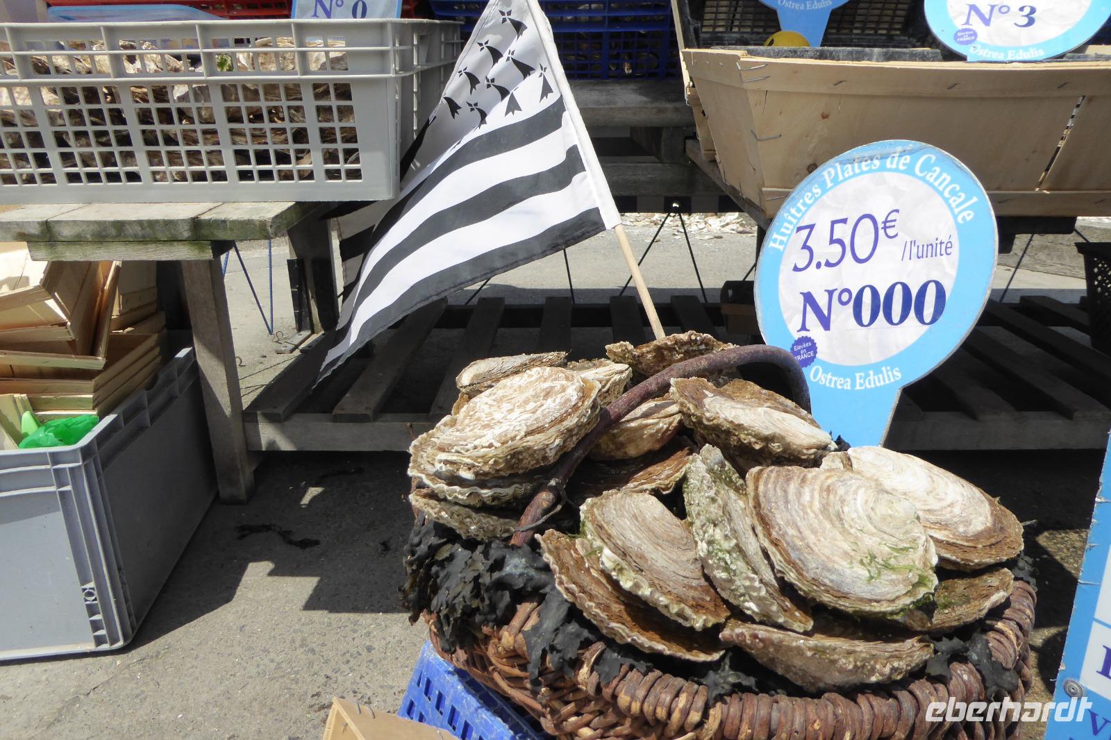 Die Austernzucht lässt sich in Cancale schon seit dem 13. Jahrhundert nachweisen. Heute beschäftigen 50 Austernzuchtbetriebe mit einem Jahresumsatz von über 4 Millionen Euro 300 Mitarbeiter und versorgen die Gourmets in aller Welt mit den besten Austern der Welt. Doch frisch genoßen sind die berühmten Austern aus Cancale doch noch immer am Besten. Wir gingen durch das sonntäglich festlich gestimmte Städtchen, vorbei an gesteckt vollen Restaurants, in denen großzügig getafelt wurde, zu den Austernständen, um uns von der Einzigartigkeit des Geschmacks der berühmten Cancaleser Austern überzeugen zu lassen. Am Anfang eher zögerlich, leisteten auch wir unseren Beitrag zur Erhöhung der Berge aus Austernschalen, die sich zu Füßen der Feinschmecker bildeten!