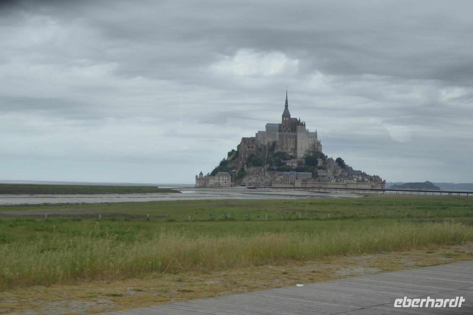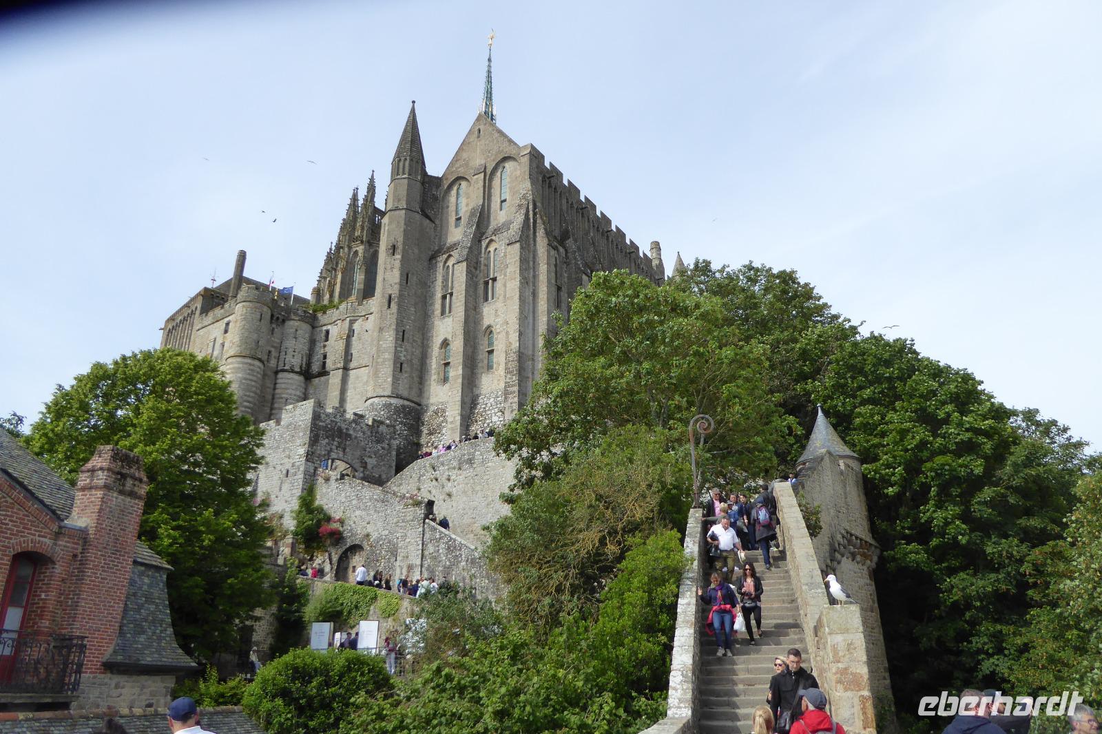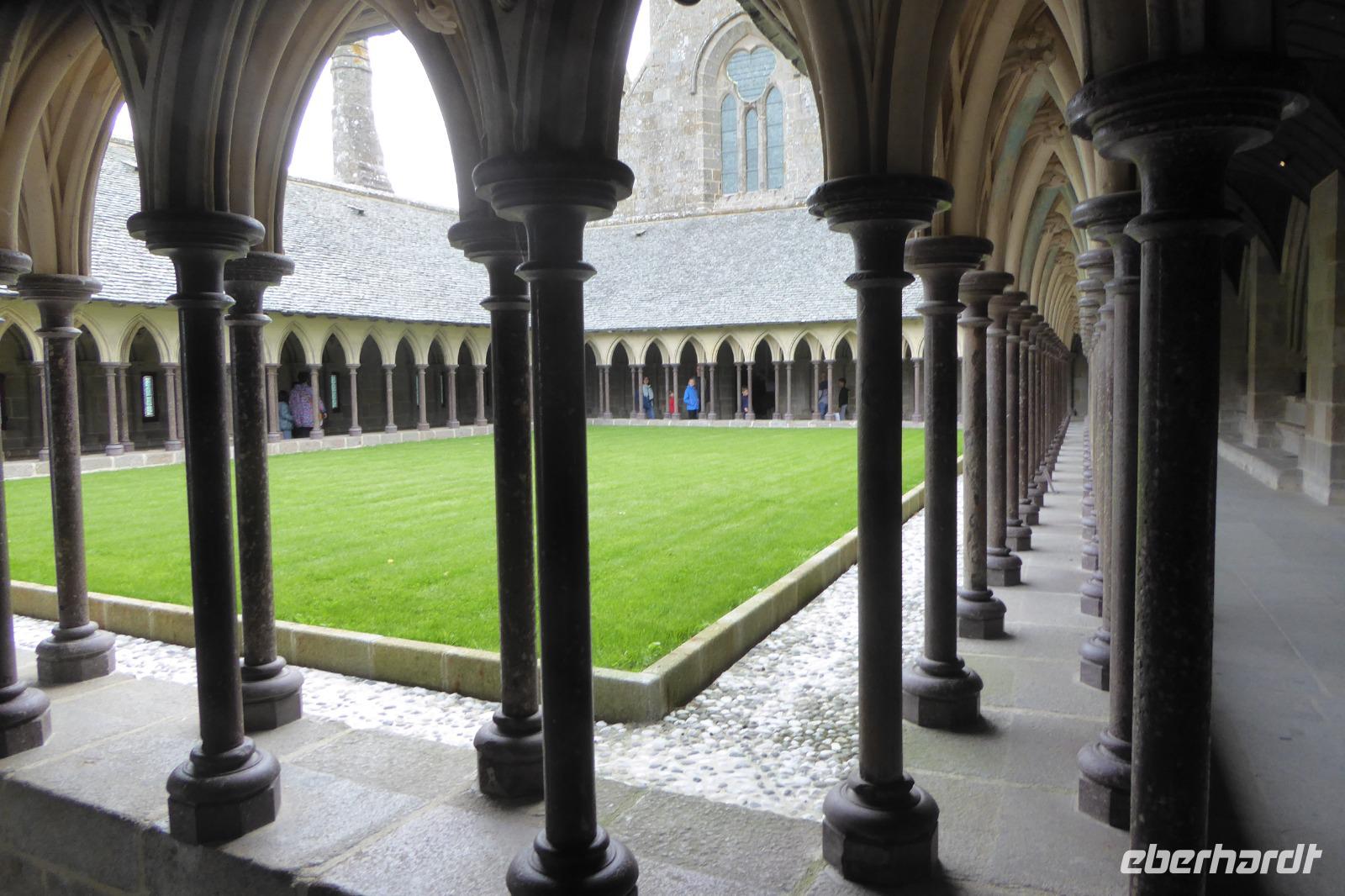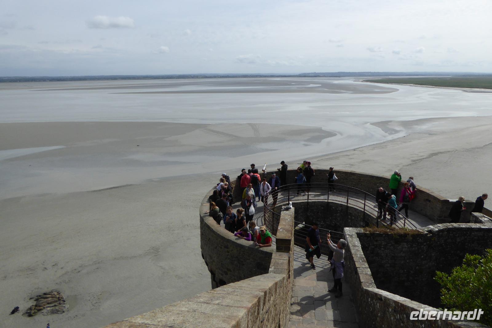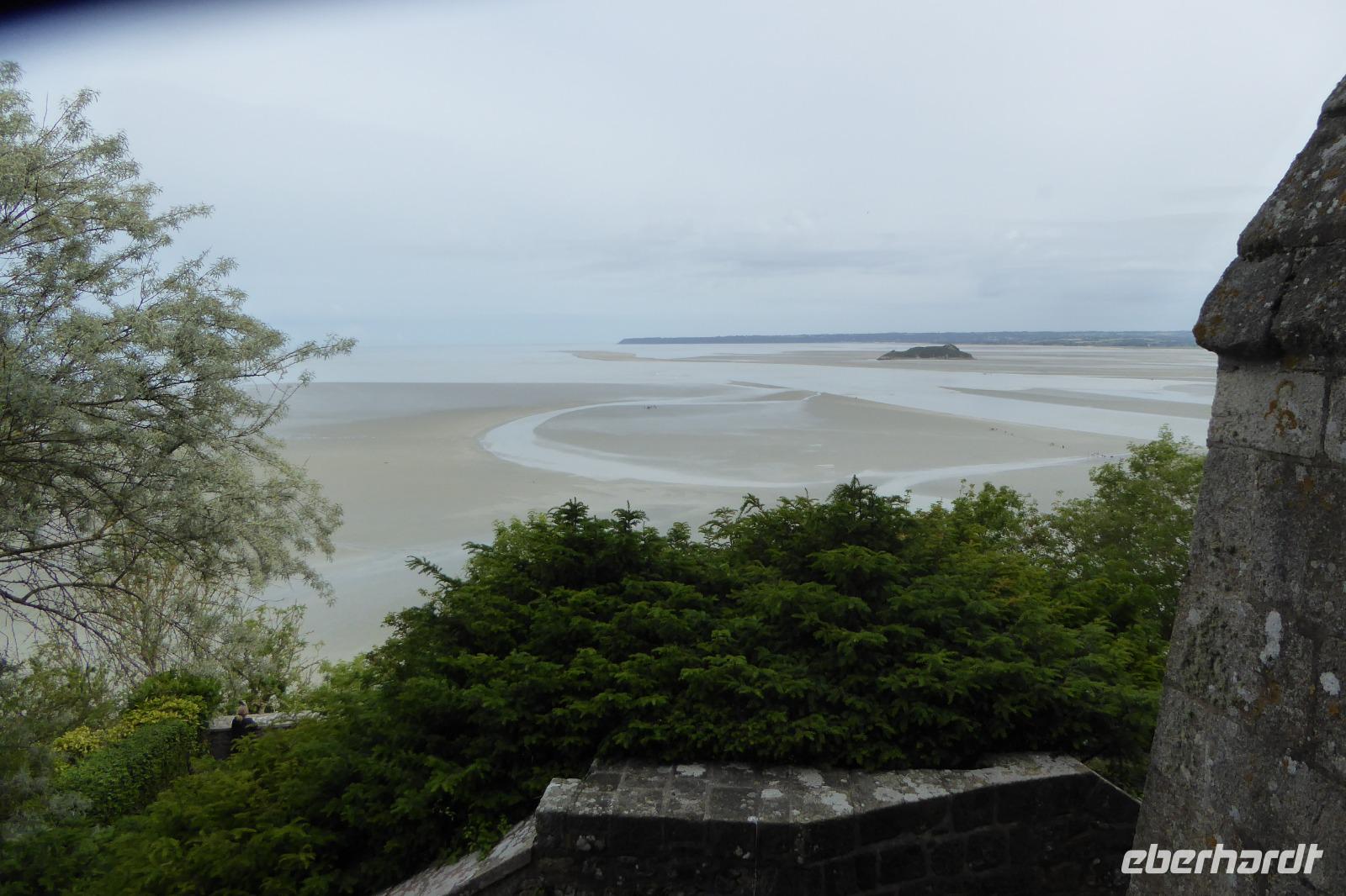 Schon früh machten wir uns auf zum Mont Saint Michel. Noch vor dem großen Ansturm erreichten wir den Inselberg, der auch bei Ebbe ein imposantes Bild bot. Um die obere Abteikirche zu erreichen müssen erst viele steile Stufen erklommen werden, doch die grandiose Aussicht von oben entschädigt für alle Mühen! Ausgerüstet mit Audioguides ließen wir uns die Geschichte der bedeutenden christlichen Wallfahrtsstätte, seit 1979 UNESCO Weltkulturerbe, erklären. Lange Jahre nach der französischen Revolution war die alte Klosteranlage ein gefürchtetes Staatsgefängnis, bevor sich Victor Hugo und andere für die Restaurierung des Ensembles stark machten. Jedes Jahr kommen mehr als drei Millionen Besucher zu dem heiligen Berg im Meer, der seit 1300 Jahren die Menschen in seinen Bann zieht. Bei unserem Rundgang über die Festungsmauern konnten wir die Wattwanderer beobachten und sahen, einer Ameisenstraße gleich, die Besuchermassen über die neue Brücke den Berg erstürmen. Glück gehabt, das frühe Aufstehen hat sich gelohnt- wir hatten den Berg noch ganz für uns und konnten selbst im Kreuzgang noch meditative Stille genießen!