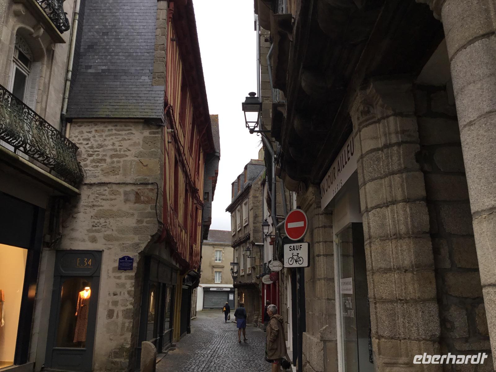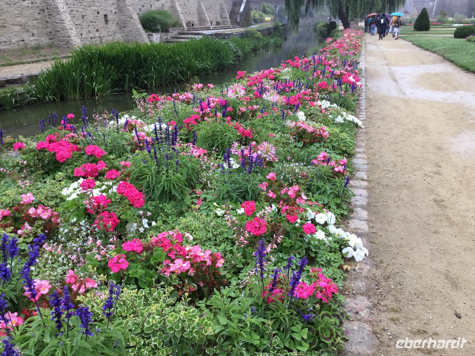Über 80 Départements Frankreich weisen Wasserknappheit auf. Warum allerdings Petrus meint ausgerechnet zu unserer Wanderreise dieses Defizit in der Bretagne ausgleichen zu wollen, bleibt uns ein Rätsel. Nach dem Frühstück holt uns Regula im Hotel zu einem Stadtrundgang durch Vannes ab. Am Golf von Morbihan gelegen, zählt die Stadt heute zu den touristischen Zielen in der Bretagne. Für die Bretonen war sie in der Geschichte von großer Bedeutung, denn sie wurde im 14. Jahrhundert zur Residenzstadt. Im 16. Jahrhundert tagte hier das bretonische Parlament. Von dieser Bedeutung zeugen heute noch das Château de l'Hermine und die mächtigen Festungsmauern. Obwohl es immer wieder von oben feucht fällt, versprüht Vannes seinen Charme, dem schon einige erlegen sind, weshalb die Immobilienpreise hier zu den höchsten zählen.