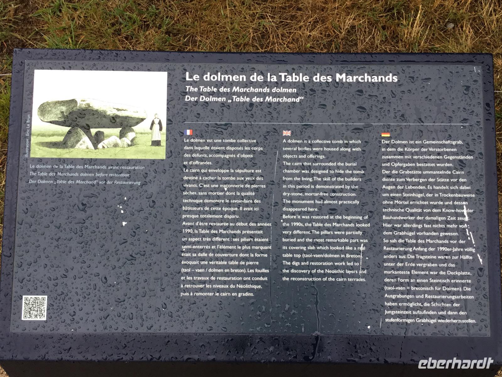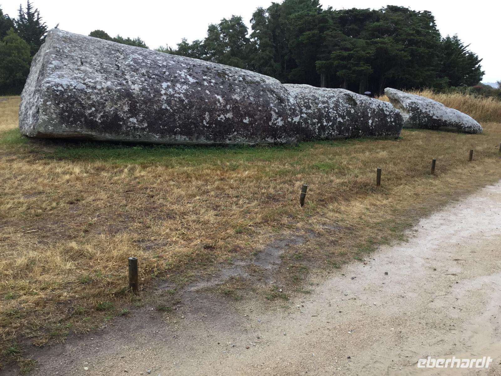 Die Steinfelder von Menec und der große, zerbrochene Menhir, sie alle geben bis heute Rätsel auf. Wie wurden diese Steine transportiert? Welchen Zweck hatten die Steinreihen? Wie entwickelt war diese Kultur des Neolithikums? Bis heute werfen diese Steine für die Wissenschaft viele Fragen auf. Und für die Populärwissenschaften bieten sie Stoff für eine Vielzahl von Legenden und Spekulationen. Unsere Bereitschaft sich den Legenden hinzugeben hält sich jedoch in Grenzen, denn der heftige Regen hindert uns die erste kleine Wanderung vorzunehmen. Wir hoffen auf Besserung und fahren nach Locmariaquer. Im Informationszentrum sehen wir immerhin im Trockenen einen Film über den zerbrochenen Menhir und die Megalithenstätten. Es regnet zwar immer noch, doch hie und da lässt die Intensität etwas nach, dann huschen einige nach draußen, um die Steine in Augenschein zu nehmen.