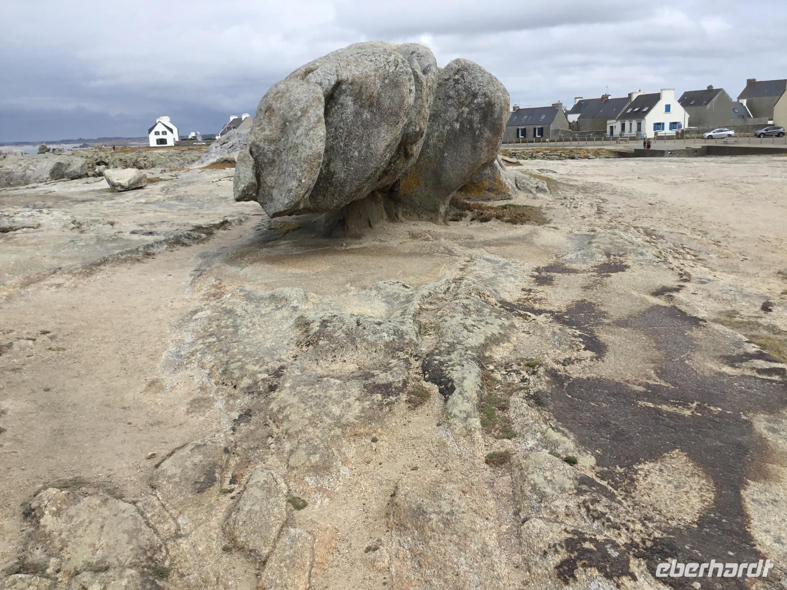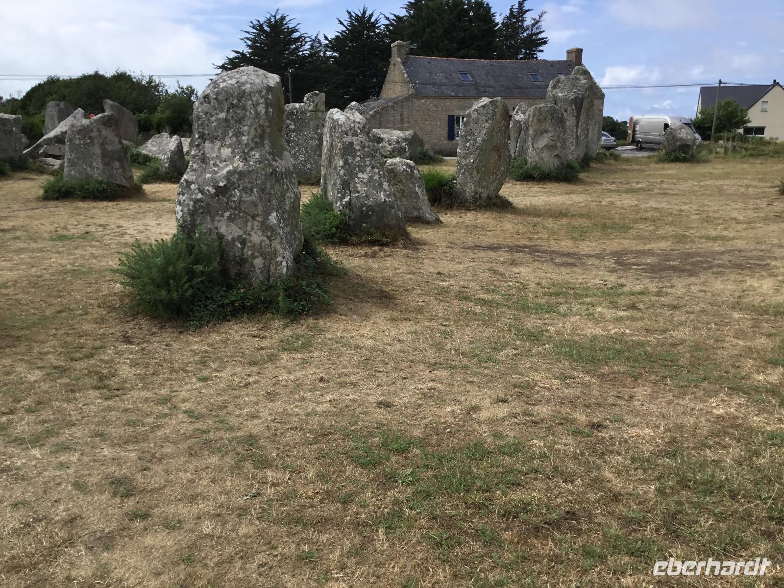 Im Regen fahren wir in den Ort Locmariaquer. Ein netter Ort mit Hafen und heute auch mit Markt. Eigentlich ideal für eine Mittagspause, wäre da nicht der Regen. Aber, Petrus hat ein Einsehen. Tatsächlich reißt der Himmel auf! Und sogar die Sonne zeigt sich. Gut gelaunt kehren die Gäste zum Bus zurück und unserer zweiten Wanderung steht nun kein Regen mehr im Weg. Wir durchwandern das kleine Waldstück bei Erdeven und stoßen nun überall auf Zeugnisse unserer Vorfahren: Steinkreise, Dolmen, Steinreihen. Und im Gegensatz zu Carnac können wir hier die Reihen abschreiten, mit den Steinen auf Tuchfüllung gehen. Was für ein Erlebnis!