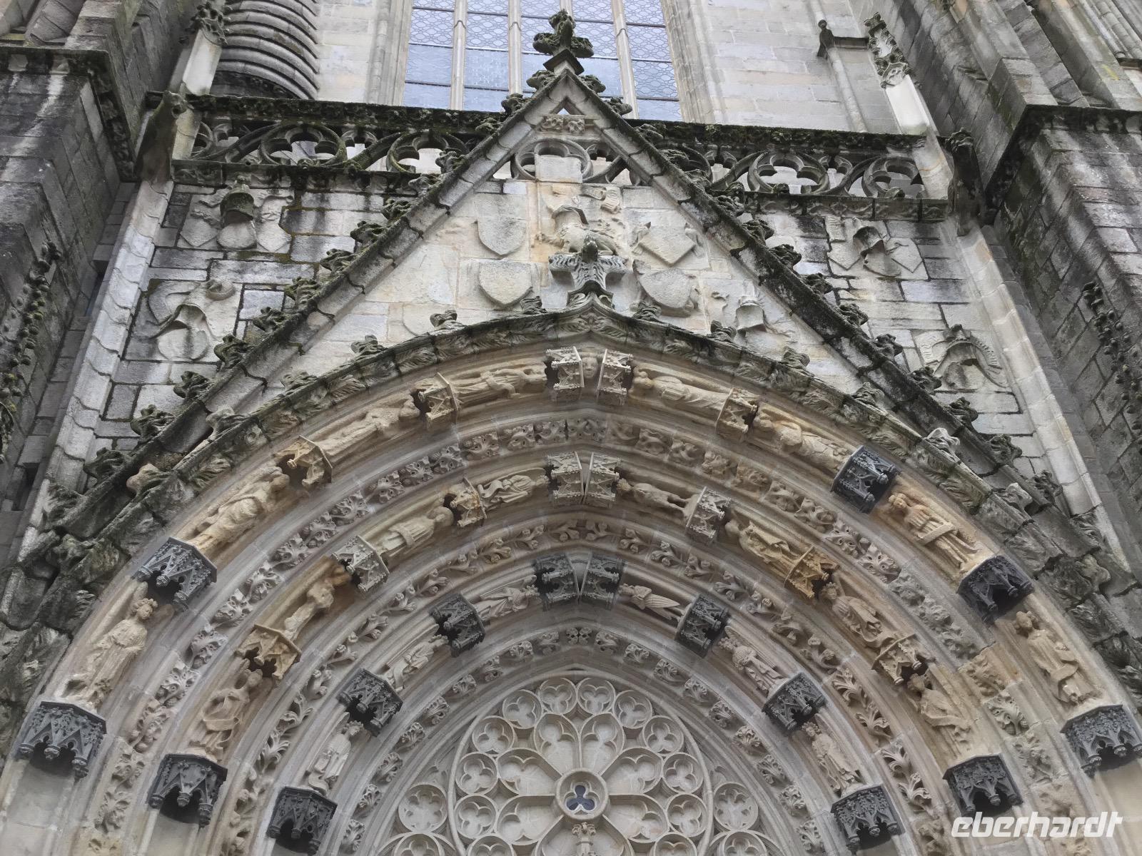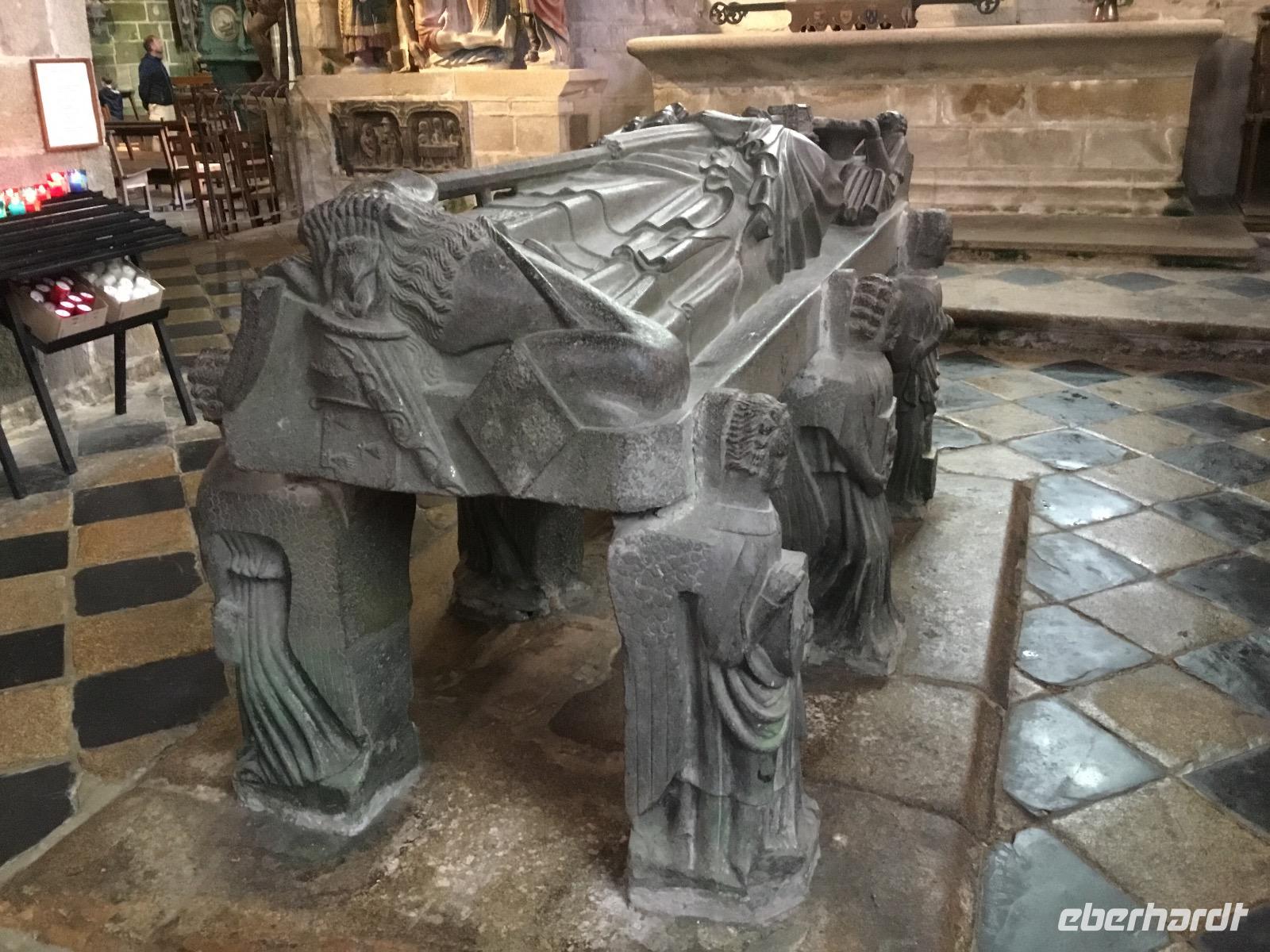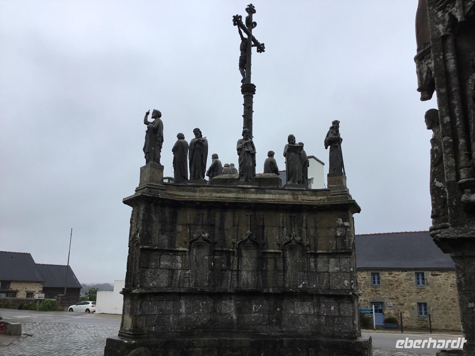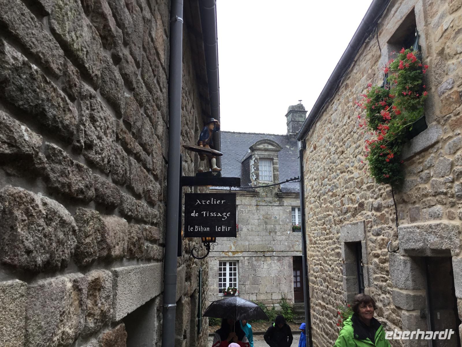 Leider ist der charmante Ort Locronan wieder mit Regen verbunden. Das ist schade, denn dieses Örtchen war schon häufig Drehort für so manchen Mantel-und Degen-Film. Wir belassen es bei einer Stippvisite, besichtigen die Kirche, die über das Grab des Heiligen Ronan gebaut wurde und fahren dann nach Quimper zurück. Alle freuen sich auf eine heiße Dusche und danach bleibt ja noch etwas Zeit für einen Bummel und für die Einkäufe....