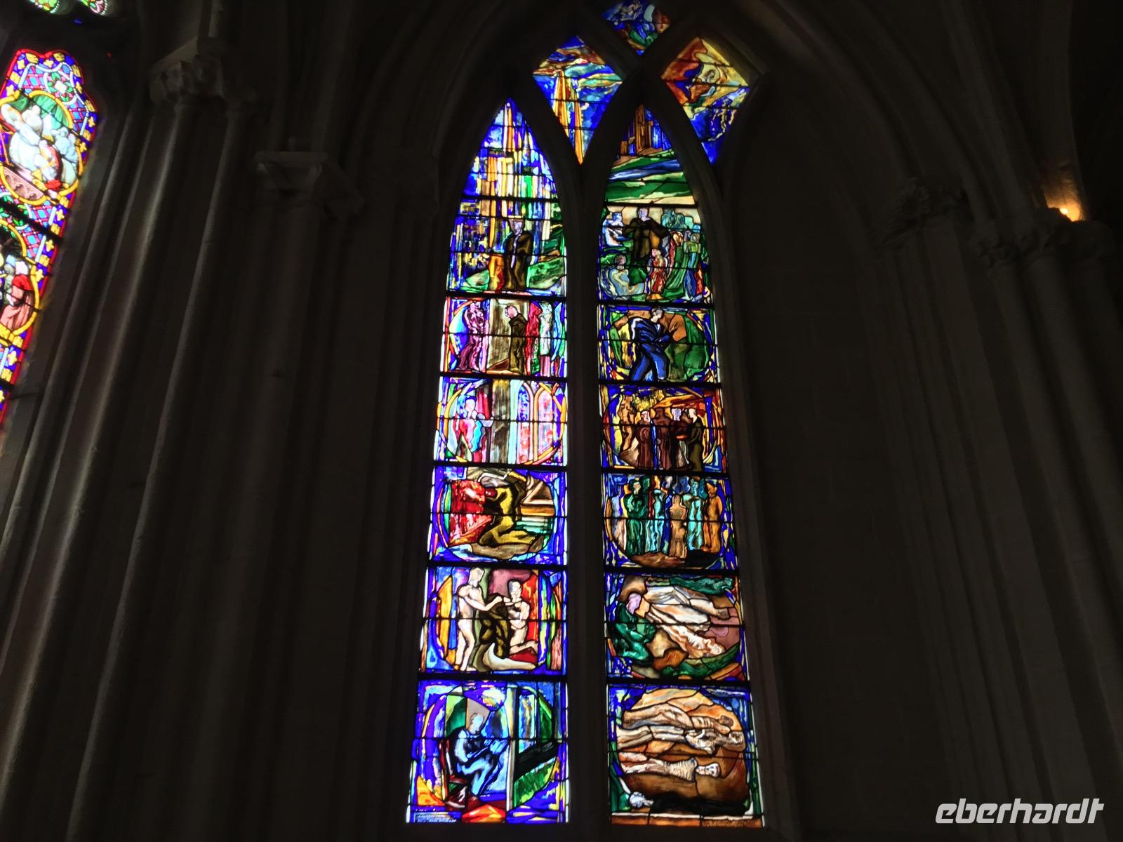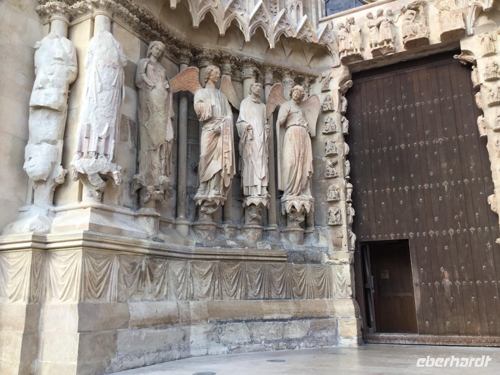 Wir erreichen Reims am frühen Abend und nutzen die Zeit für eine Besichtigung der Kathedrale, wo uns auch wieder Jeanne d'Arc begegnet, die Karl VII zur Königskrönung führte. Die Kathedrale, die Krönungskathedrale der Franzosen ist ohne Zweifel einer der wichtigen Orte unseres Nachbarn. Sie ist aber auch in der Deutsch-Französischen Geschichte wichtig. Schwer beschädigt durch die Deutschen im Jahre 1914, trafen sich 1962 Charles de Gaulle und Adenauer zu einem gemeinsamen Besuch eines Gottesdienstes. Heute beeindruckt die Kathedrale mit ihrer Architektur und den Fenstern. Unser Tag und unsere Reise endet mit einem guten Abendessen in einer schönen Brasserie in Reims. Und auch, wenn es zwischendurch wieder geregnete, dieses Mal werden wir auf unserem Weg ins Hotel nicht nass.