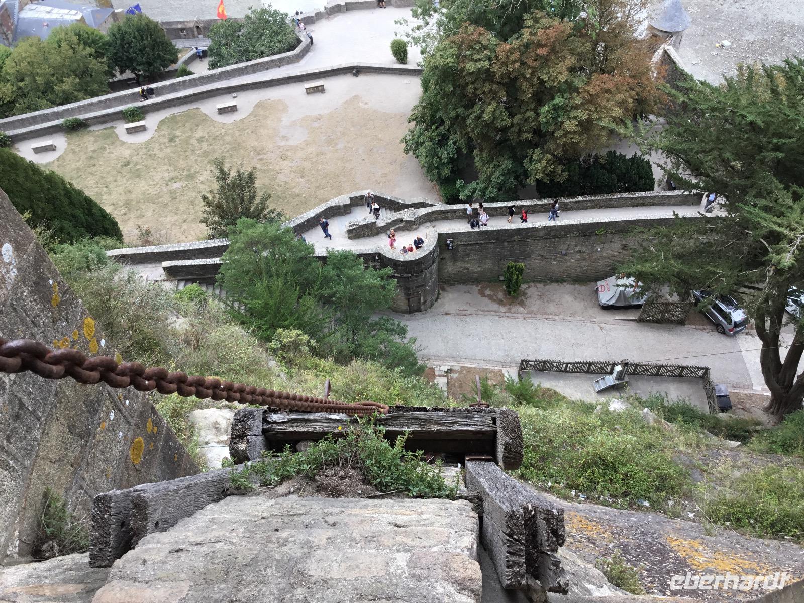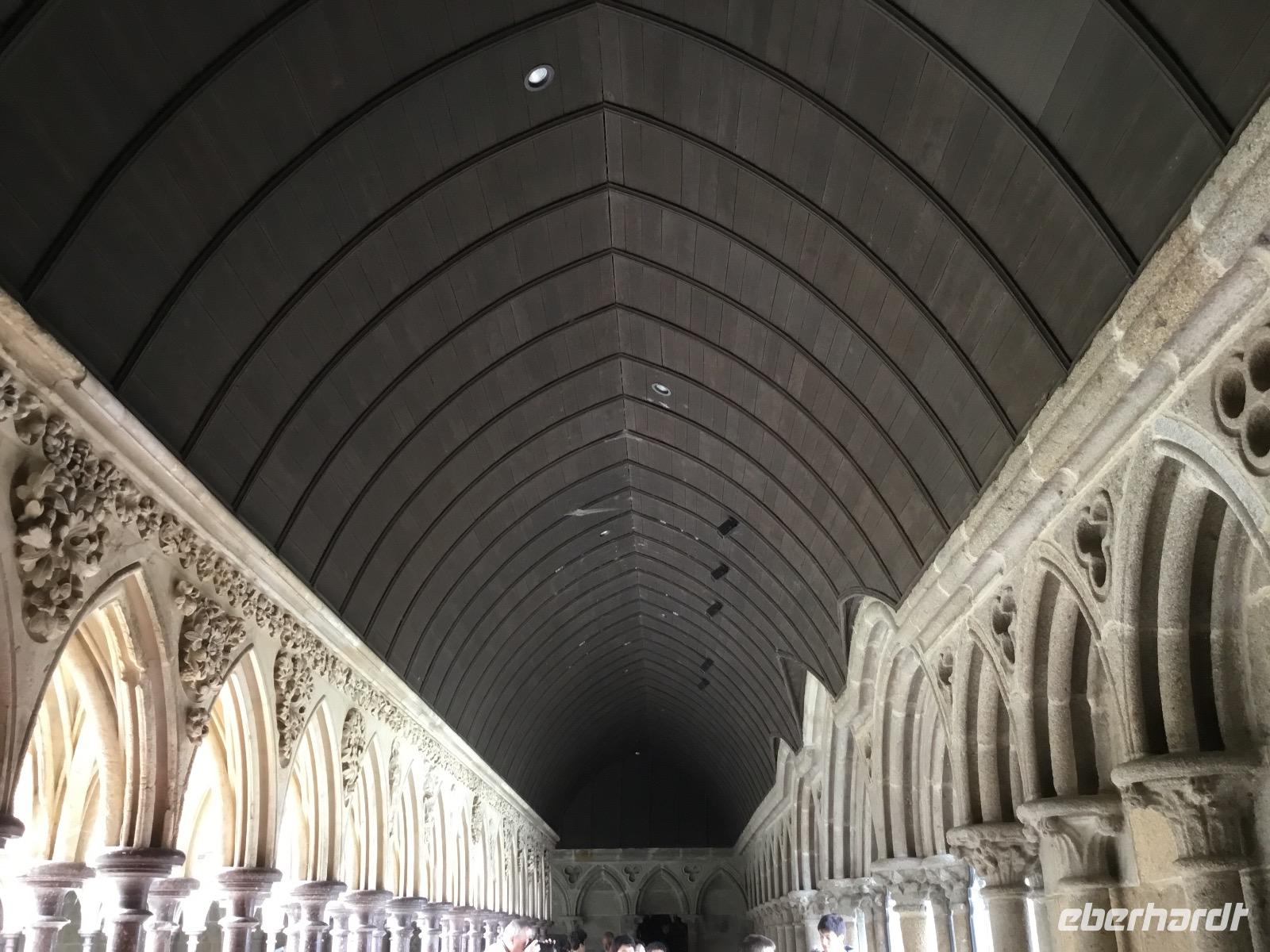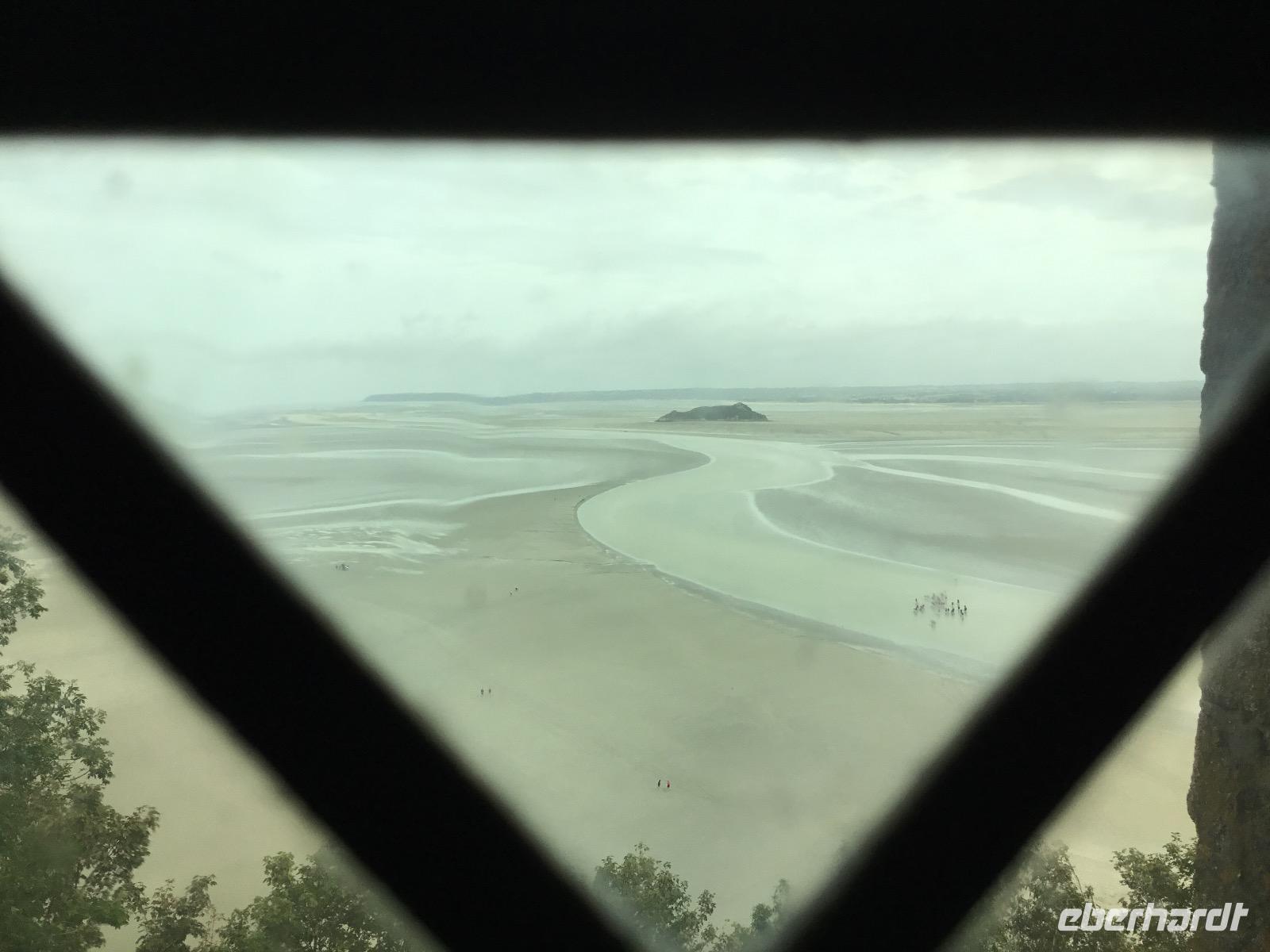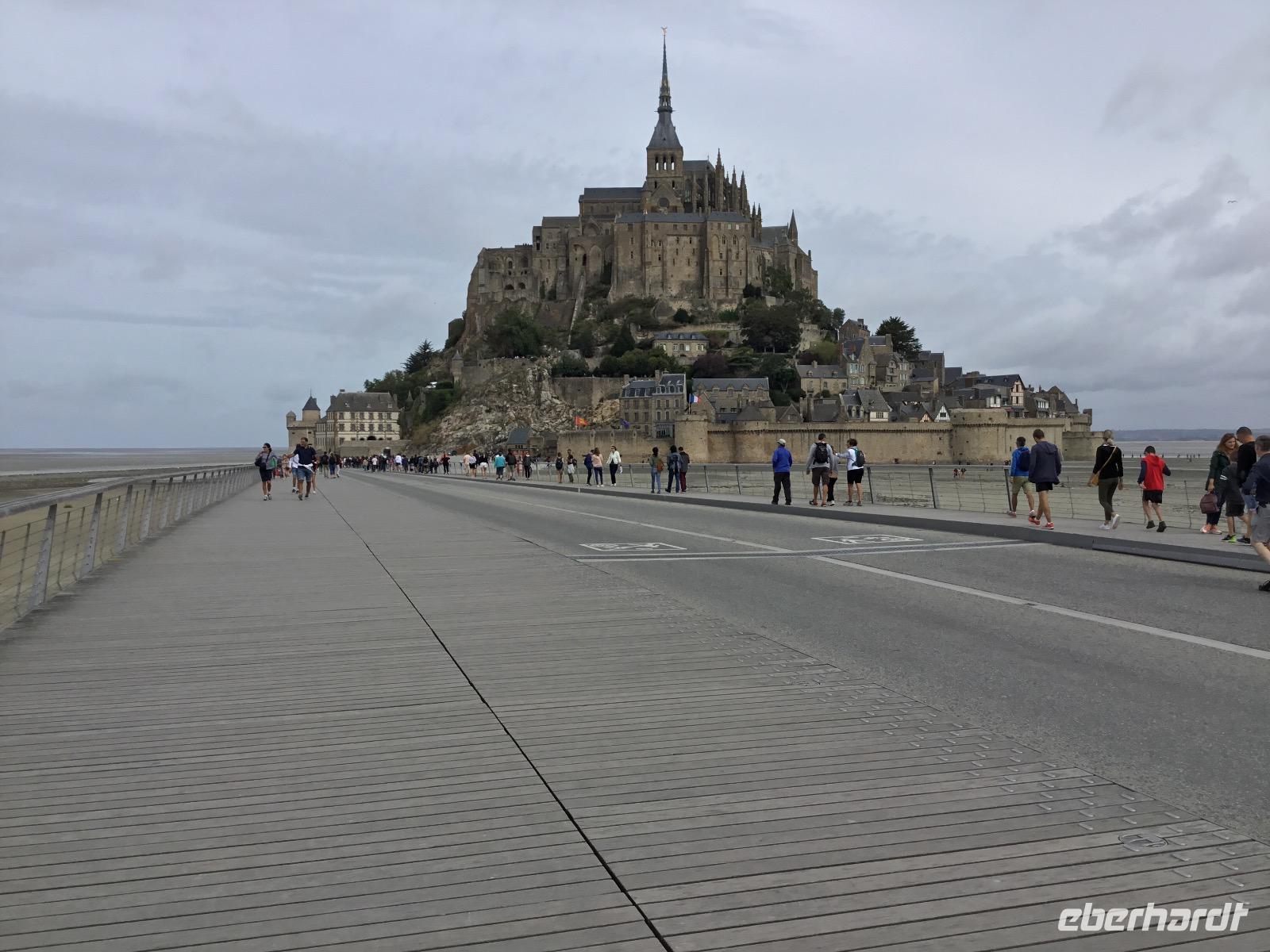Für viele ist der heutige Tag sicher ein Höhepunkt der Bretagnereise. Wobei wir eigentlich nicht mehr in der Bretagne sind, denn der Mont St. Michel, ist normannisch. Wir starten zeitig, denn wir haben glücklicherweise eine Reservierung. Grundsätzlich ist es auf dem Mont St. Michel immer voll. Aber jetzt in der Hochsaison kommt doch noch einiges dazu. Bei uns klappt es jedoch gut, weshalb unsere Gruppe um kurz nach 10 Uhr in der Abtei ist. Wir sind zwar nicht die ersten, aber immerhin hält sich der Andrang noch in Grenzen. Im Laufe der nächsten Stunde wird sich dies ändern. Nach zahlreichen Renovierungen strahlt der Erzengel Michael wieder über der Abtei und der Granitfelsen wird dank neuer Technik an 18 Tagen im Jahr wieder komplett umspült.