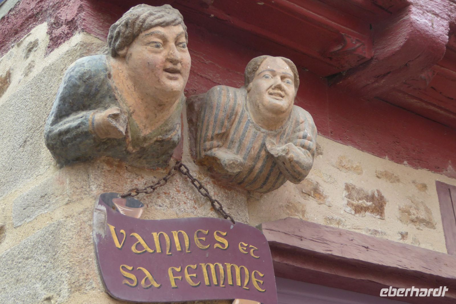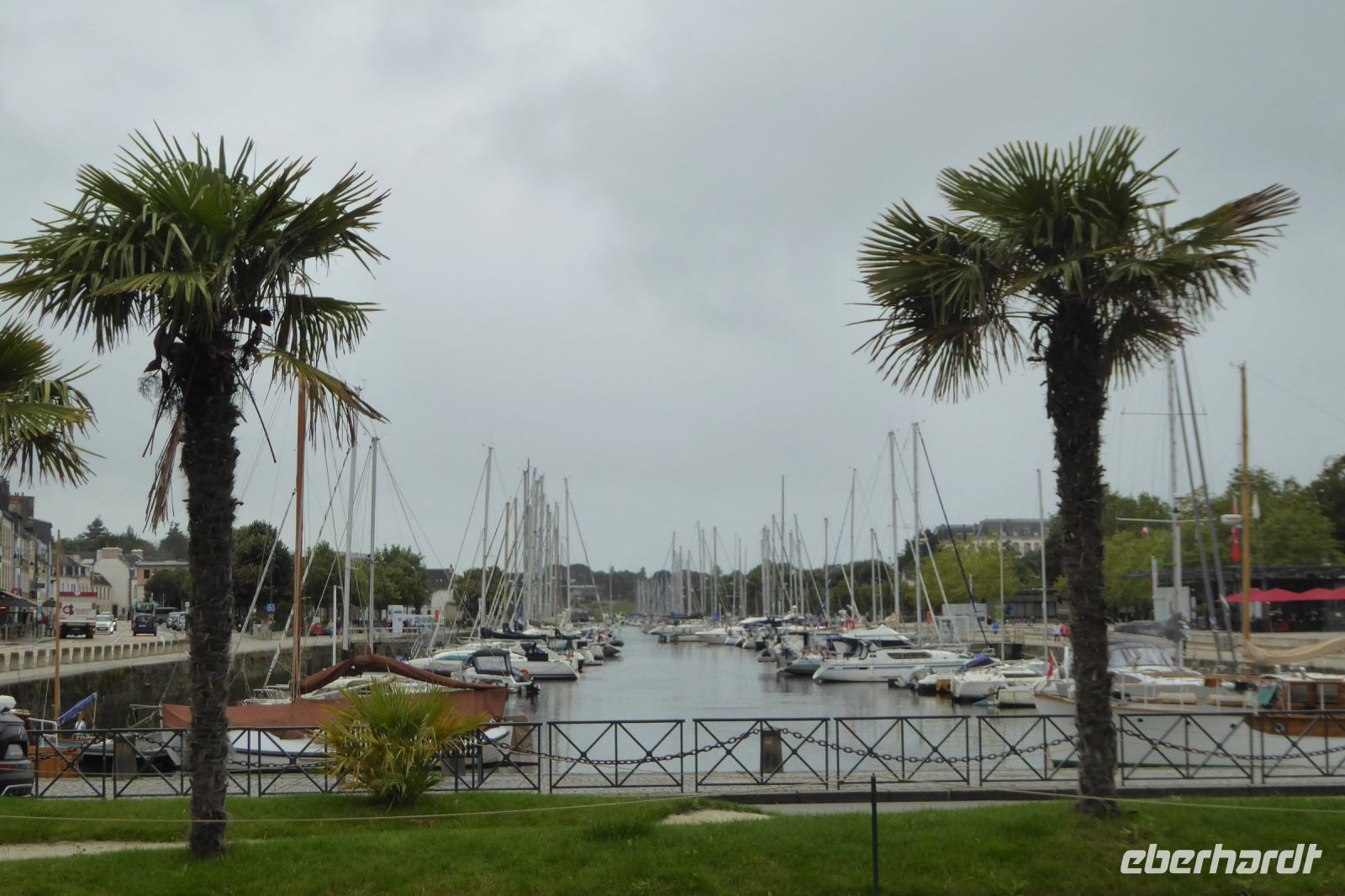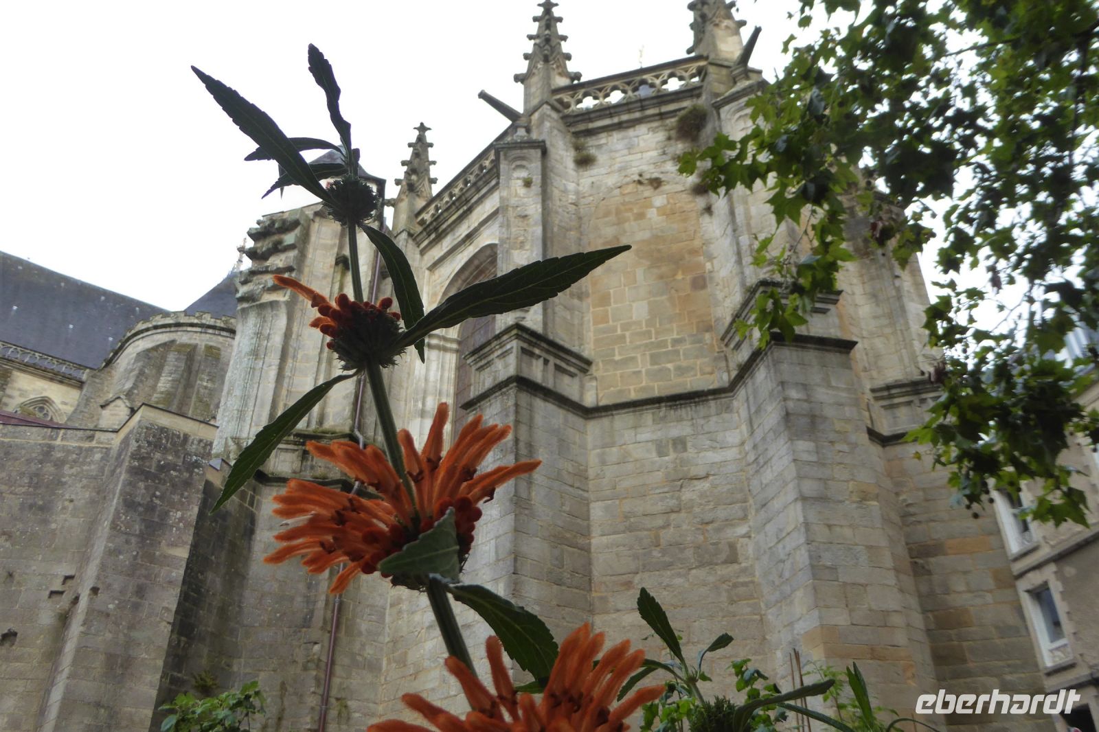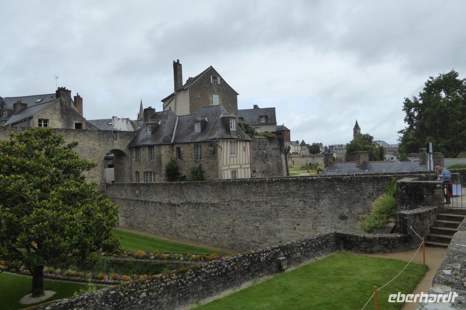 Der Himmel war bedeckt und es war mit 16° recht kühl als uns unsere Stadtführerin Kristin, eine waschechte Bretonin, am Hotel abholte. Vor dem beeindruckenden Hôtel de Ville von Vannes erzählte sie uns viel von der Geschichte der Stadt und der Bretagne. Wir streiften durch die Stadt und erreichten die imposante Stadtmauer und das Château de L´Hermine, das seinen Namen `Hermelin´ dem Wappentier des Herzogs Jean IV verdankt. In der Zeit seiner Regentschaft blühte die Stadt auf. Wir gingen über die Stadtmauer zum alten Waschhaus und bewunderten den herrlichen Blumenschmuck. Auf holprigen kopfsteingepflasterten Straßen ging es wieder in den alten Stadtkern zurück, mit seinen pittoresken Plätzen und den alten Fachwerkhäusern. In der Mitte der Stadt steht die gotische Kathedrale St. Pierre, die mit 110 Meter Länge einer der größten Kirchenbauten der Bretagne ist. Mit einem kurzen aber heftigen Regenschauer endete unsere Führung am Monoprix, wo wir uns mit Proviant und Getränken für unsere erste Wanderung am Nachmittag versorgten.