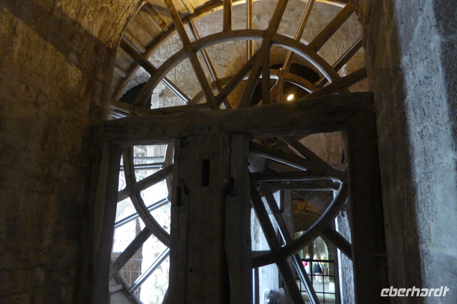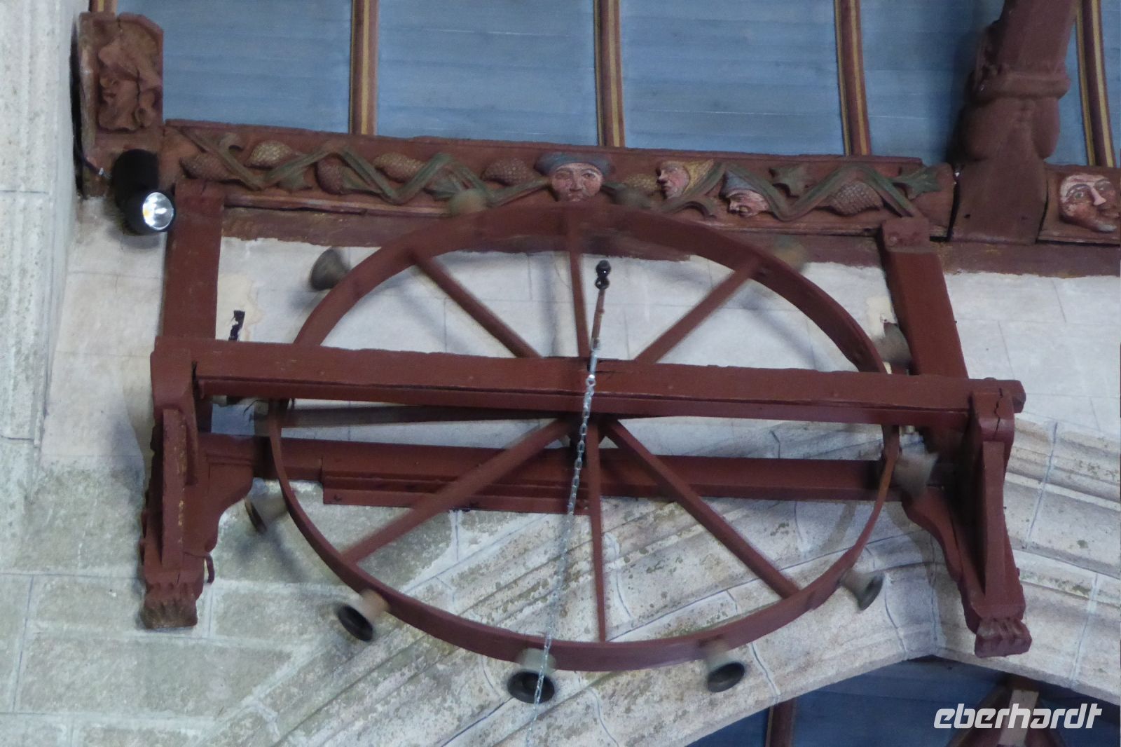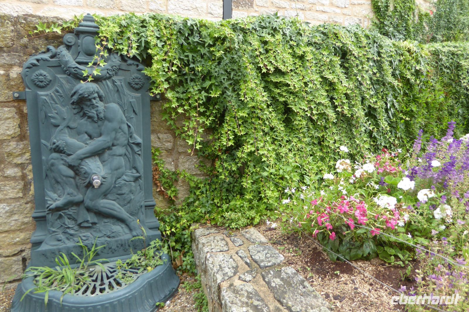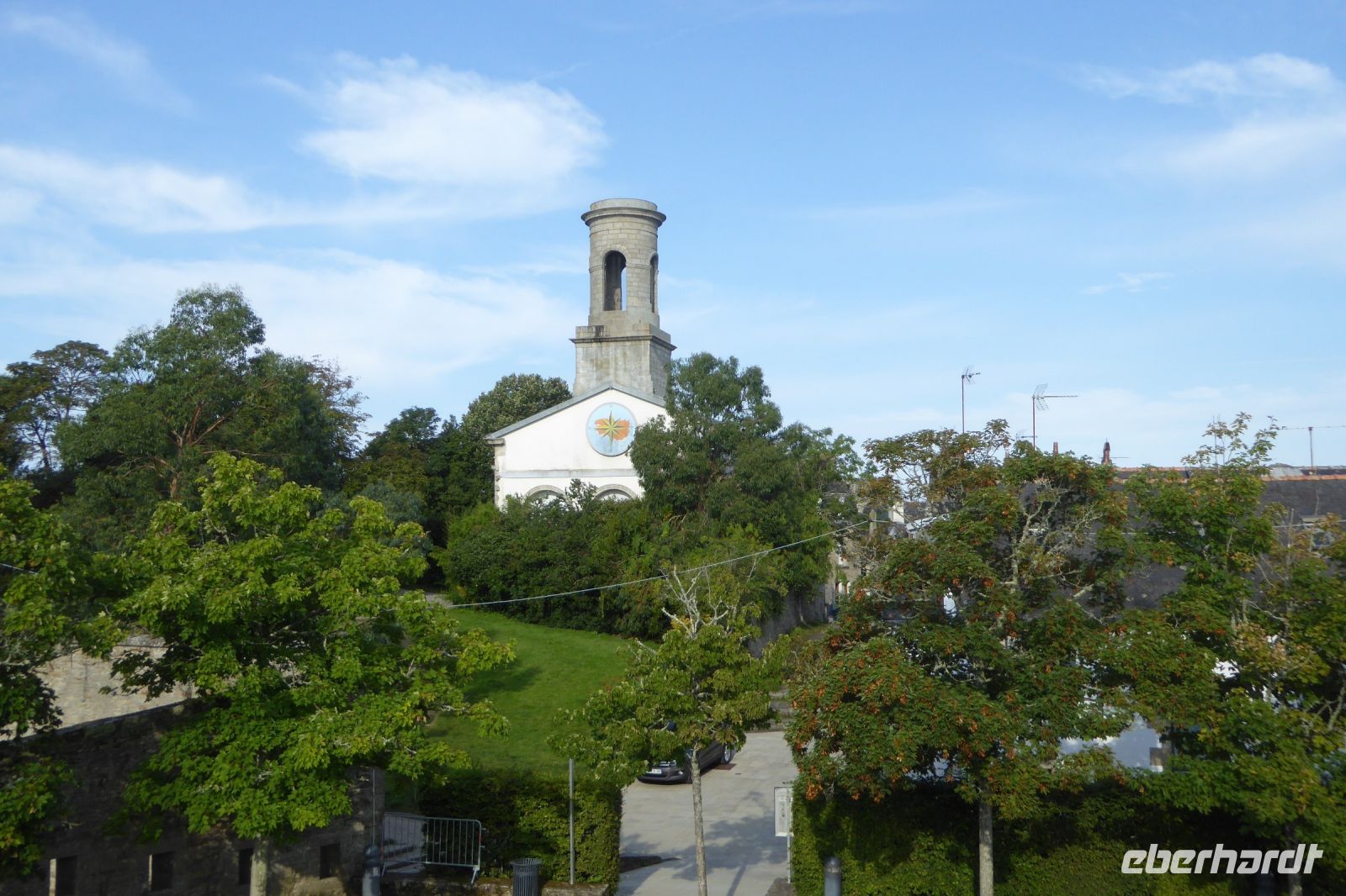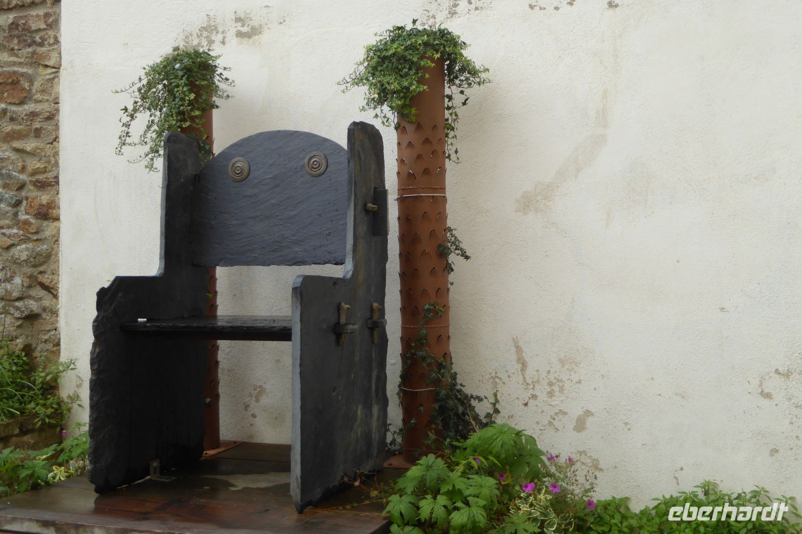 Auf der Rückfahrt machten wir Halt an der Kirche von Confort, um dem Glockenspiel der wundertätigen Maria zu lauschen. Mittels eines Seils wird ein hölzernes Rad hoch oben im Kirchenschiff in Bewegung gesetzt und es erklingt eine lustige Melodie aus zwölf Glöckchen. Danach trafen wir uns im Schatten hinter dem Gemeindehaus zu einem kleinen Umtrunk, bevor wir unser nächstes Ziel ansteuerten: Locronan, der Ort des Heiligen Ronan. Nicht umsonst ist dieser Ort, der einst vom Tuchhandel reich geworden war, mit dem Label „besonders malerischer Ort der Bretagne“ ausgezeichnet. Hier, in diesem sehr englisch wirkenden Ort mit seinen Steinhäusern aus bretonischem Granit, drehte übrigens Roman Polanski den Film `Tess` mit der jungen Nastassja Kinski in der Hauptrolle