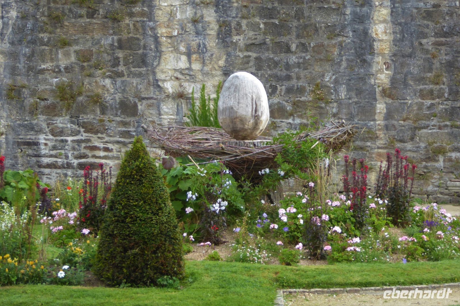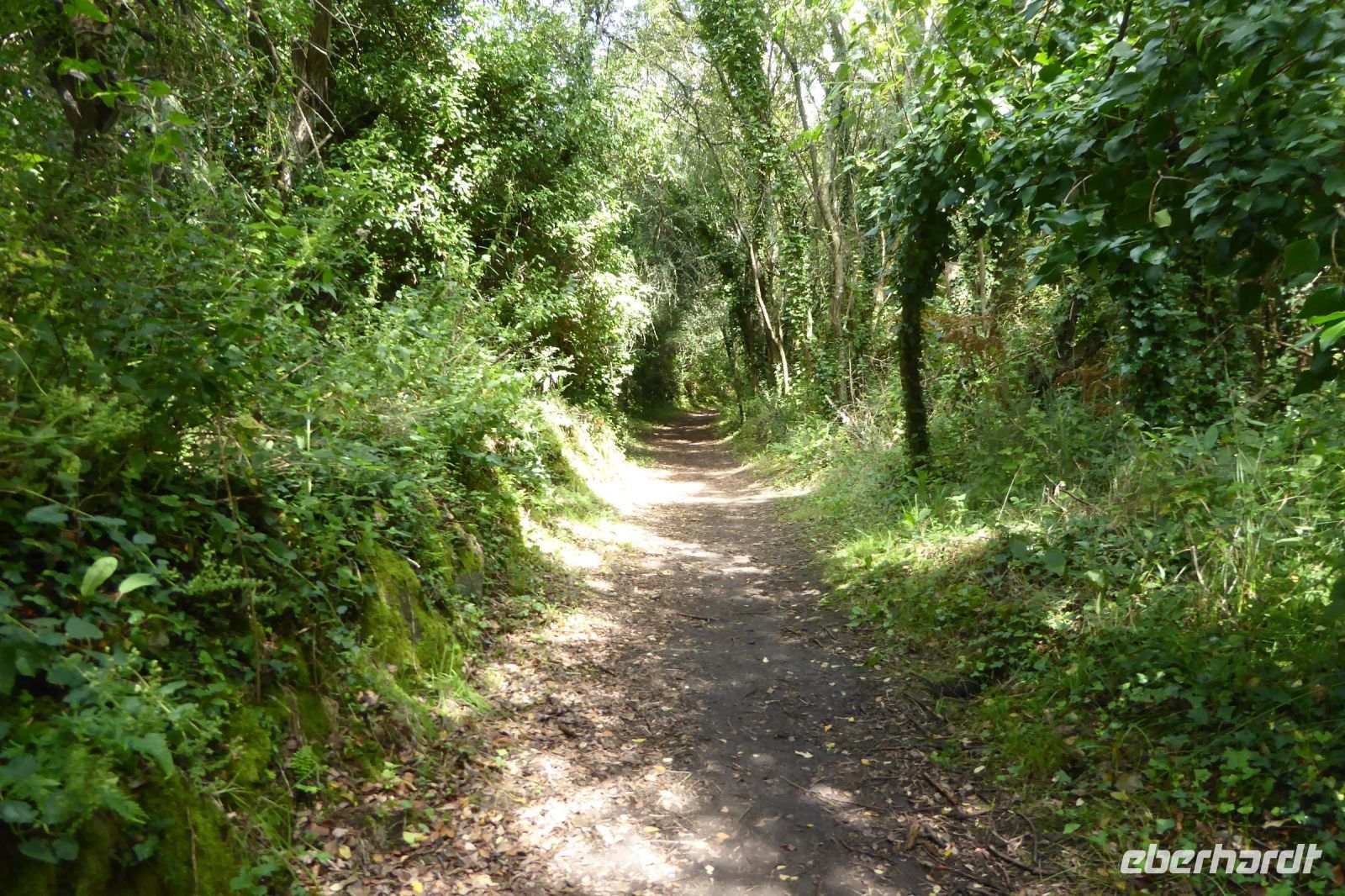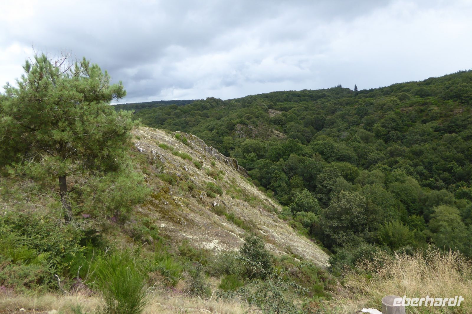 Unser erster gemeinsamer Spaziergang führte uns zur Quelle des Barenton im mystisch mythischen Zauberwald von Brocéliande. Dieses Waldgebiet sei der Schauplatz der Artus Legende. Zwischen Weihern, Quellen, Felsen und Dickicht sind der Fantasie keine Grenzen gesetzt und unweigerlich denkt man an Artus, Merlin, Viviane und Lancelot. An der magischen Quelle, mitten in dem herrlichen lichten Wald entdeckten wir ihn dann: den Heiligen Gral! Ein silberner Kelch, den ein Artus Jünger an dieser strategischen Stelle platziert hatte. Da keine unserer Mitwanderinnen auf der Suche nach einem Ehemann war und niemand an Ringelflechte litt, verließen wir die wundertätige Quelle wieder und nutzten das schöne Wetter für eine Pause, um uns miteinander bekannt zu machen. Unsere Mittagspause verbrachten wir in Tréhorenteuc, einem kleinen Ort, der sich seit 70 Jahren zum Zentrum der Gralssucher entwickelt hat. In der kleinen Kirche bestaunten wir die bunten Glasfenster mit den christlichen und mystischen Legenden, bevor wir uns auf den Weg ins `Tal ohne Wiederkehr` machten. Da der Weg durch das Tal von Wasser und französischen Freizeitgruppen überschwemmt war, machten wir uns am Arbre d´or, dem goldenen Baum, einem Kunstobjekt des französischen Bildhauers François Davin aus dem Jahre 1991, gleich an den steilen Aufstieg zum Hochplateau. Dort genossen wir den herrlichen Ausblick über das unberührt scheinende Waldgebiet. Die Wölkchen im Hintergrund wiesen den Weg zum Meer. Zurück am Bus gab es zuerst einen Kaffee und leckere Madeleines.