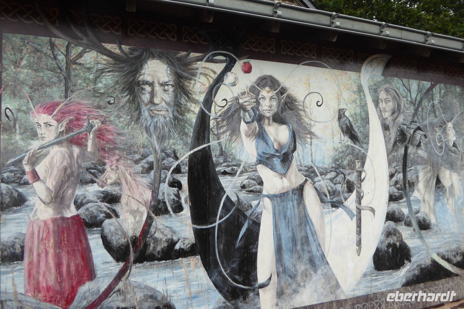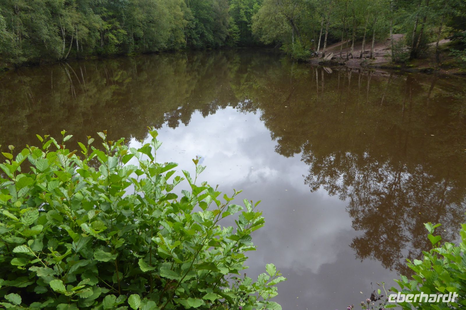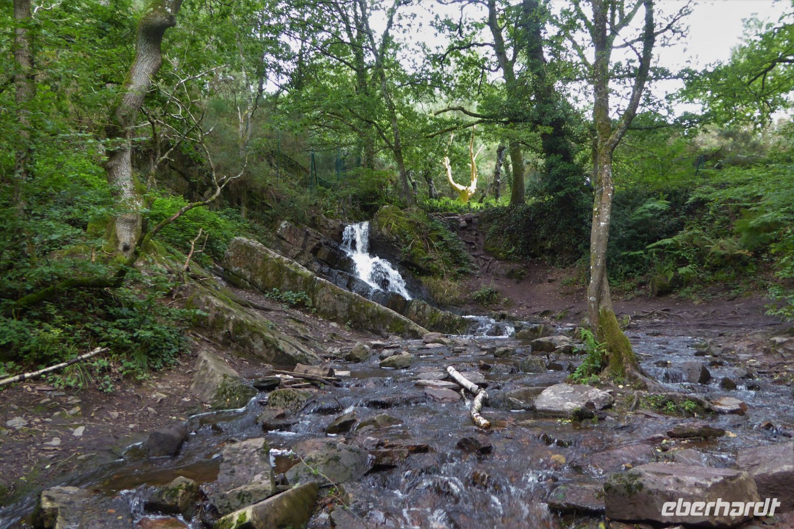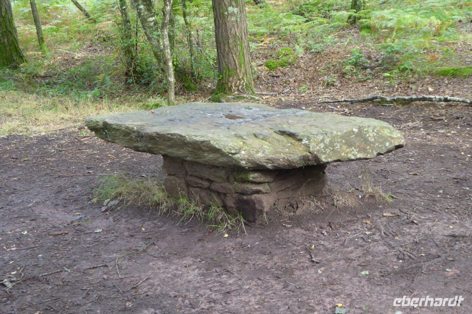 Unser erster gemeinsamer Spaziergang führte uns zur Quelle des Barenton im mystisch mythischen Zauberwald von Brocéliande. Dieses Waldgebiet sei der Schauplatz der Artus Legende. Zwischen Weihern, Quellen, Felsen und Dickicht sind der Fantasie keine Grenzen gesetzt und unweigerlich denkt man an Artus, Merlin, Viviane und Lancelot. An der magischen Quelle, mitten in dem herrlichen lichten Wald entdeckten wir ihn dann: den Heiligen Gral! Ein silberner Kelch, den ein Artus Jünger an dieser strategischen Stelle platziert hatte. Da keine unserer Mitwanderinnen auf der Suche nach einem Ehemann war und niemand an Ringelflechte litt, verließen wir die wundertätige Quelle wieder und nutzten das schöne Wetter für eine Pause, um uns miteinander bekannt zu machen. Unsere Mittagspause verbrachten wir in Tréhorenteuc, einem kleinen Ort, der sich seit 70 Jahren zum Zentrum der Gralssucher entwickelt hat. In der kleinen Kirche bestaunten wir die bunten Glasfenster mit den christlichen und mystischen Legenden, bevor wir uns auf den Weg ins `Tal ohne Wiederkehr` machten. Da der Weg durch das Tal von Wasser und französischen Freizeitgruppen überschwemmt war, machten wir uns am Arbre d´or, dem goldenen Baum, einem Kunstobjekt des französischen Bildhauers François Davin aus dem Jahre 1991, gleich an den steilen Aufstieg zum Hochplateau. Dort genossen wir den herrlichen Ausblick über das unberührt scheinende Waldgebiet. Die Wölkchen im Hintergrund wiesen den Weg zum Meer. Zurück am Bus gab es zuerst einen Kaffee und leckere Madeleines.