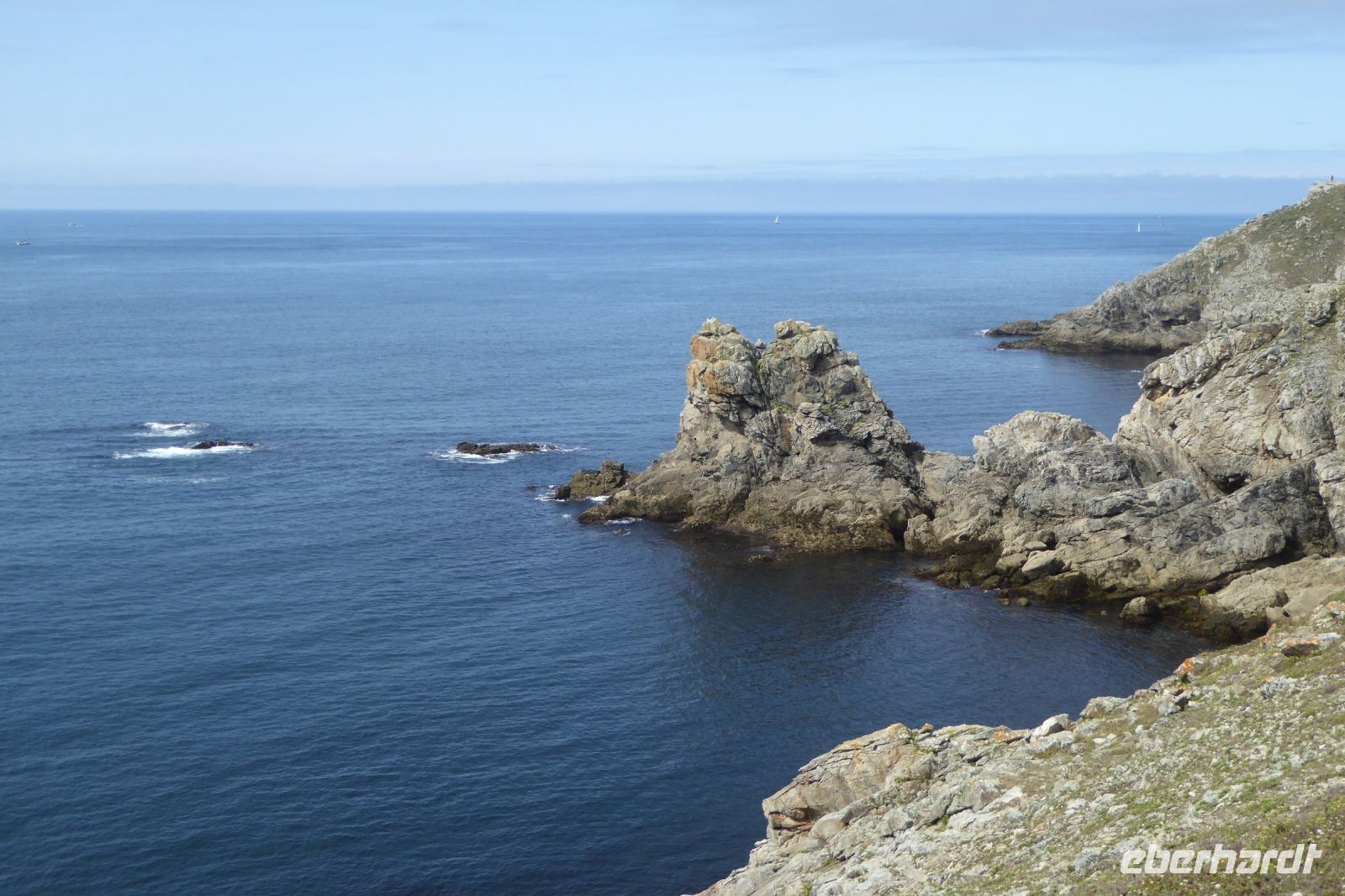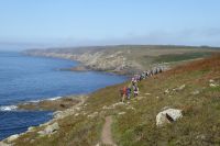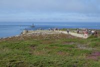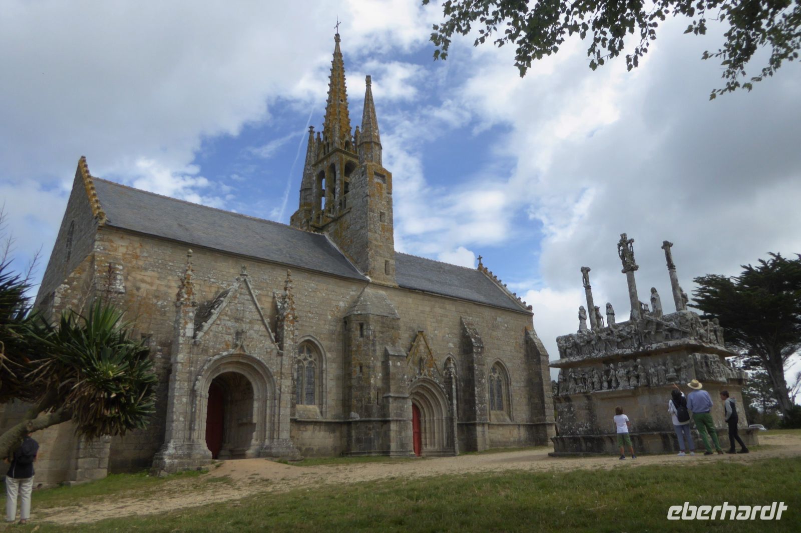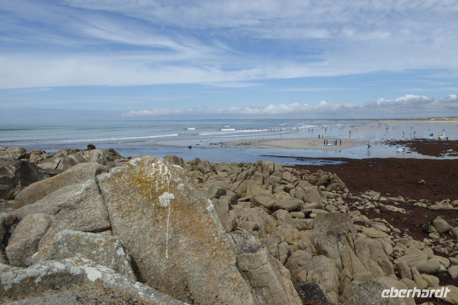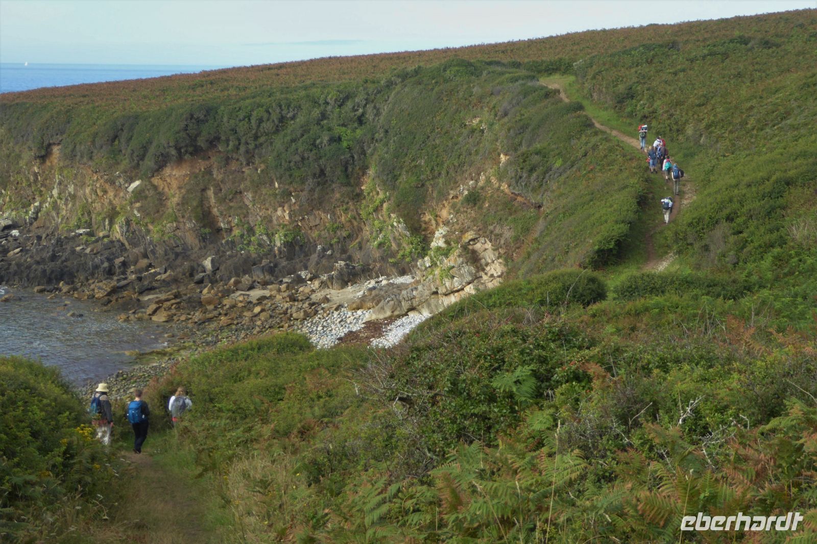 Heute stand die längste Wanderung mit insgesamt 15 Kilometern auf unserem Programm: von der kleinen Kirche Notre-Dame de Bon Voyage, hoch auf einem Hügel über dem Ort Kerven Vihan gelegen, gingen wir erst durch einen schattigen Hohlweg zum Küstenpfad, dem berühmten GR 34, der auf 1700 km um jede Klippe, jede Buch der Bretagne vom Mont Saint Michel bis nach St. Nazaire führt. Ganz so viele Kilometer hatten wir nicht im Sinn, doch freuten wir uns alle nach vier Stunden stetigen Auf und Ab entlang der Küste auf eine ausgedehnte Mittagspause an der Pointe du Raz. An dieser fast westlichsten Landspitze Europas, die sich 72 Meter über dem Meer erhebt, donnern die Wellen des Atlantiks an die baren Felsen. Auf zwei vorgelagerten Inseln stehen meerumbrandete Leuchttürme und die Statue der Mutter Gottes der Schiffbrüchigen erinnert daran, dass das Meer für die Küstenbewohner seit jeher sowohl Segen wie Fluch ist. Viele französische Touristen nutzten wie wir den schönen Tag für einen Ausflug zu dieser besonderen Stelle. Daher entschlossen wir uns, nicht zum überfüllten Parkplatz zu gehen, sondern noch weitere zwei Kilometer durch die herrliche Landschaft zu marschieren und uns erst an der herrlichen Baie de Trépassés abholen zu lassen. Es war die richtige Entscheidung! Die Bucht präsentierte sich friedlich mit weißen langsam anrollenden Wellen und ließ ein klein wenig Karibikfeeling aufkommen.