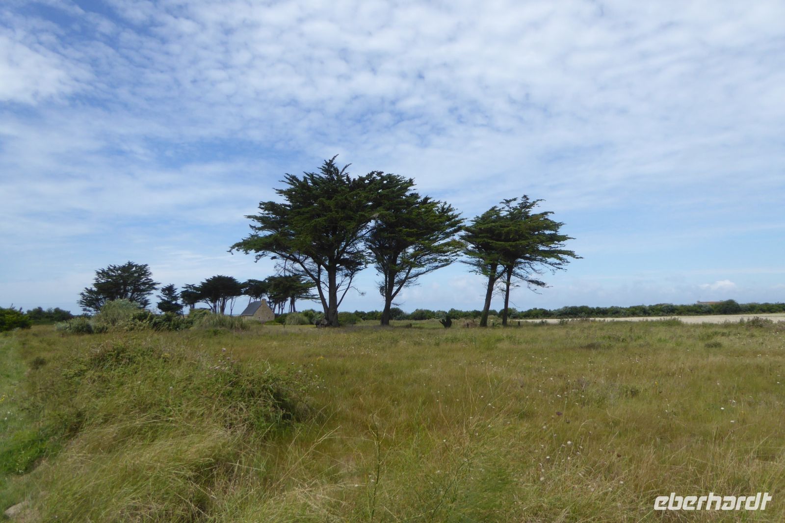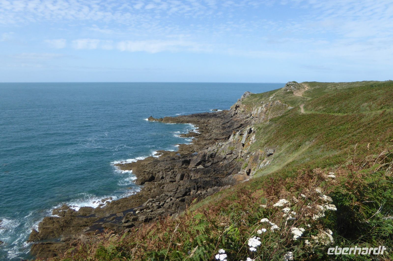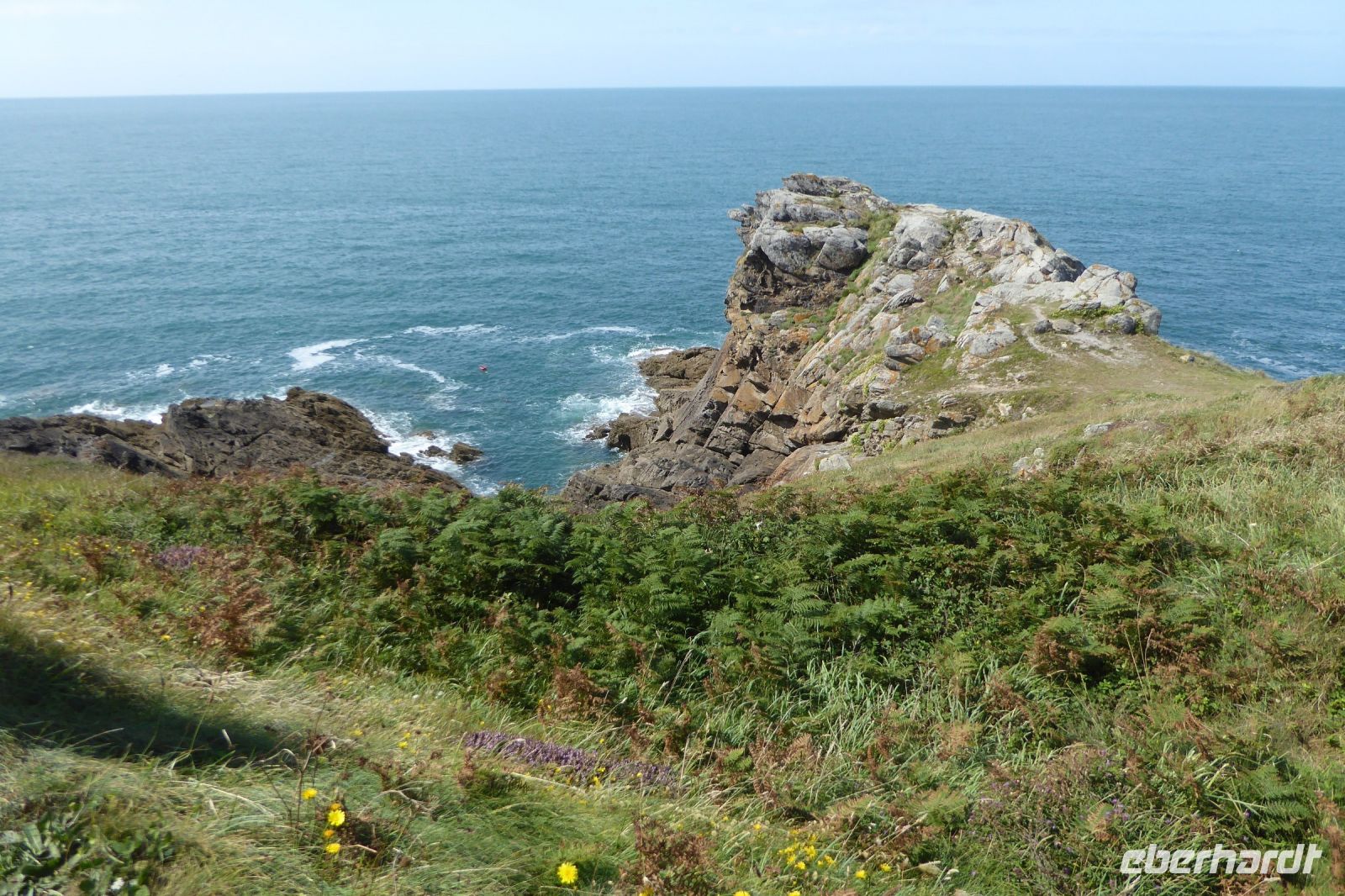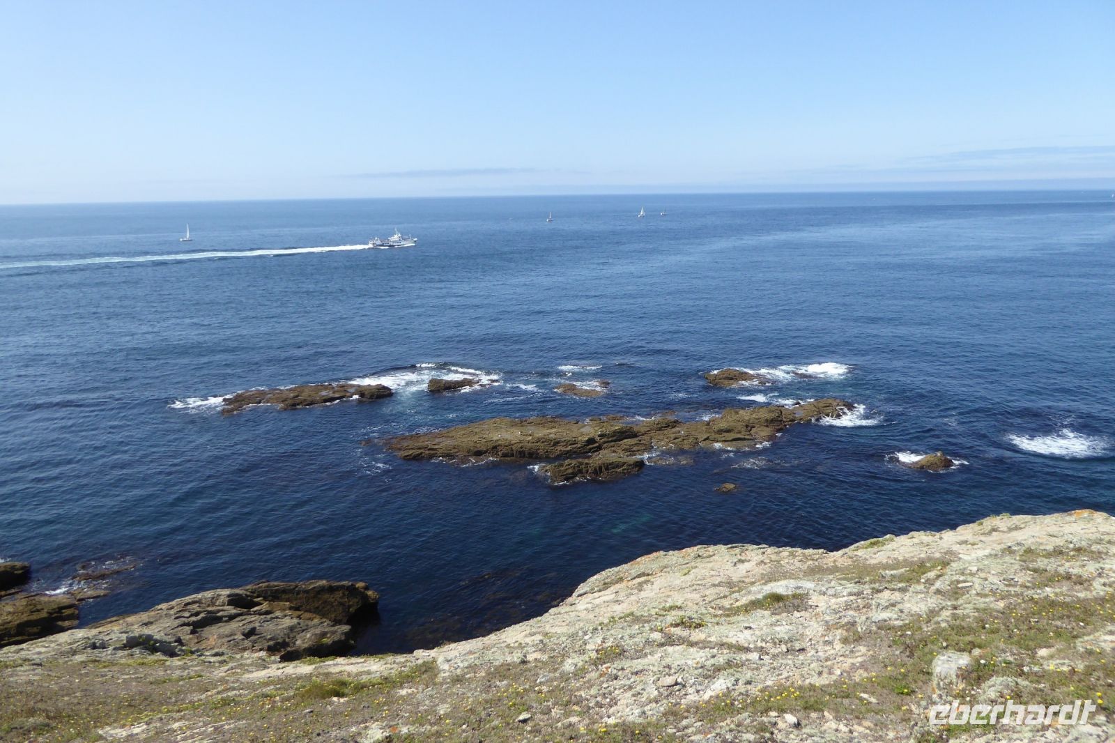 Heute stand die längste Wanderung mit insgesamt 15 Kilometern auf unserem Programm: von der kleinen Kirche Notre-Dame de Bon Voyage, hoch auf einem Hügel über dem Ort Kerven Vihan gelegen, gingen wir erst durch einen schattigen Hohlweg zum Küstenpfad, dem berühmten GR 34, der auf 1700 km um jede Klippe, jede Buch der Bretagne vom Mont Saint Michel bis nach St. Nazaire führt. Ganz so viele Kilometer hatten wir nicht im Sinn, doch freuten wir uns alle nach vier Stunden stetigen Auf und Ab entlang der Küste auf eine ausgedehnte Mittagspause an der Pointe du Raz. An dieser fast westlichsten Landspitze Europas, die sich 72 Meter über dem Meer erhebt, donnern die Wellen des Atlantiks an die baren Felsen. Auf zwei vorgelagerten Inseln stehen meerumbrandete Leuchttürme und die Statue der Mutter Gottes der Schiffbrüchigen erinnert daran, dass das Meer für die Küstenbewohner seit jeher sowohl Segen wie Fluch ist. Viele französische Touristen nutzten wie wir den schönen Tag für einen Ausflug zu dieser besonderen Stelle. Daher entschlossen wir uns, nicht zum überfüllten Parkplatz zu gehen, sondern noch weitere zwei Kilometer durch die herrliche Landschaft zu marschieren und uns erst an der herrlichen Baie de Trépassés abholen zu lassen. Es war die richtige Entscheidung! Die Bucht präsentierte sich friedlich mit weißen langsam anrollenden Wellen und ließ ein klein wenig Karibikfeeling aufkommen.