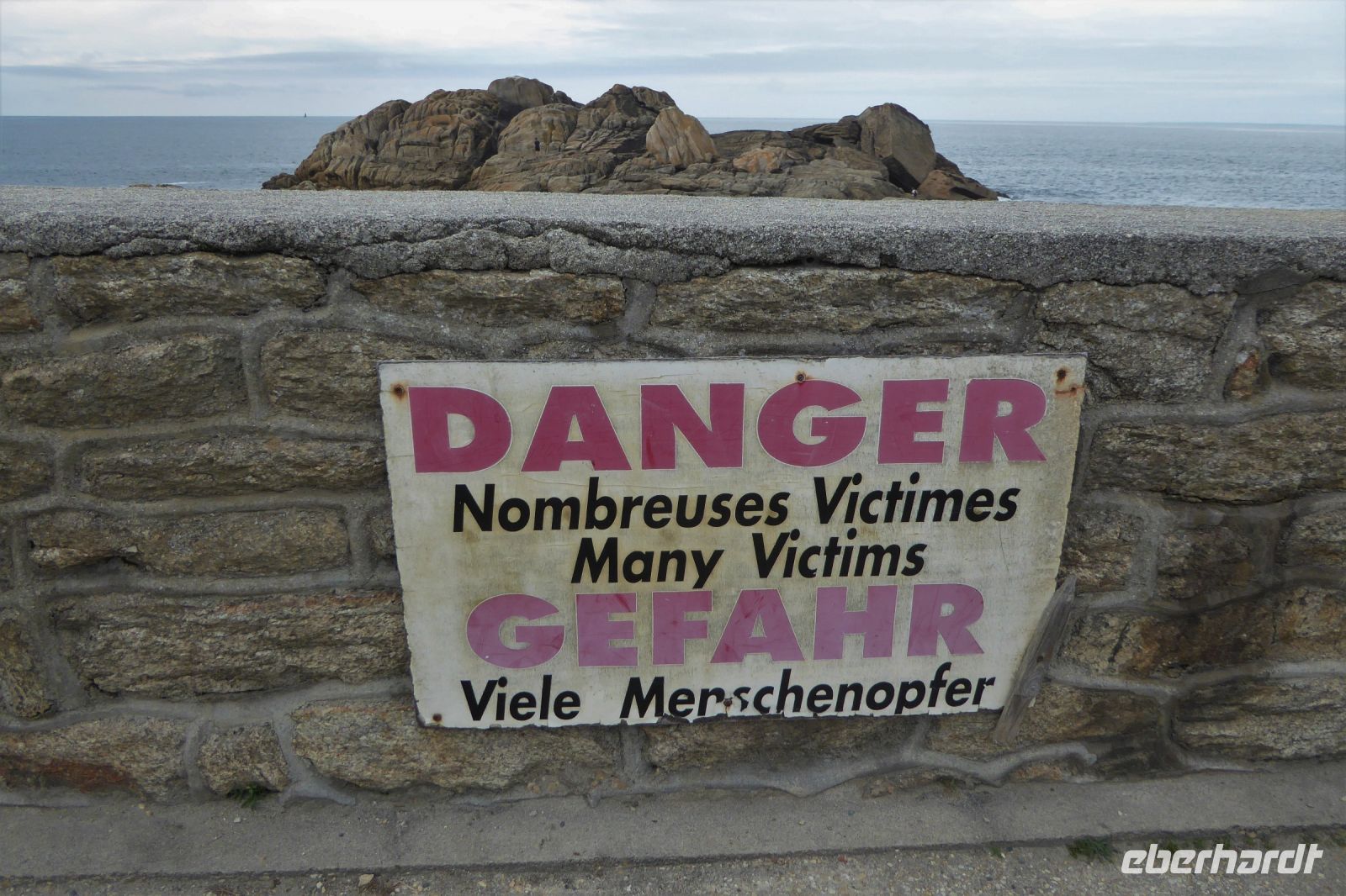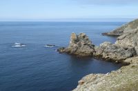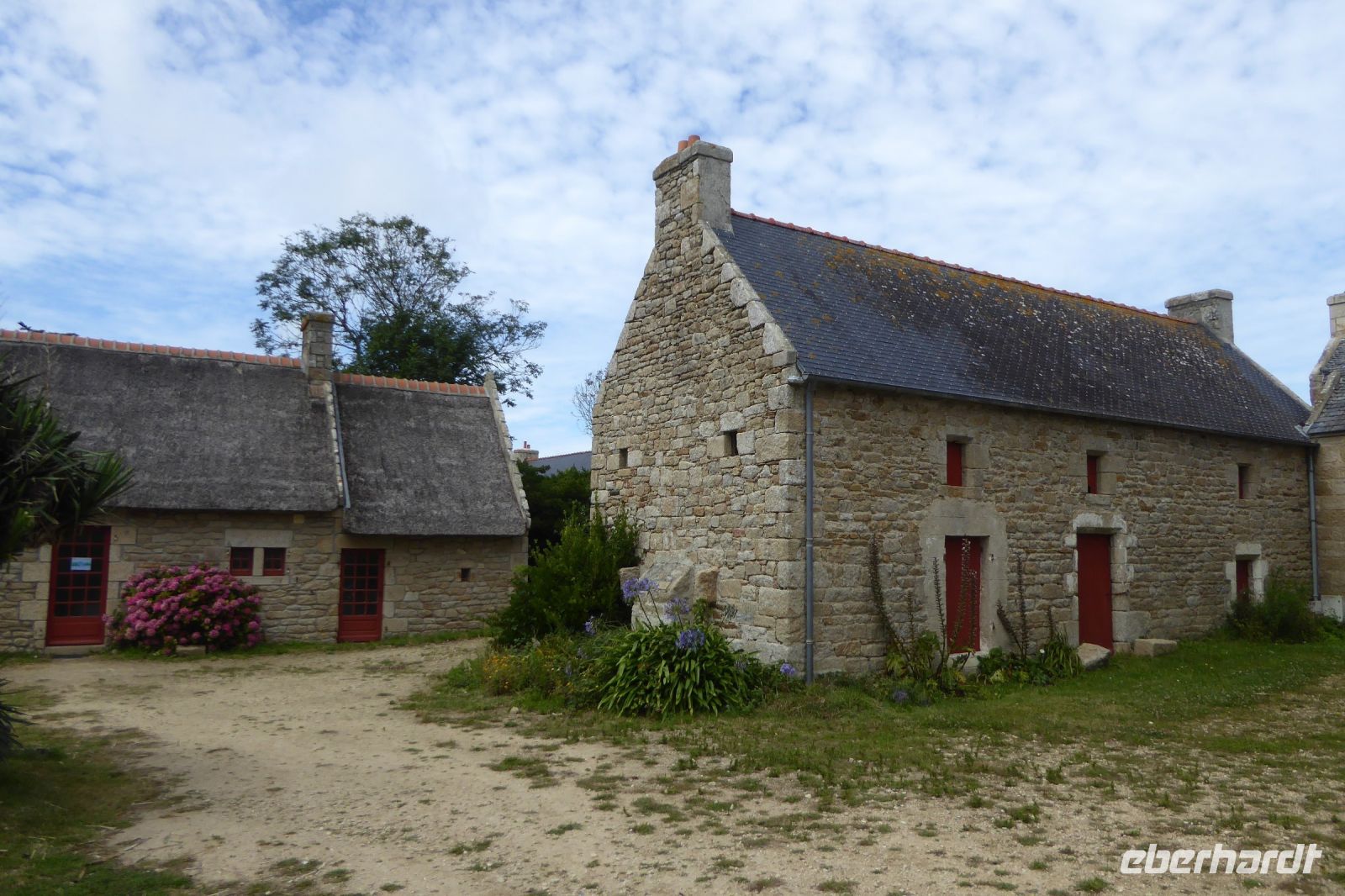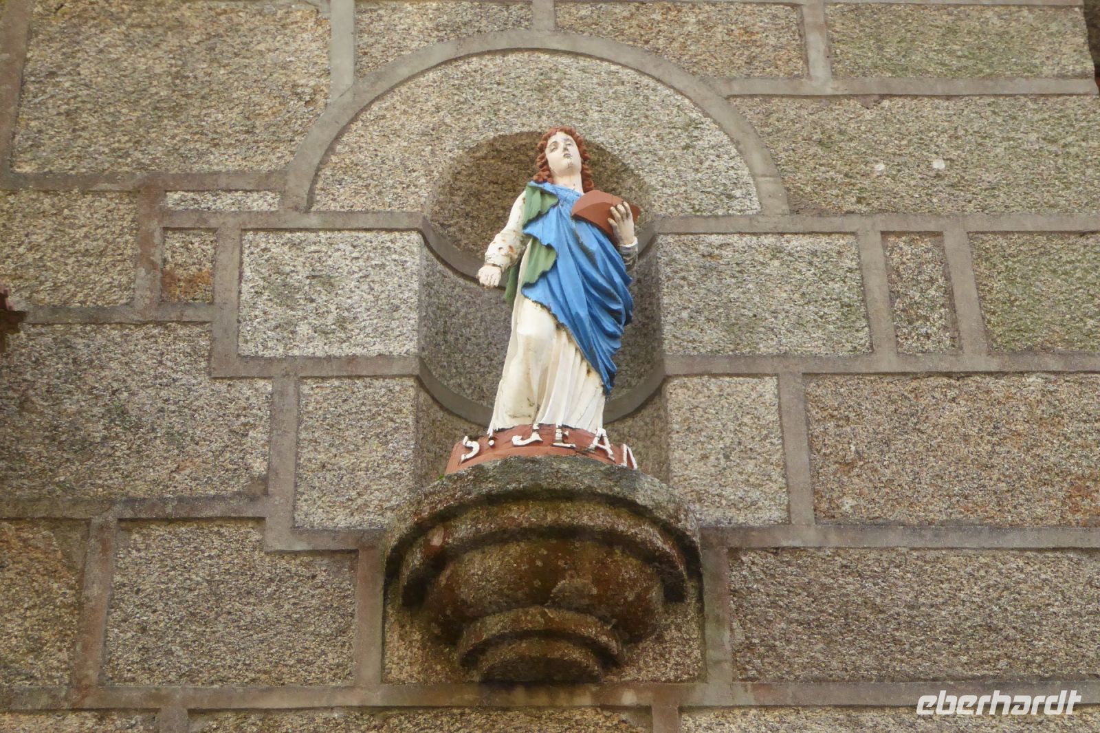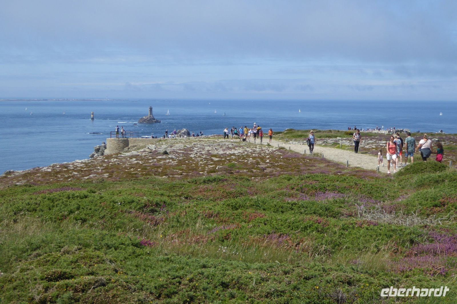 Heute stand die längste Wanderung mit insgesamt 15 Kilometern auf unserem Programm: von der kleinen Kirche Notre-Dame de Bon Voyage, hoch auf einem Hügel über dem Ort Kerven Vihan gelegen, gingen wir erst durch einen schattigen Hohlweg zum Küstenpfad, dem berühmten GR 34, der auf 1700 km um jede Klippe, jede Buch der Bretagne vom Mont Saint Michel bis nach St. Nazaire führt. Ganz so viele Kilometer hatten wir nicht im Sinn, doch freuten wir uns alle nach vier Stunden stetigen Auf und Ab entlang der Küste auf eine ausgedehnte Mittagspause an der Pointe du Raz. An dieser fast westlichsten Landspitze Europas, die sich 72 Meter über dem Meer erhebt, donnern die Wellen des Atlantiks an die baren Felsen. Auf zwei vorgelagerten Inseln stehen meerumbrandete Leuchttürme und die Statue der Mutter Gottes der Schiffbrüchigen erinnert daran, dass das Meer für die Küstenbewohner seit jeher sowohl Segen wie Fluch ist. Viele französische Touristen nutzten wie wir den schönen Tag für einen Ausflug zu dieser besonderen Stelle. Daher entschlossen wir uns, nicht zum überfüllten Parkplatz zu gehen, sondern noch weitere zwei Kilometer durch die herrliche Landschaft zu marschieren und uns erst an der herrlichen Baie de Trépassés abholen zu lassen. Es war die richtige Entscheidung! Die Bucht präsentierte sich friedlich mit weißen langsam anrollenden Wellen und ließ ein klein wenig Karibikfeeling aufkommen.
