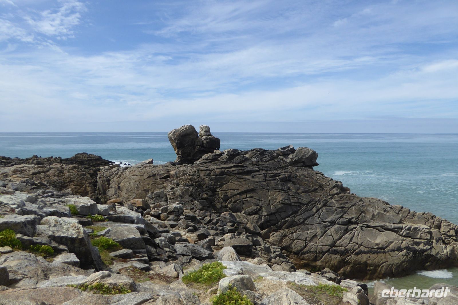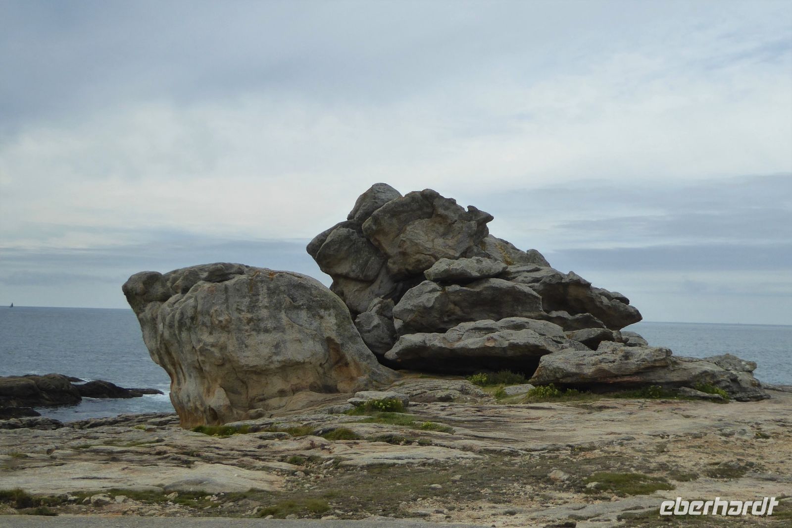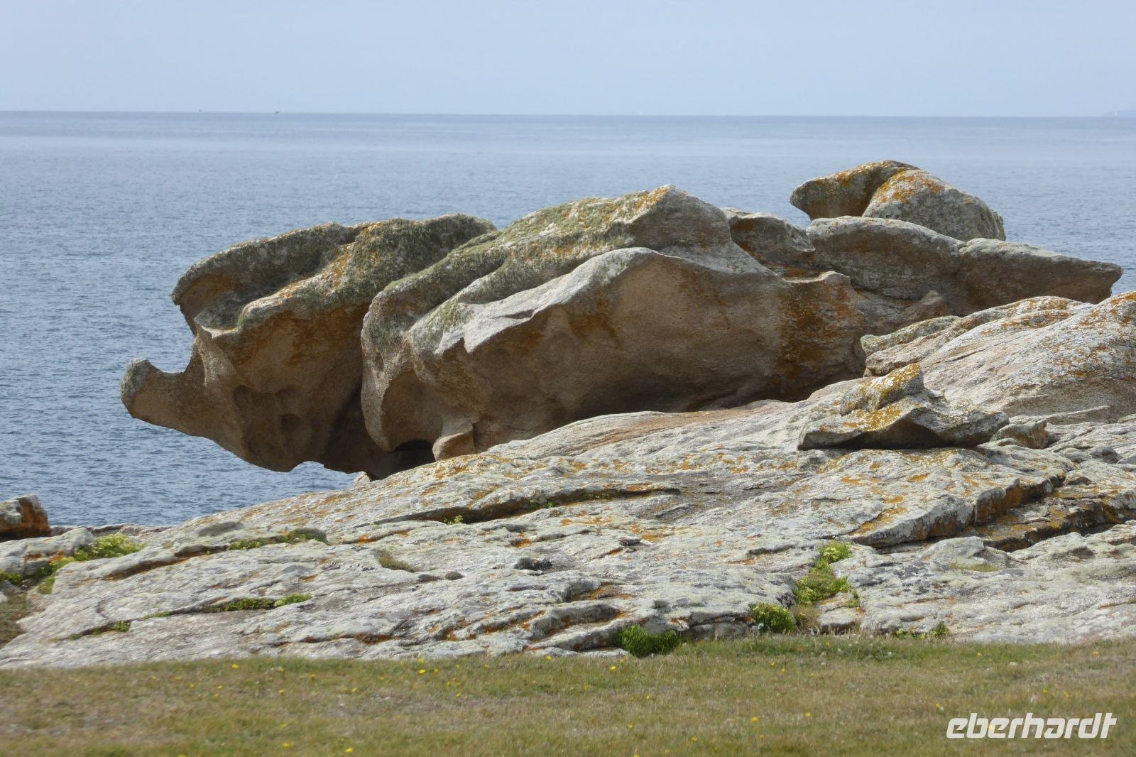 Weiter ging unsere Fahrt nach Tronoen, wo wir vor unserer Wanderung ein beeindruckendes Zeugnis der Volksfrömmigkeit, einen der ältesten Kalvarienberge der Bretagne aus dem 15. Jahrhundert, besichtigten. Danach wanderten wir zu den Dünen und entlang der herrlichen Küste barfuß über den weißen Sand der Baie d´Audierne. Wir umrundeten eine kleine Halbinsel zur Pointe de la Torche, auf der sich die Zeugnisse der Geschichte seltsam summieren: ein Dolmen und daneben eine Bunkeranlage aus dem Zweiten Weltkrieg. Bis St. Guenolé wetteifern bizarre Felsformationen, umspült von tosender Gischt im smaragdblauen Wasser um die Gunst der Betrachter. Wir genossen die Wanderung am Strand als Thalasso Therapie und erreichten am späten Nachmittag, nach zwölf gemütlich gewanderten Kilometern, den Leuchtturm von Eckmühl.