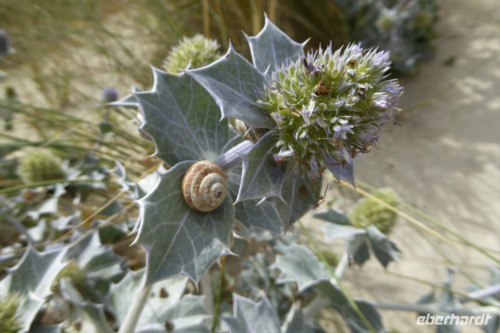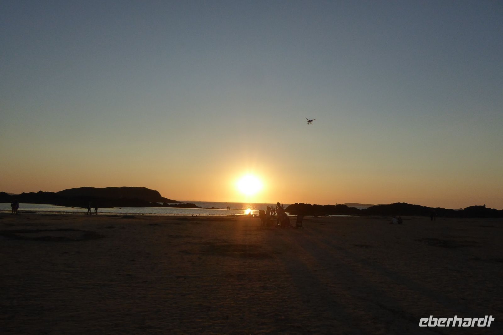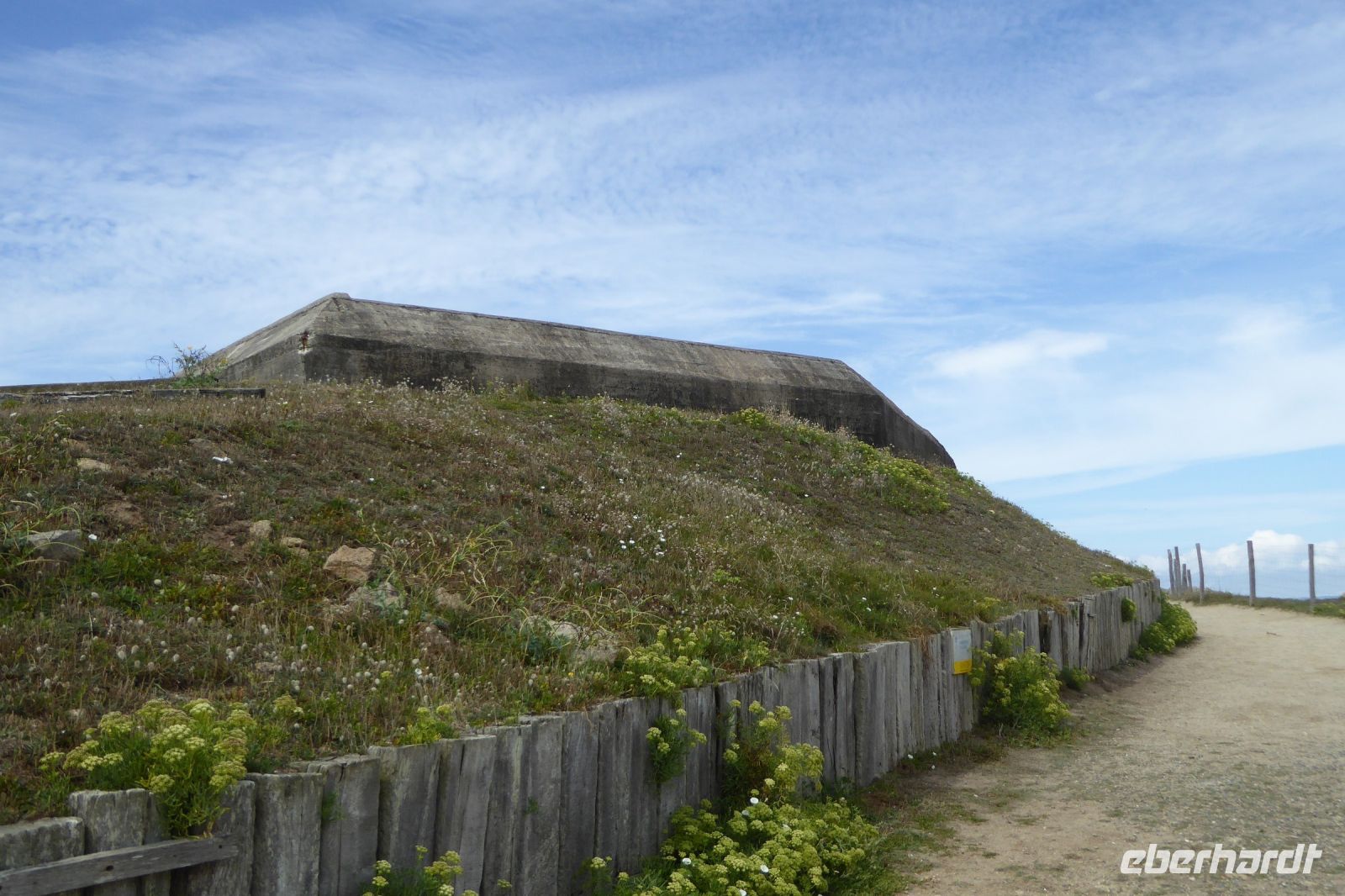 Weiter ging unsere Fahrt nach Tronoen, wo wir vor unserer Wanderung ein beeindruckendes Zeugnis der Volksfrömmigkeit, einen der ältesten Kalvarienberge der Bretagne aus dem 15. Jahrhundert, besichtigten. Danach wanderten wir zu den Dünen und entlang der herrlichen Küste barfuß über den weißen Sand der Baie d´Audierne. Wir umrundeten eine kleine Halbinsel zur Pointe de la Torche, auf der sich die Zeugnisse der Geschichte seltsam summieren: ein Dolmen und daneben eine Bunkeranlage aus dem Zweiten Weltkrieg. Bis St. Guenolé wetteifern bizarre Felsformationen, umspült von tosender Gischt im smaragdblauen Wasser um die Gunst der Betrachter. Wir genossen die Wanderung am Strand als Thalasso Therapie und erreichten am späten Nachmittag, nach zwölf gemütlich gewanderten Kilometern, den Leuchtturm von Eckmühl.