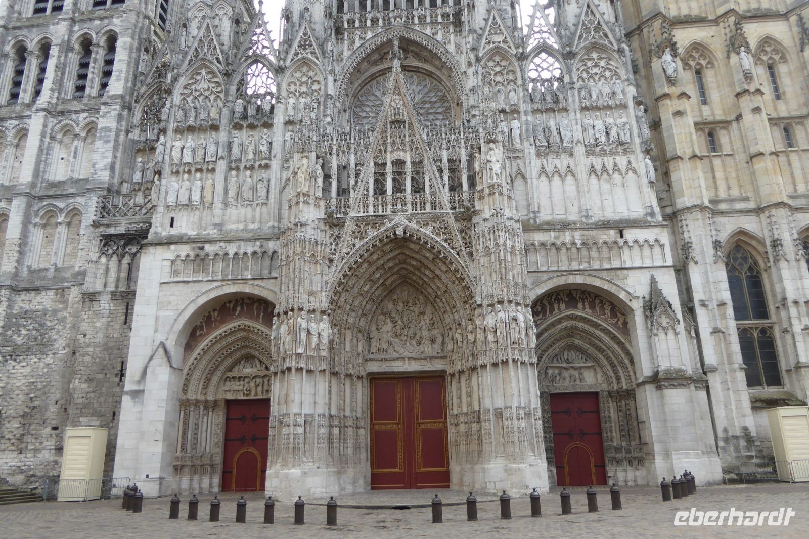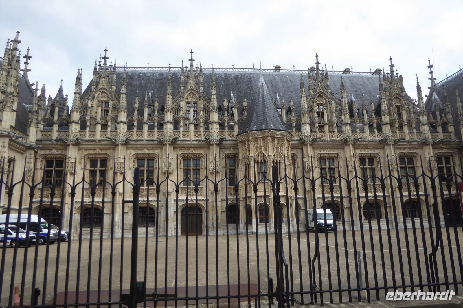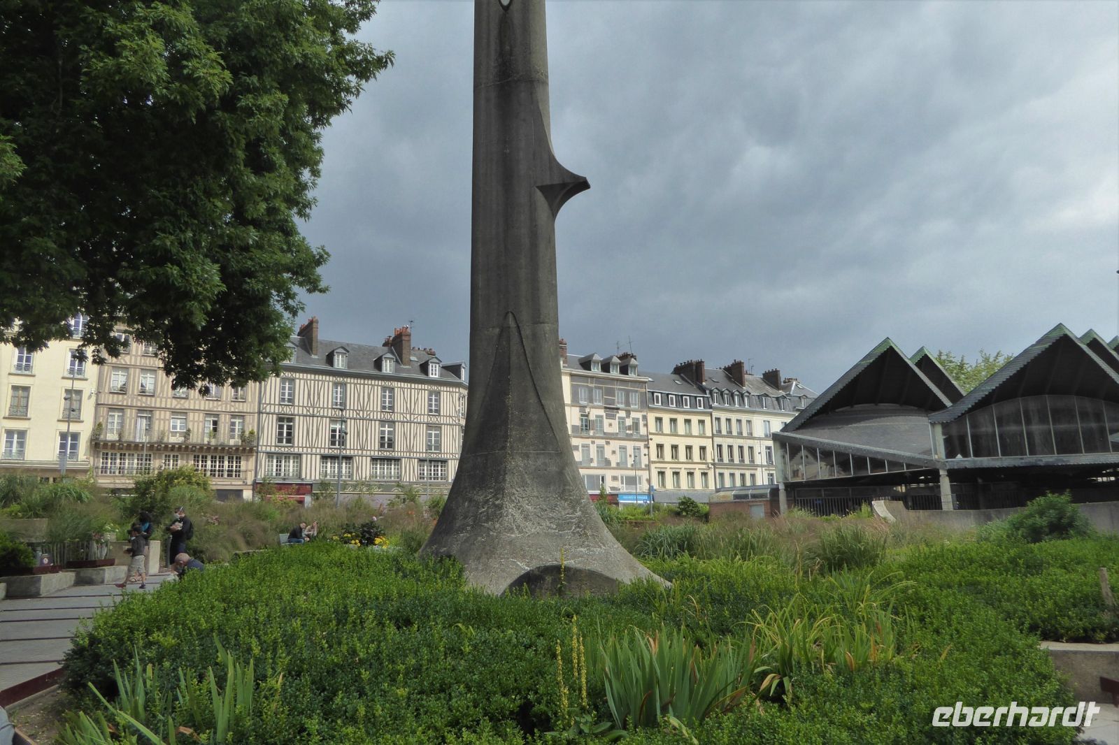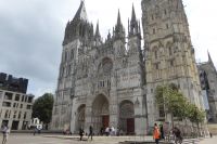 Am nächsten Morgen hieß es „Koffer packen“ und Abschied nehmen von der Bretagne, dem Meer und der Küste. Die erste Zwischenstation unserer Rückreise war die Stadt Rouen. Die Kathedrale Notre-Dame mit ihren beiden Türmen der Westfassade steht auf den Grundmauern eines romanischen Vorgängerbaus. Der Butterturm mit seinen 75 m Höhe ist eines der schönsten Beispiele für die Kunstfertigkeit der Bauleute der Hochgotik. Claude Monet war fasziniert von der Fassade und hat sie in einem Bilderzyklus von 33 Gemälden festgehalten. Natürlich haben auch wir versucht von der Stelle aus, wo seine Staffelei stand, die Kathedrale im Bild festzuhalten. Kein einfaches Unterfangen! Hinter der Kathedrale liegt der stille Kreuzgang, die Kirche St. Maclou mit dem dazugehörigen Hospital, dem Pesthof und die engen Gassen der alten Stadt. Hier wohnten Jean-Paul Sartre und Simone de Beauvoir. Nach einer kompakten Stadtführung, vorbei am Justizpalast und Uhrenturm erreichten wir den alten Markt. An dem Ort, an dem die junge Jeanne d´Arc im Jahre 1431 den Flammentod erleiden musste, steht heute eine moderne Kirche, die ihr geweiht ist.