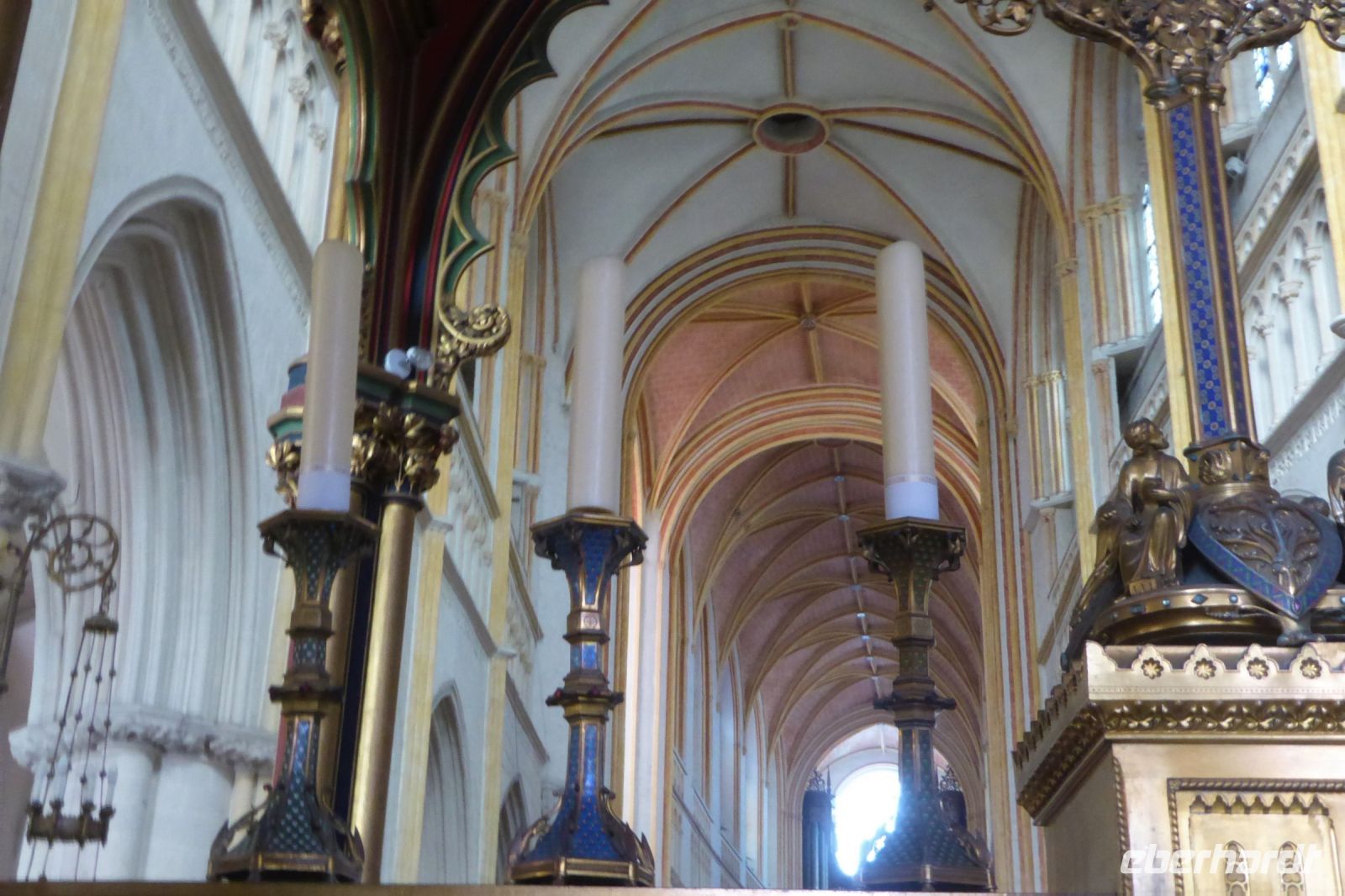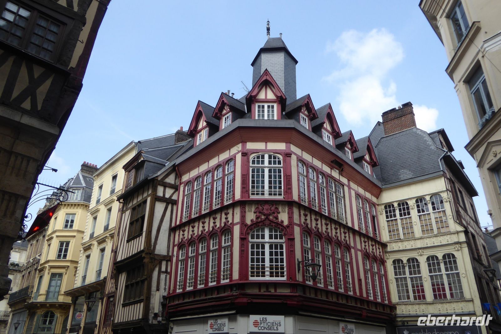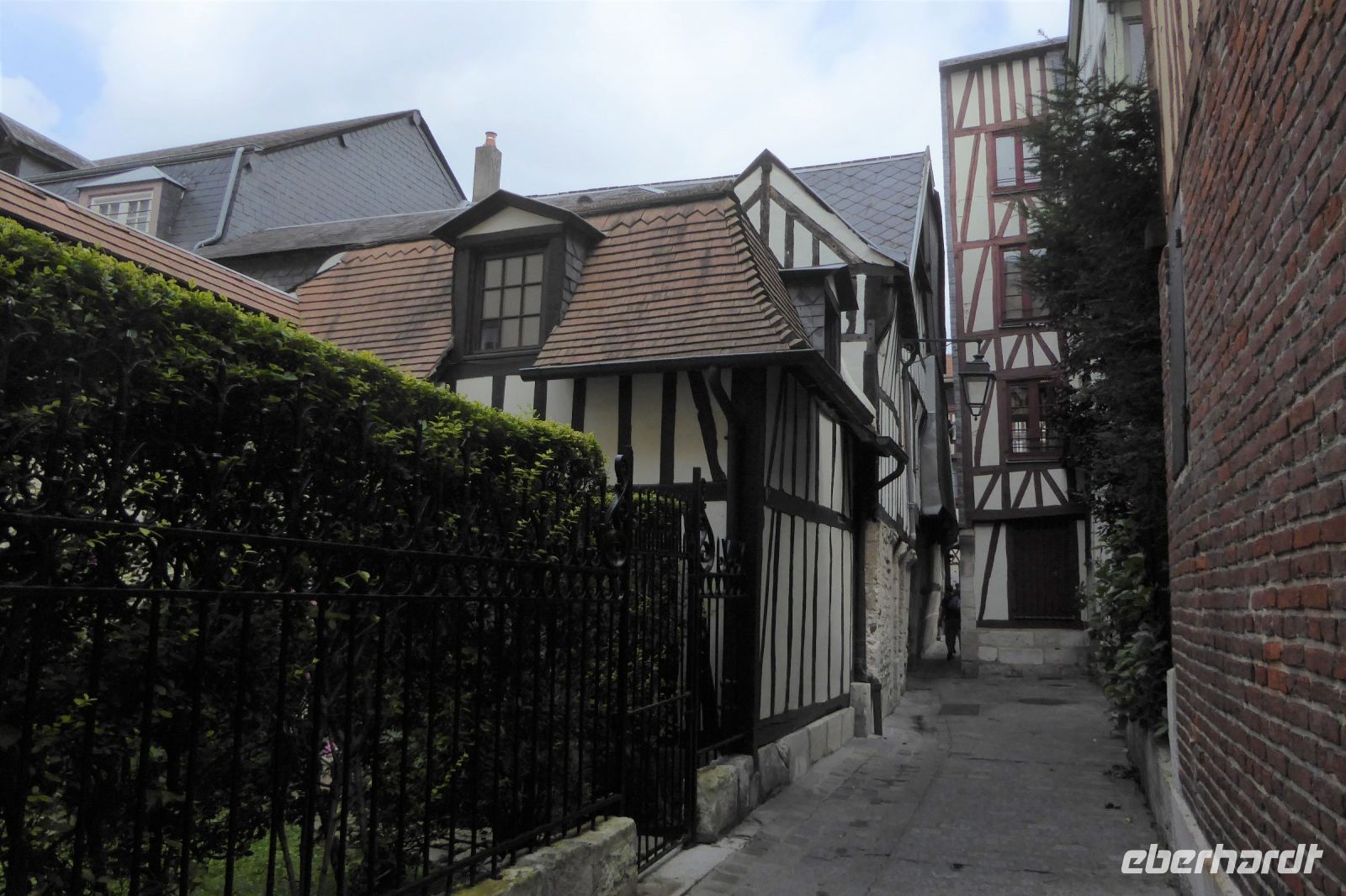 Am nächsten Morgen hieß es „Koffer packen“ und Abschied nehmen von der Bretagne, dem Meer und der Küste. Die erste Zwischenstation unserer Rückreise war die Stadt Rouen. Die Kathedrale Notre-Dame mit ihren beiden Türmen der Westfassade steht auf den Grundmauern eines romanischen Vorgängerbaus. Der Butterturm mit seinen 75 m Höhe ist eines der schönsten Beispiele für die Kunstfertigkeit der Bauleute der Hochgotik. Claude Monet war fasziniert von der Fassade und hat sie in einem Bilderzyklus von 33 Gemälden festgehalten. Natürlich haben auch wir versucht von der Stelle aus, wo seine Staffelei stand, die Kathedrale im Bild festzuhalten. Kein einfaches Unterfangen! Hinter der Kathedrale liegt der stille Kreuzgang, die Kirche St. Maclou mit dem dazugehörigen Hospital, dem Pesthof und die engen Gassen der alten Stadt. Hier wohnten Jean-Paul Sartre und Simone de Beauvoir. Nach einer kompakten Stadtführung, vorbei am Justizpalast und Uhrenturm erreichten wir den alten Markt. An dem Ort, an dem die junge Jeanne d´Arc im Jahre 1431 den Flammentod erleiden musste, steht heute eine moderne Kirche, die ihr geweiht ist.