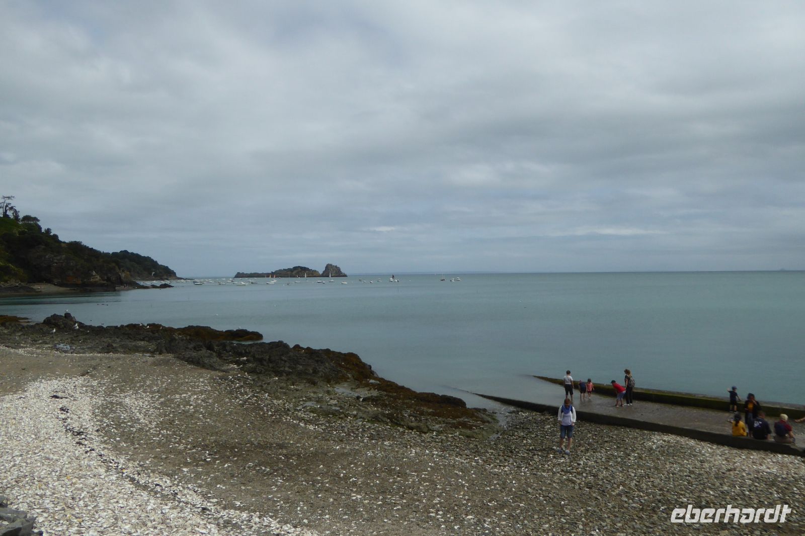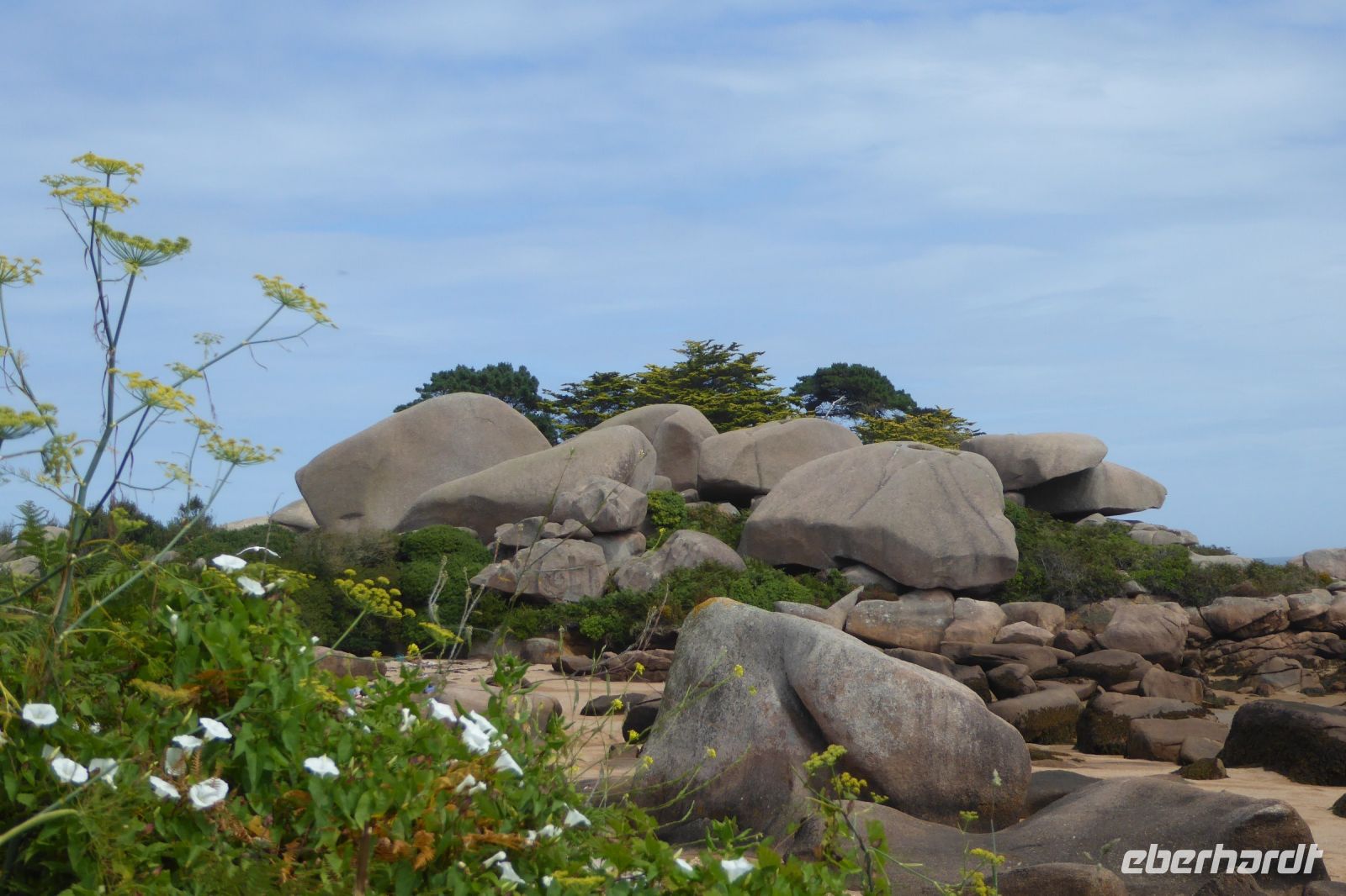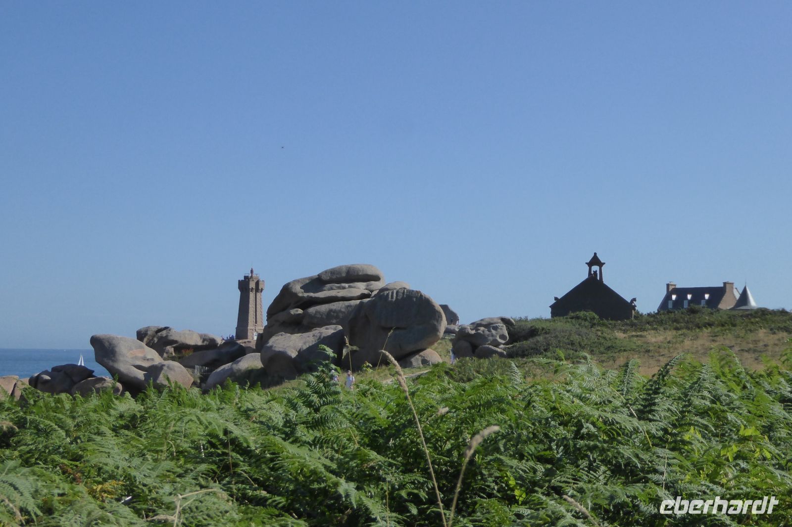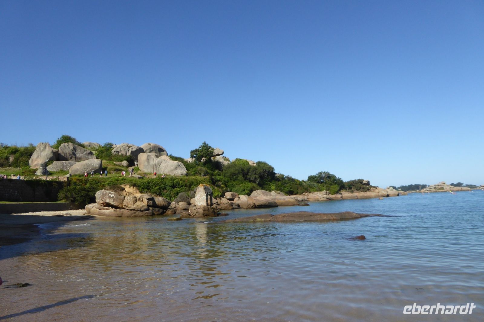 Heute stand die Wanderung zu dem vielleicht schönsten Abschnitt unserer Reise auf dem Programm. Bei wunderschönem Wetter und angenehmen Temperaturen starteten wir unsere Wanderung an der Wassermühle am Eingang des Traouiero Tales. Gleich hinter dem kleinen Stausee geht es in das Tal, wo sich große Steinbrüche befinden. Im sechsten Band der Romane um Kommissar Dupin, Bretonisches Leuchten, ist dort der Schauplatz der Geschichte. Für uns beginnt hier der geologisch interessanteste Teil der Route vor 300 Millionen Jahren sind diese Steine entstanden, die wie von Riesenhand geworfen, bizarre Formationen bilden. Der Interpretation dieser Gebilde sind keine Grenzen gesetzt. Wir gingen über den alten Zöllner- und Schmugglerpfad, der uns immer wieder herrliche Ausblicke auf das Meer und die vorgelagerten Inseln bot. In der Bucht von Ploumenac´h steht mitten im Wasser ein kleines Oratorium mit der Statue des Heiligen Guirec. Die alte hölzerne Statue wurde längst ausgetauscht in eine aus massiven Stein, denn die heiratswilligen Mädchen früherer Zeiten glaubten fest daran, dass eine Nadel in die Nase des Heiligen gestochen, ihnen einen passenden Ehemann bescheren möge. Kurze Zeit später erreichten wir den Leuchtturm von Men Ruz. Nach einer kleinen Pause entschieden wir uns, die folgenden drei Wanderkilometer, die sanft den Weg hinunter zum Strand von Trestraou führen, individuell zu gehen. So konnte jeder nach seinem Tempo und seinen Interessen seine Zeit einteilen und den Weg für sich genießen. Der weiße Sandstrand und die Wellen luden besonders Wagemutige zu einem erfrischenden Bad im 17° warmen Wasser des Atlantiks ein.