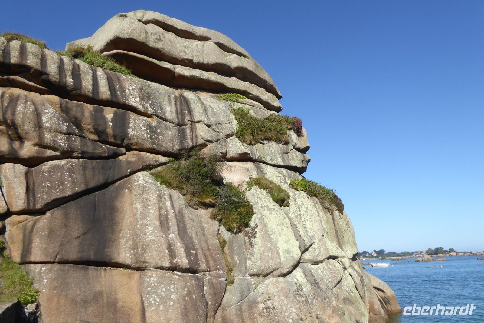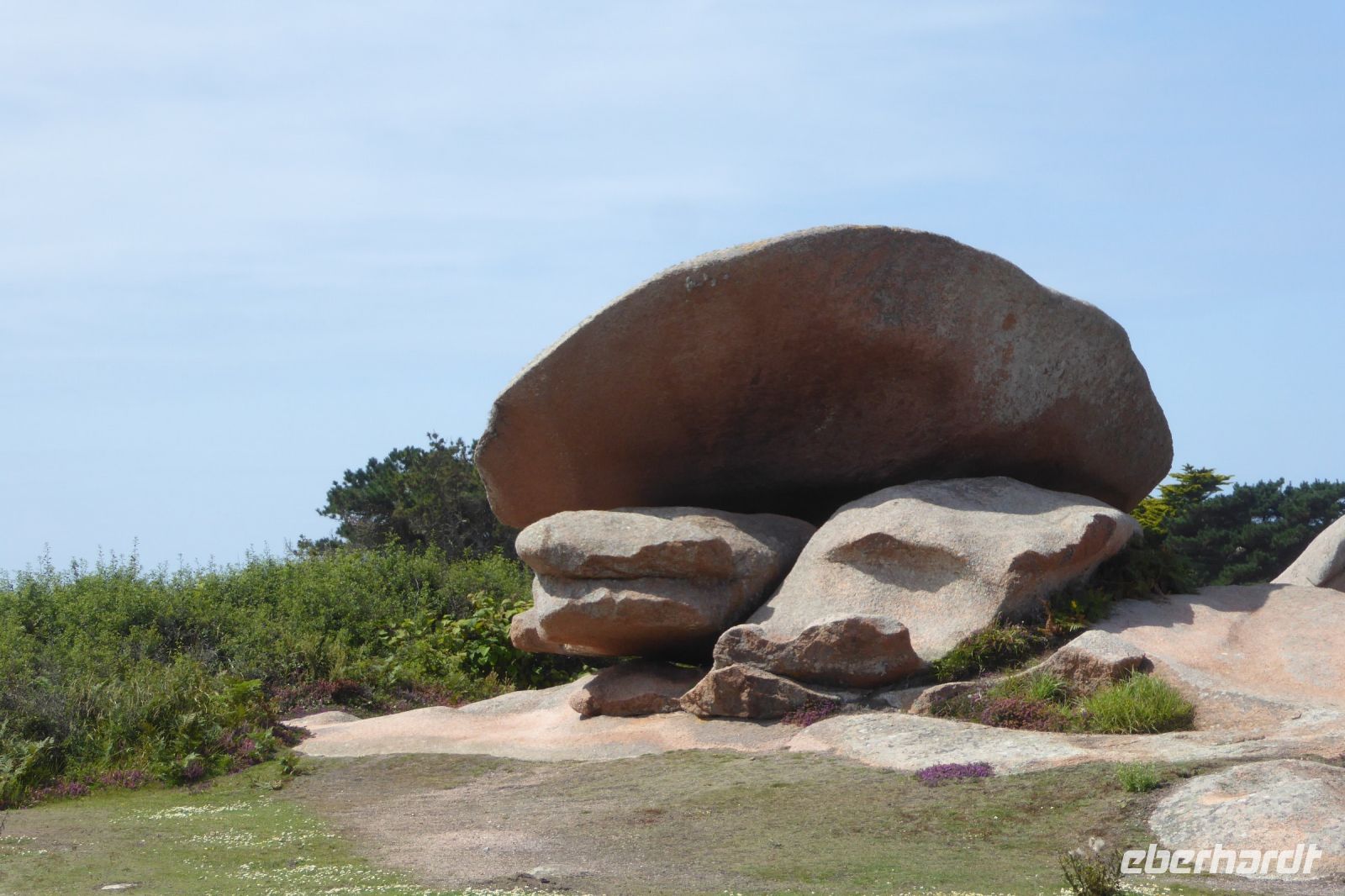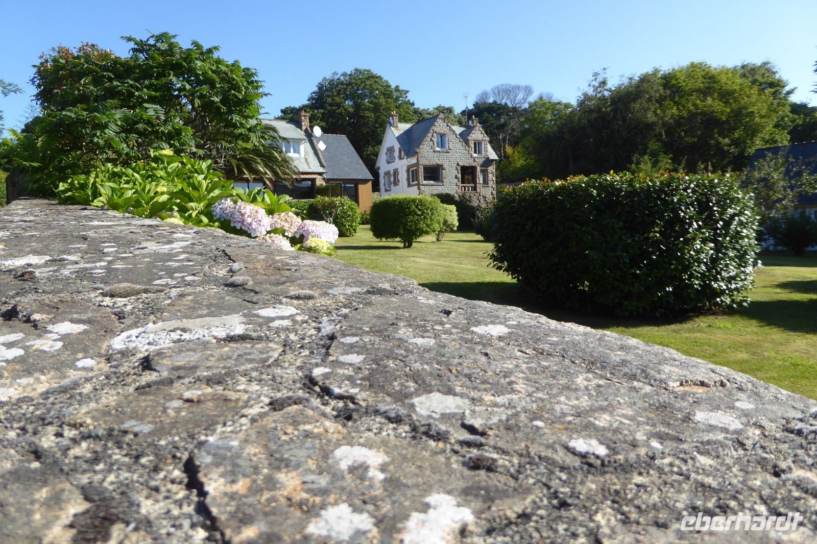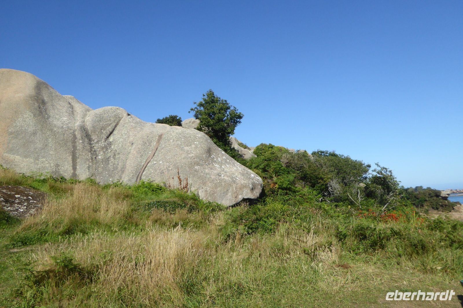 Heute stand die Wanderung zu dem vielleicht schönsten Abschnitt unserer Reise auf dem Programm. Bei wunderschönem Wetter und angenehmen Temperaturen starteten wir unsere Wanderung an der Wassermühle am Eingang des Traouiero Tales. Gleich hinter dem kleinen Stausee geht es in das Tal, wo sich große Steinbrüche befinden. Im sechsten Band der Romane um Kommissar Dupin, Bretonisches Leuchten, ist dort der Schauplatz der Geschichte. Für uns beginnt hier der geologisch interessanteste Teil der Route vor 300 Millionen Jahren sind diese Steine entstanden, die wie von Riesenhand geworfen, bizarre Formationen bilden. Der Interpretation dieser Gebilde sind keine Grenzen gesetzt. Wir gingen über den alten Zöllner- und Schmugglerpfad, der uns immer wieder herrliche Ausblicke auf das Meer und die vorgelagerten Inseln bot. In der Bucht von Ploumenac´h steht mitten im Wasser ein kleines Oratorium mit der Statue des Heiligen Guirec. Die alte hölzerne Statue wurde längst ausgetauscht in eine aus massiven Stein, denn die heiratswilligen Mädchen früherer Zeiten glaubten fest daran, dass eine Nadel in die Nase des Heiligen gestochen, ihnen einen passenden Ehemann bescheren möge. Kurze Zeit später erreichten wir den Leuchtturm von Men Ruz. Nach einer kleinen Pause entschieden wir uns, die folgenden drei Wanderkilometer, die sanft den Weg hinunter zum Strand von Trestraou führen, individuell zu gehen. So konnte jeder nach seinem Tempo und seinen Interessen seine Zeit einteilen und den Weg für sich genießen. Der weiße Sandstrand und die Wellen luden besonders Wagemutige zu einem erfrischenden Bad im 17° warmen Wasser des Atlantiks ein.