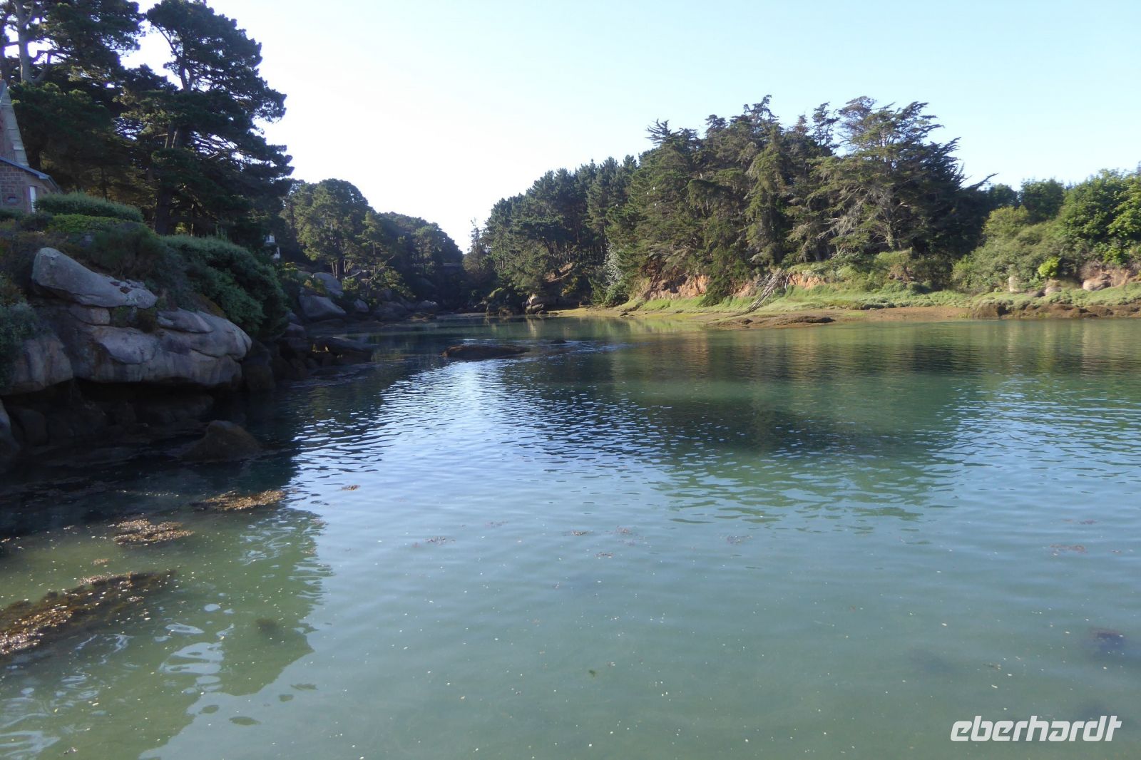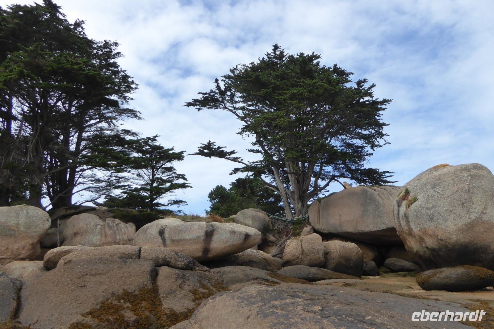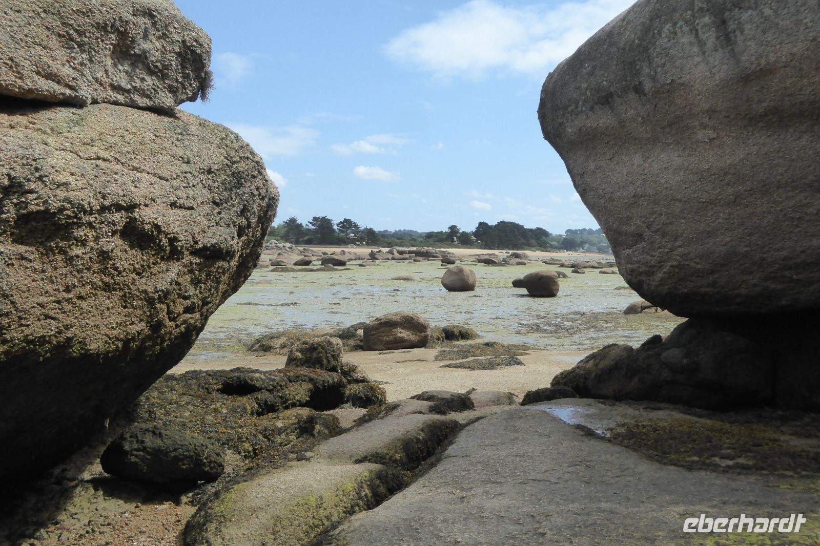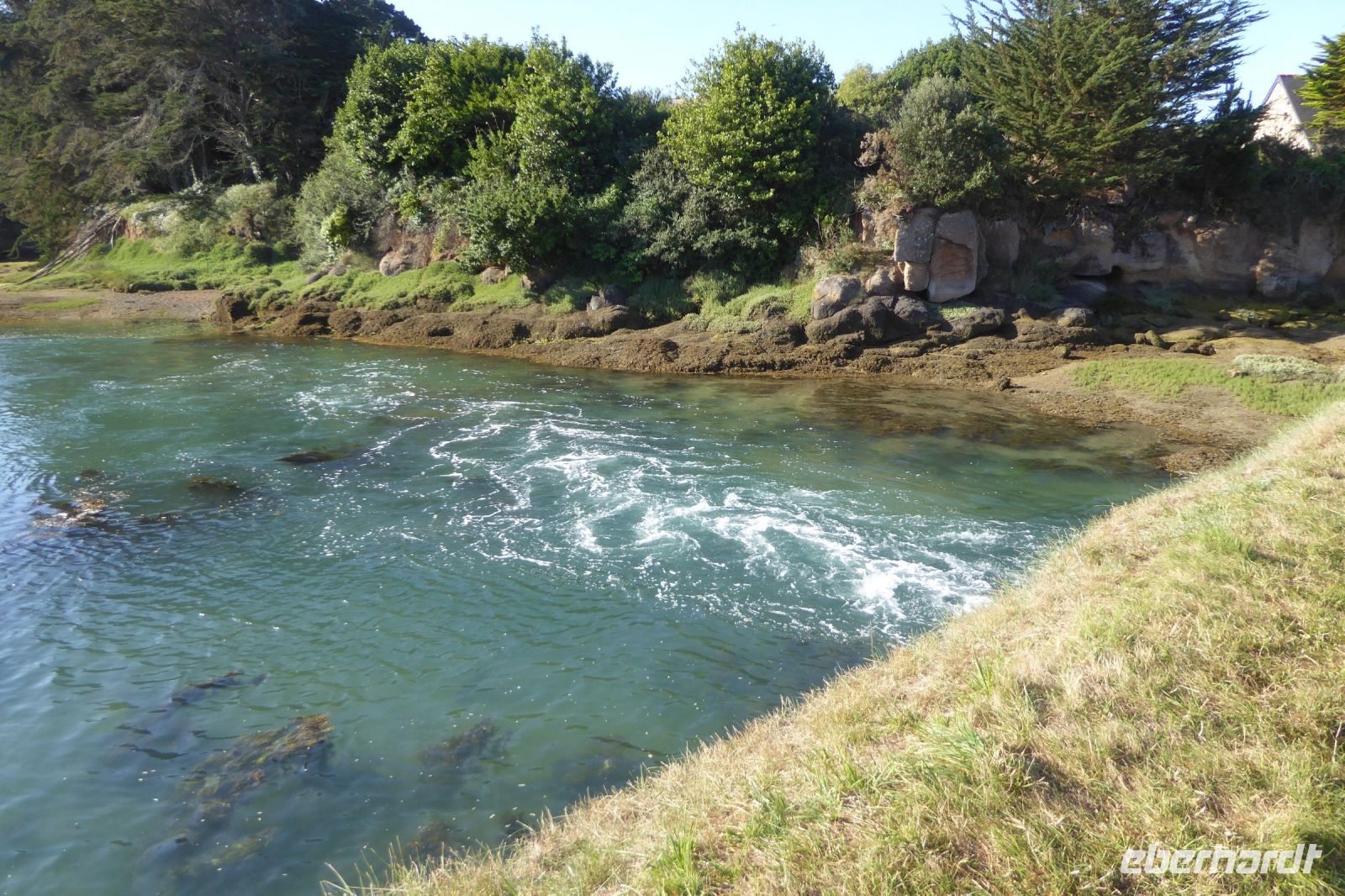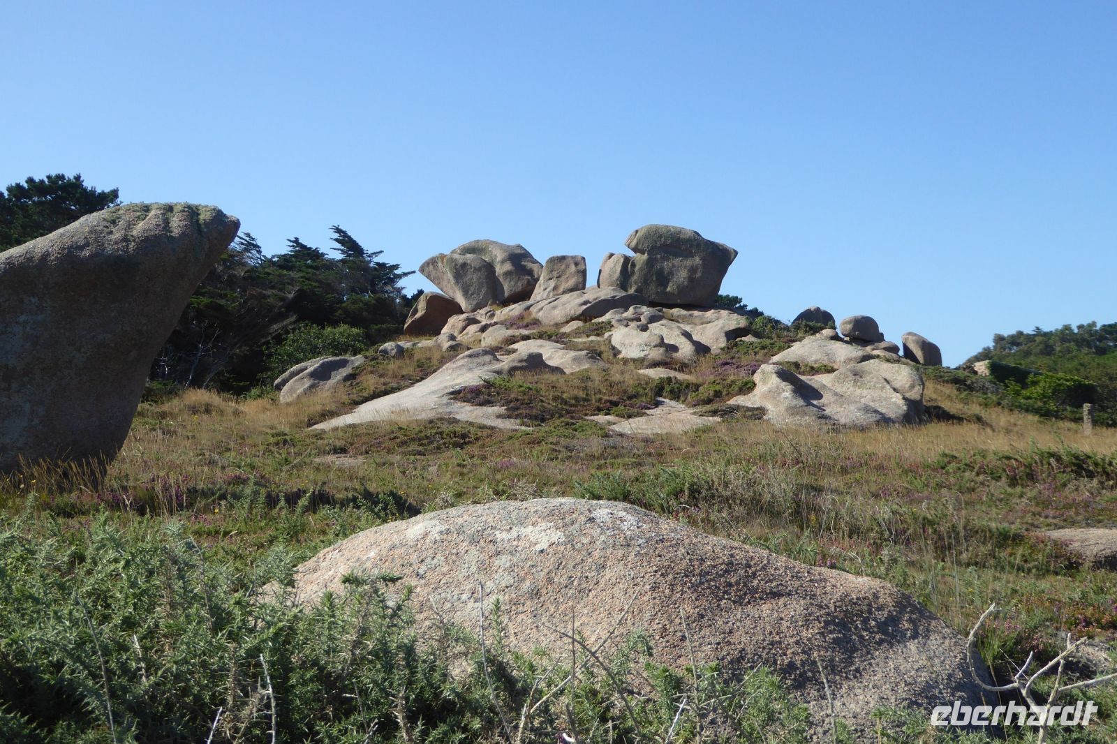 Heute stand die Wanderung zu dem vielleicht schönsten Abschnitt unserer Reise auf dem Programm. Bei wunderschönem Wetter und angenehmen Temperaturen starteten wir unsere Wanderung an der Wassermühle am Eingang des Traouiero Tales. Gleich hinter dem kleinen Stausee geht es in das Tal, wo sich große Steinbrüche befinden. Im sechsten Band der Romane um Kommissar Dupin, Bretonisches Leuchten, ist dort der Schauplatz der Geschichte. Für uns beginnt hier der geologisch interessanteste Teil der Route vor 300 Millionen Jahren sind diese Steine entstanden, die wie von Riesenhand geworfen, bizarre Formationen bilden. Der Interpretation dieser Gebilde sind keine Grenzen gesetzt. Wir gingen über den alten Zöllner- und Schmugglerpfad, der uns immer wieder herrliche Ausblicke auf das Meer und die vorgelagerten Inseln bot. In der Bucht von Ploumenac´h steht mitten im Wasser ein kleines Oratorium mit der Statue des Heiligen Guirec. Die alte hölzerne Statue wurde längst ausgetauscht in eine aus massiven Stein, denn die heiratswilligen Mädchen früherer Zeiten glaubten fest daran, dass eine Nadel in die Nase des Heiligen gestochen, ihnen einen passenden Ehemann bescheren möge. Kurze Zeit später erreichten wir den Leuchtturm von Men Ruz. Nach einer kleinen Pause entschieden wir uns, die folgenden drei Wanderkilometer, die sanft den Weg hinunter zum Strand von Trestraou führen, individuell zu gehen. So konnte jeder nach seinem Tempo und seinen Interessen seine Zeit einteilen und den Weg für sich genießen. Der weiße Sandstrand und die Wellen luden besonders Wagemutige zu einem erfrischenden Bad im 17° warmen Wasser des Atlantiks ein.